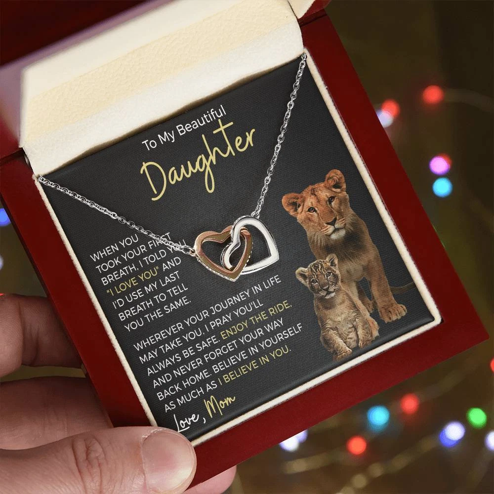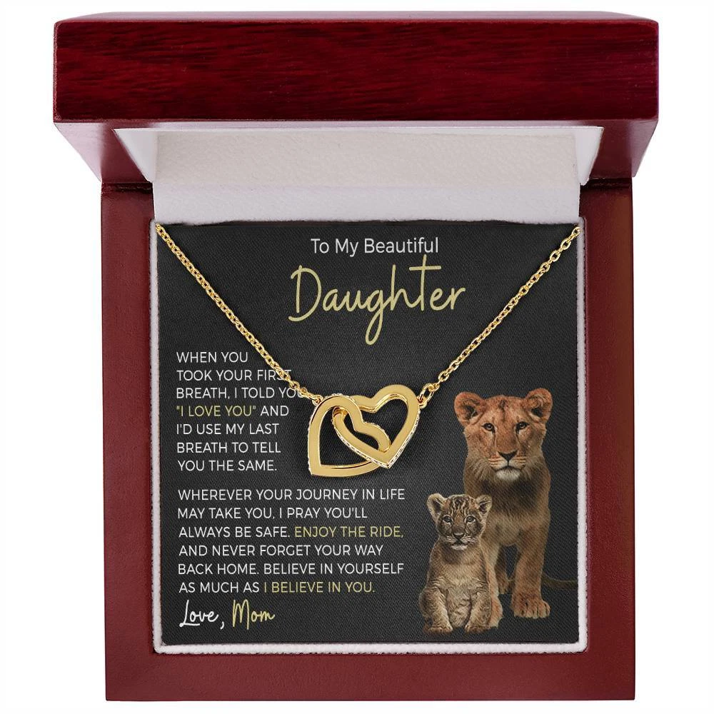 To My Daughter When you took your first breath I told you I love you and I'd use my last breath to tell you the same. Wherever your journey in life may take you I pray you''ll always be safe. Enjoy the ride and always remember your way back home. Love Mom Give her the your daughter the gift that represents your never-ending love. Featuring two lovely hearts embellished with cubic zirconia crystals, this Interlocking Hearts necklace is the perfect accessory for everyday wear. Whether it's a memorable anniversary or a special birthday, make sure to dazzle your special someone by gifting them this stunning necklace. Two heart pendants embellished with CZ crystals High quality polished surgical steel and rose gold finish or 18k yellow gold finish Pendant dimensions: 0.6" (1.5cm) height / 1.1" (2.8cm) width Adjustable length: 18" - 22" (45.72 cm - 55.88 cm) Lobster clasp Your piece is lovingly packaged in a complimentary soft touch box for easy gifting. Elevate your presentation by upgrading to the mahogany style luxury box, which features a brilliant LED spotlight that illuminates as your daughter opens the gift box.