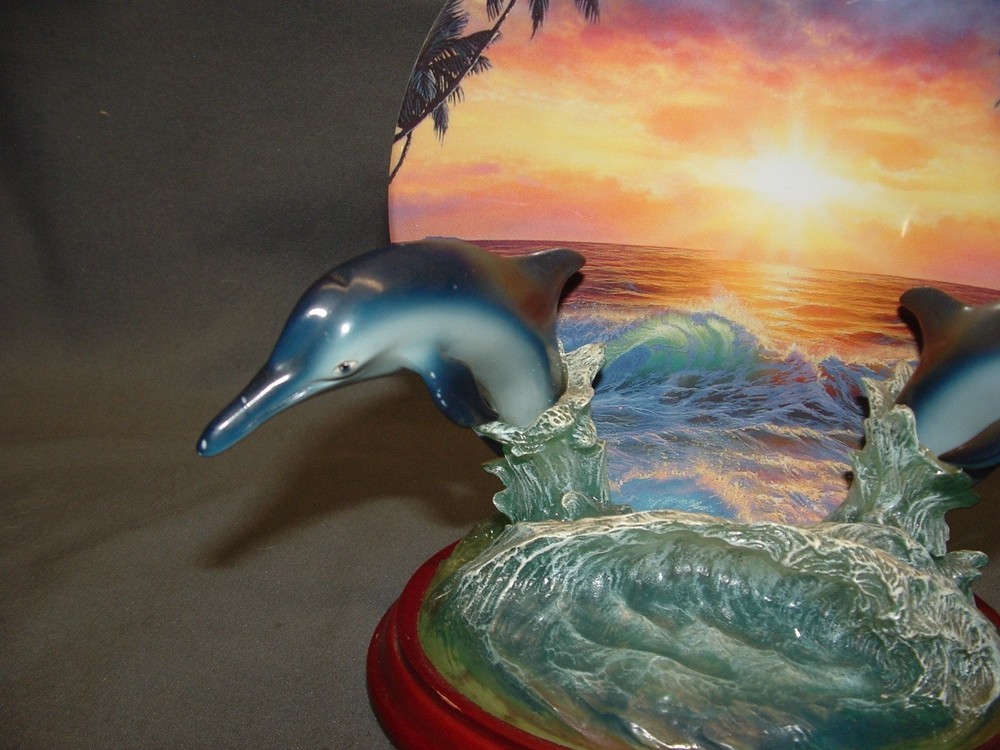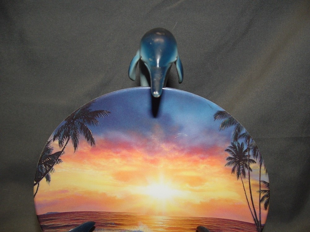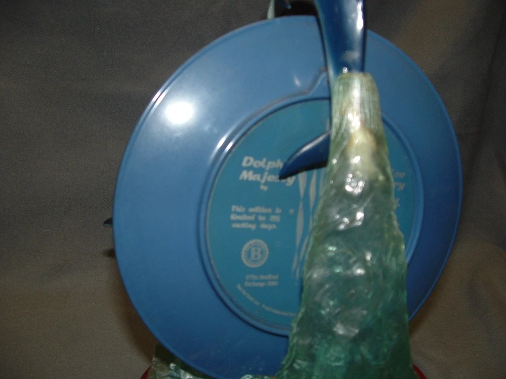 The Collectible Bradford Exchange Plate "Dolphin Majesty" 2000 By Lassen #17104 is a decorative collector's item featuring a dolphin print in vibrant multicolor. This round plate, measuring 6.25 inches in diameter, is a part of the Bradford Exchange franchise and Lassen International product line. Produced in the 21st century, this pottery item is handcrafted in the United States, making it a unique and stylish addition to any collection or decor. The stand included with the plate allows for easy display on any occasion.