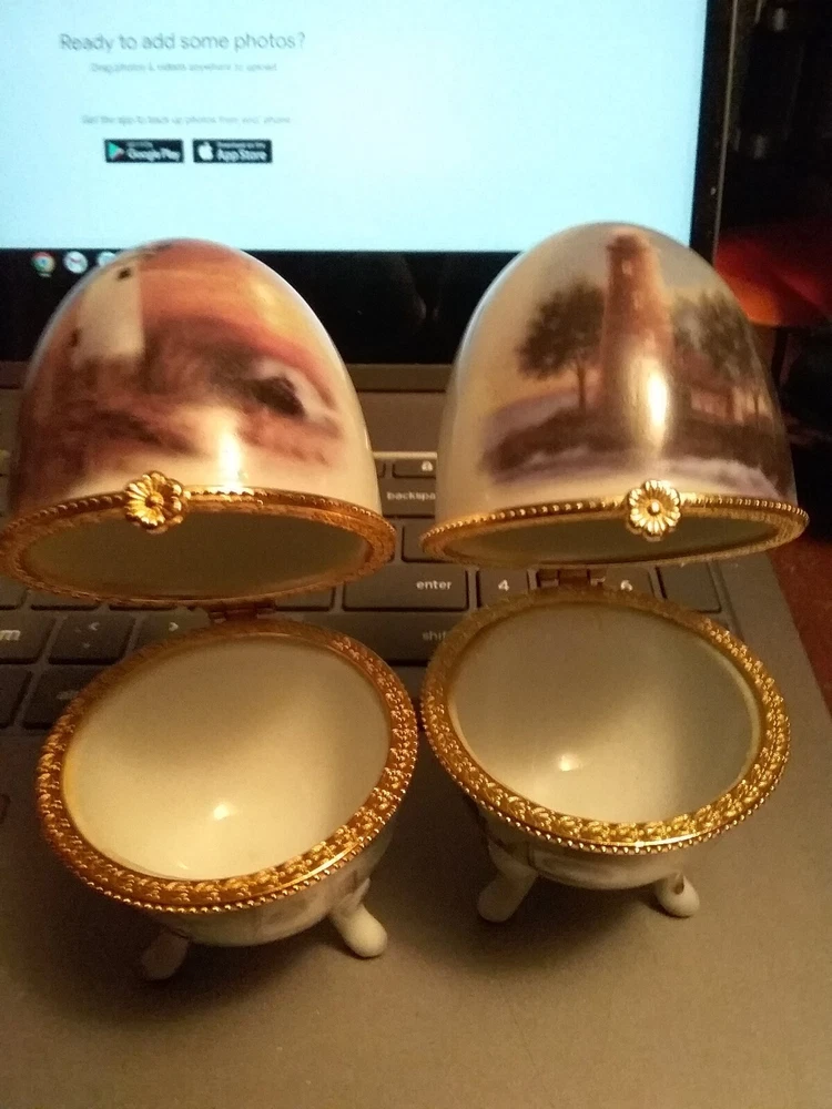2 ceramic hinged ceramic egg trinket boxes light houses I combine shipping