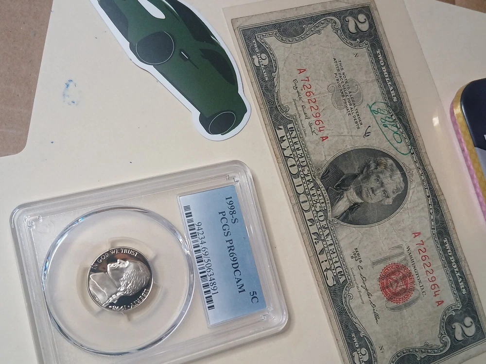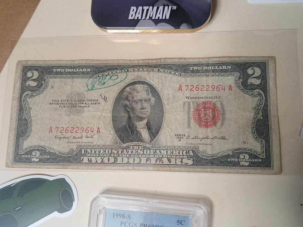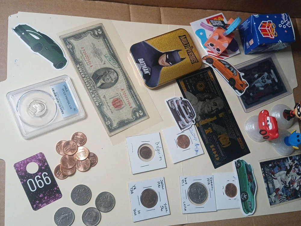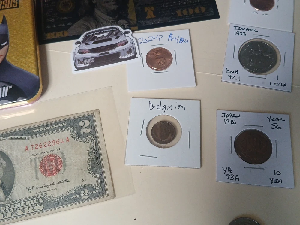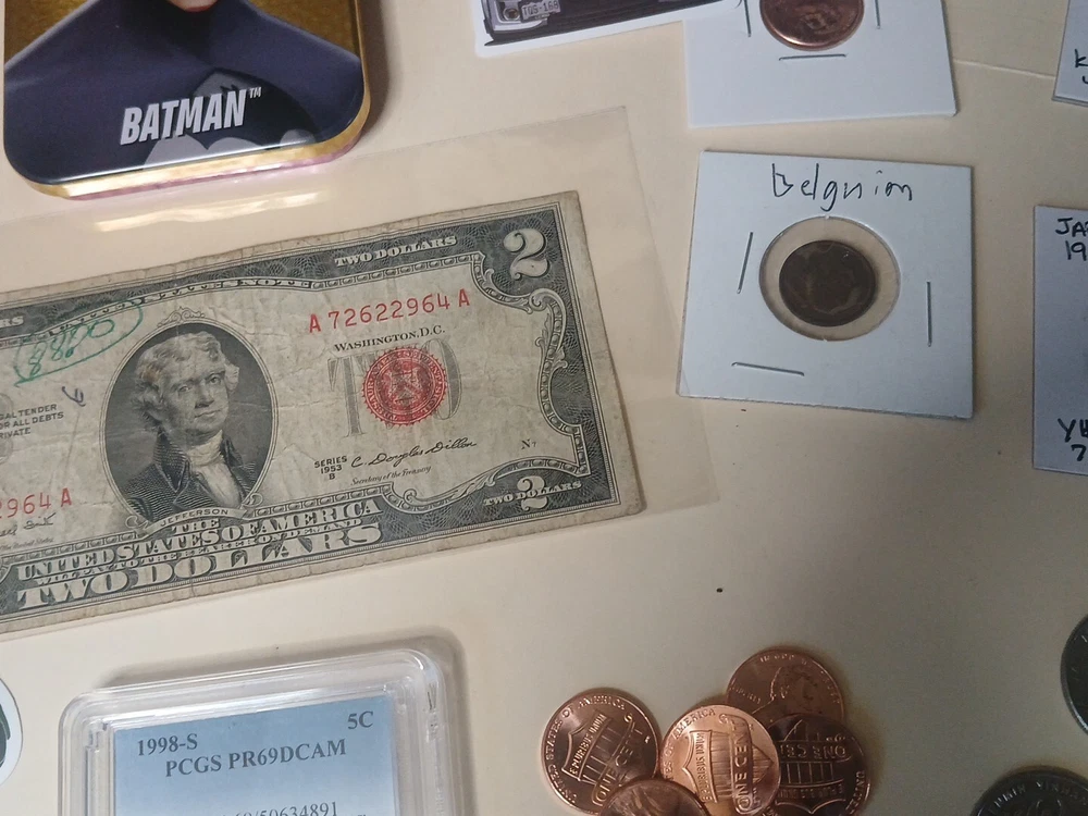 Lot#66 has coins from around the world including 1998s Nickle $2 bill red seal A72622964A series 1953B circulated and more