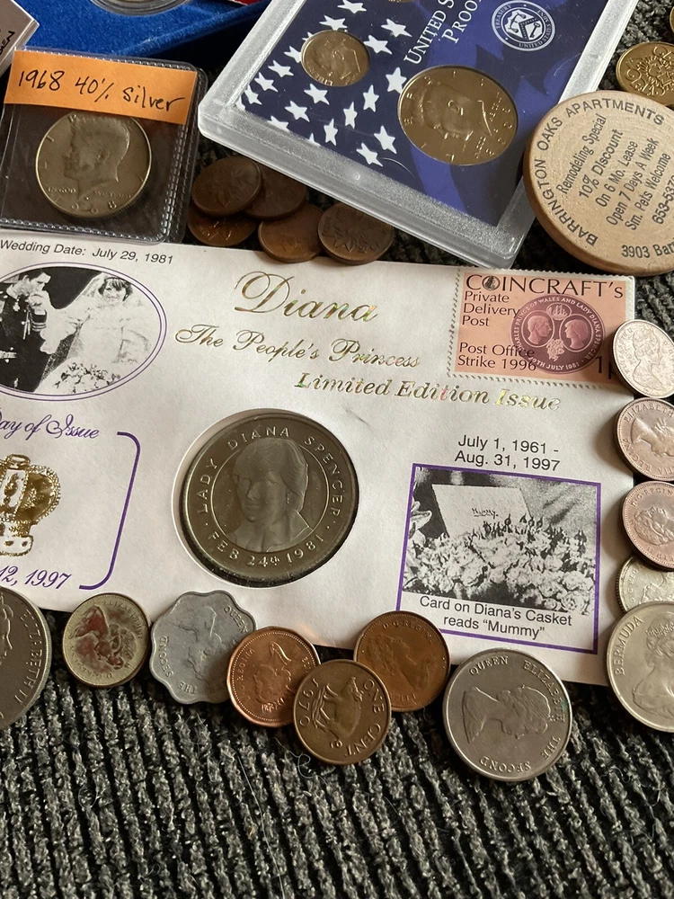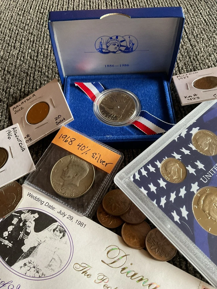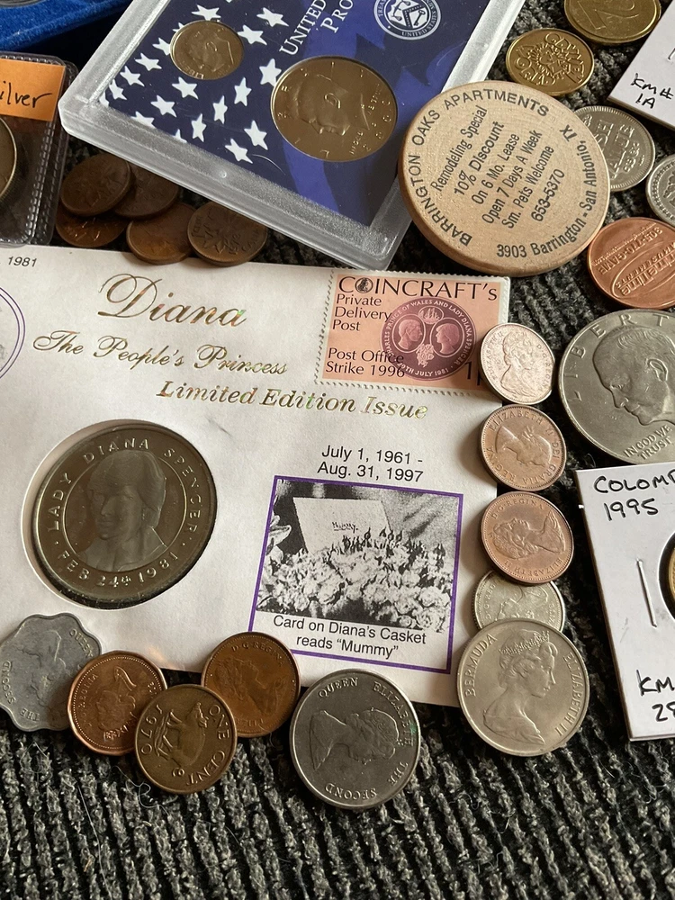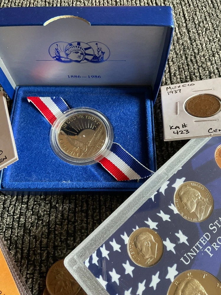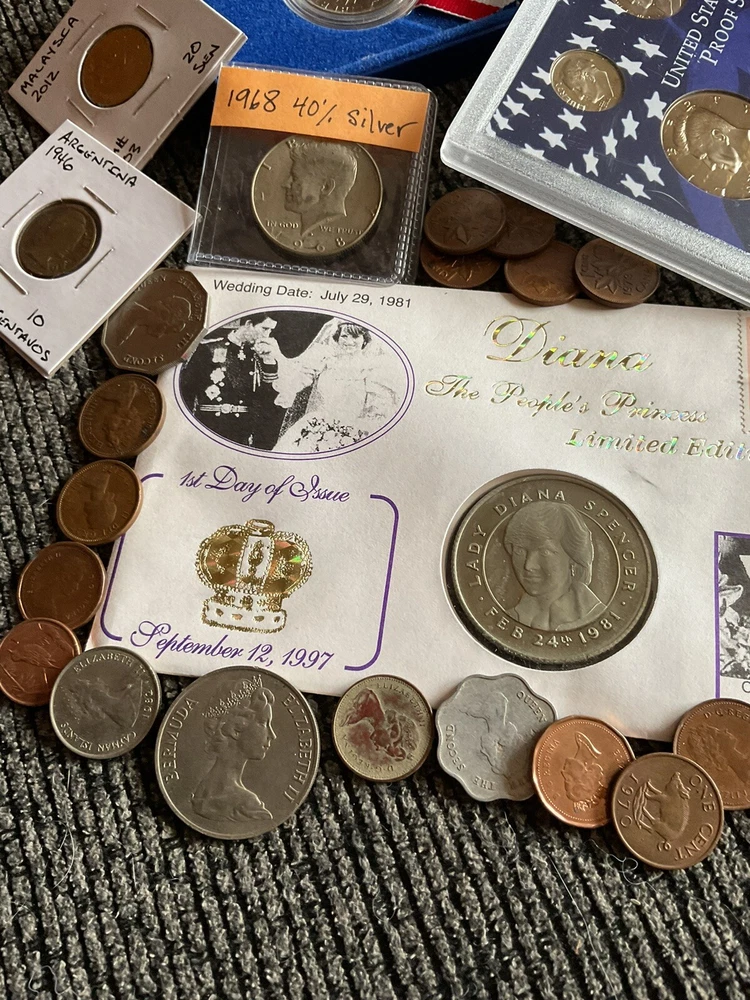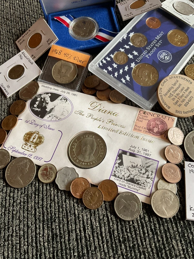 So many beautiful things in this one I don’t know where to begin a beautiful commemorative envelope with stamp, Diana and Charles, the peoples princess limited edition issue with a commemorative coin. Lady liberty 1986 commemorative coin in its original box, 1968 JFK silver, 2000 S United States mint proof set with Sacajawea and much more.