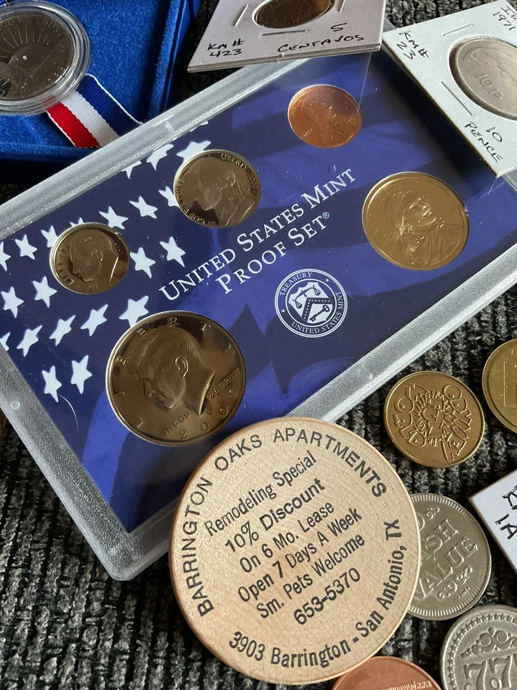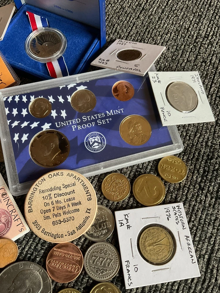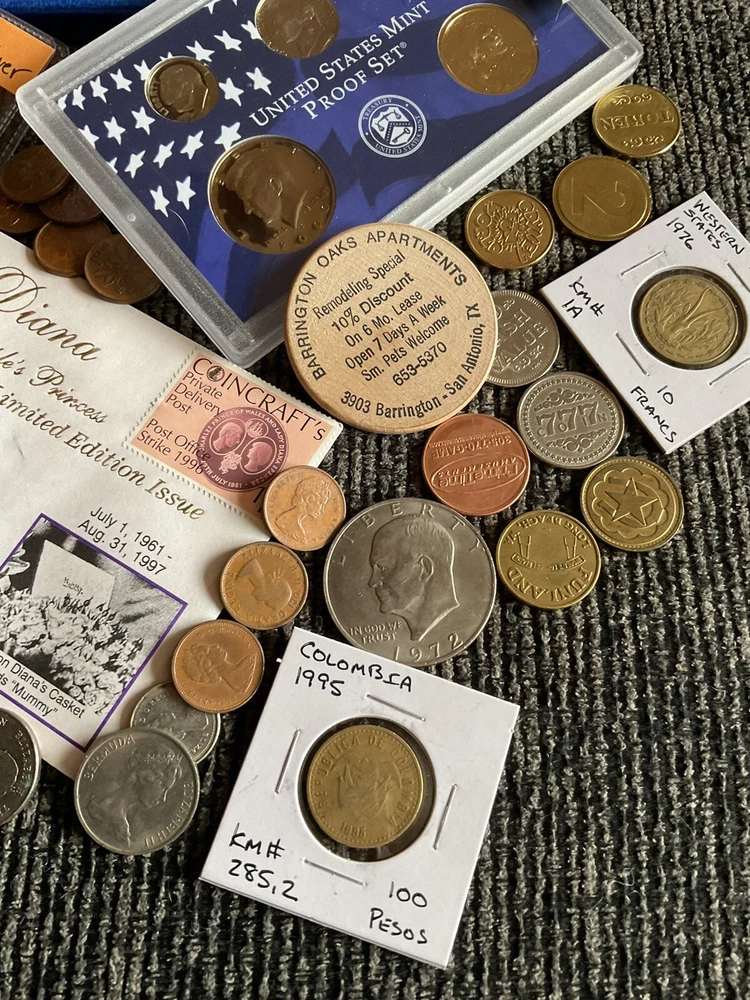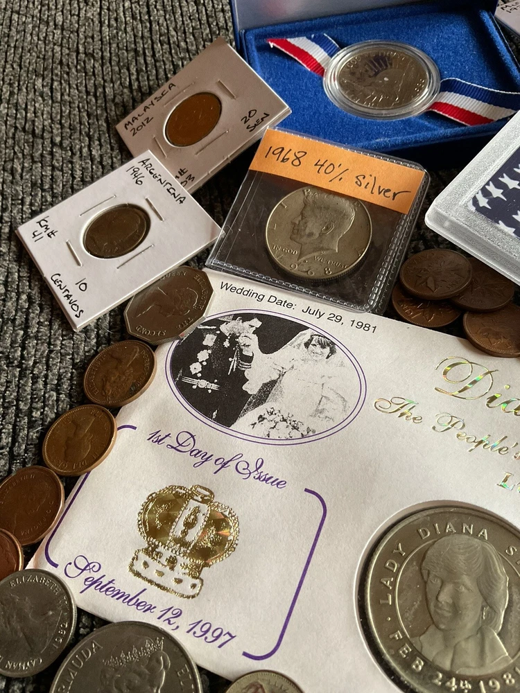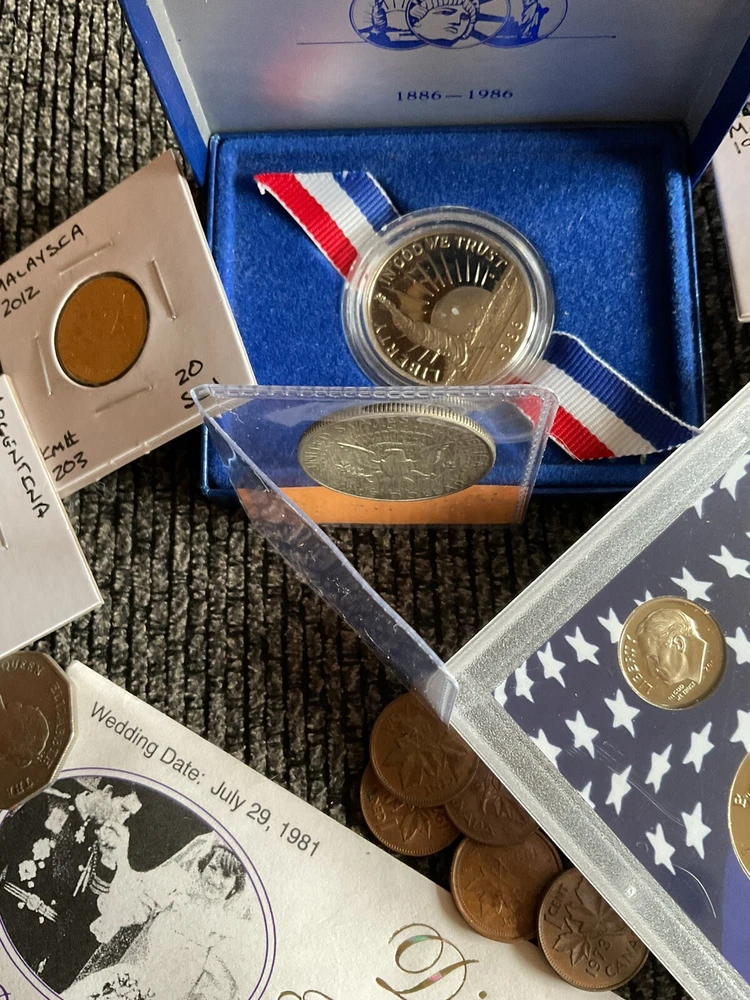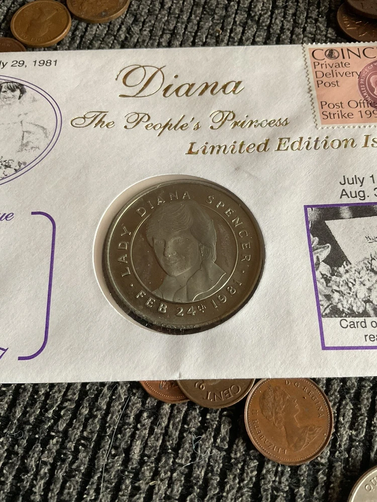 So many beautiful things in this one I don’t know where to begin a beautiful commemorative envelope with stamp, Diana and Charles, the peoples princess limited edition issue with a commemorative coin. Lady liberty 1986 commemorative coin in its original box, 1968 JFK silver, 2000 S United States mint proof set with Sacajawea and much more.