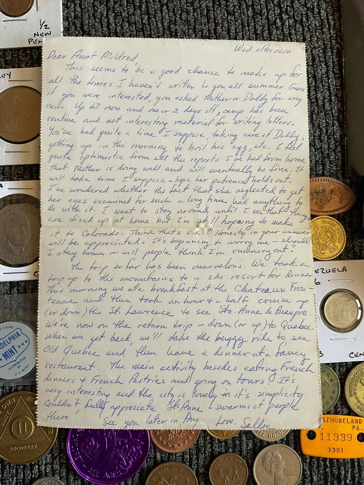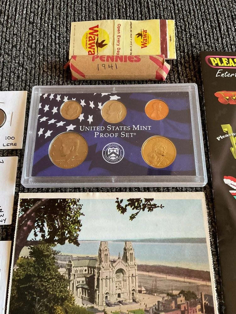 Beautiful lot 2001 S United States mint proof set with Sacajawea, 1957 FDR silver dime, one roll of wheat pennies all 1941 that is 50 pennies total. Beautiful handwritten postcard dated 1955. and so much more in this lot.