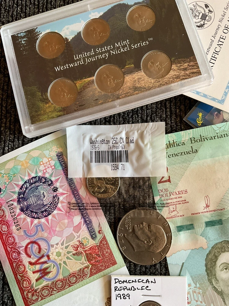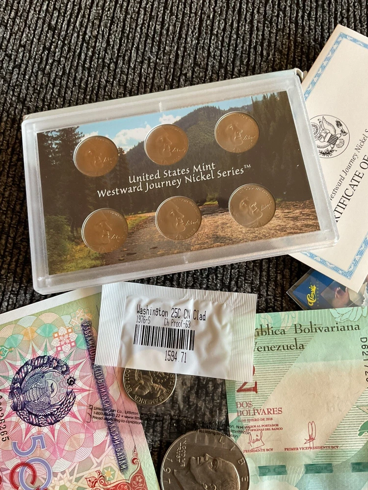Great lot 2005 US mint Westward Journey nickel series P,D,S. IT’S A BEAUTIFUL COLLECTIBLE. 1976S proof Washington quarter in cello. Currency coins and stamps great for any collector.
