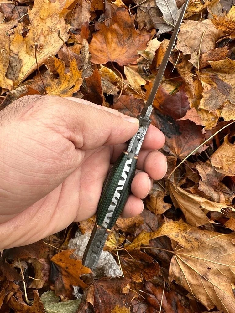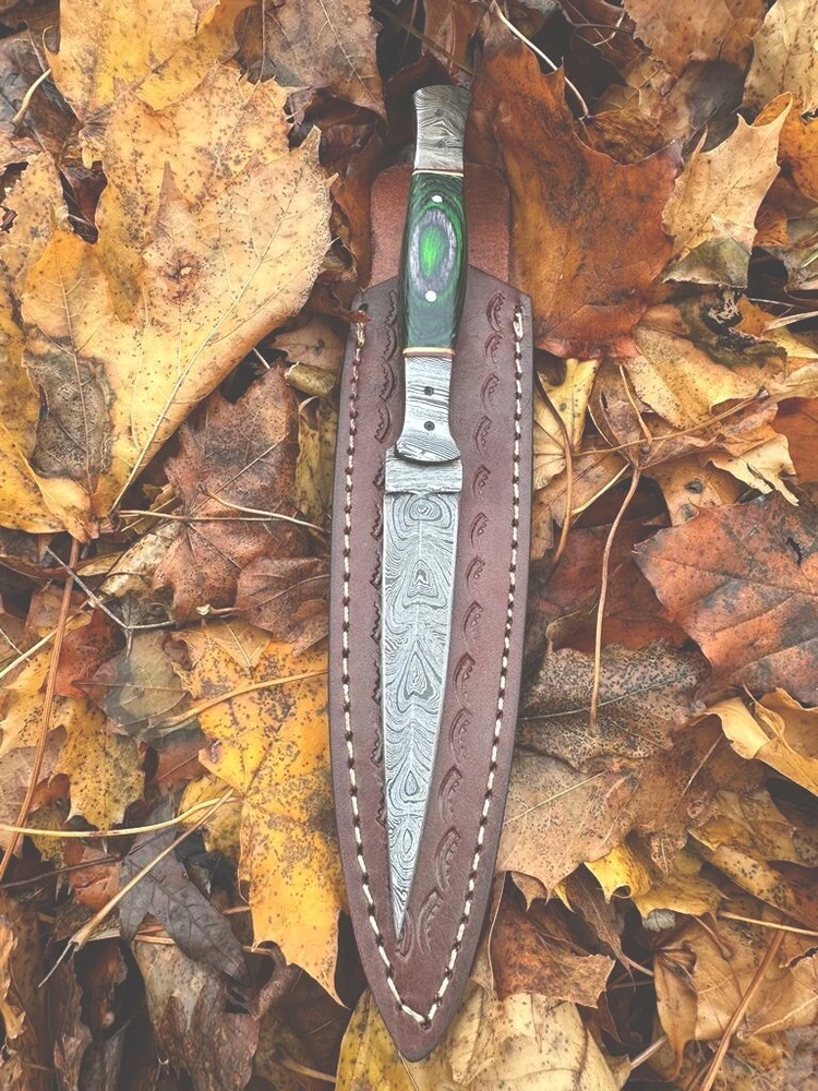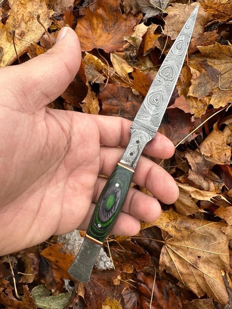 This collectible military combat dagger is a must-have for any knife enthusiast. With a full tang and needle point blade made of Damascus steel, this knife is both durable and sharp. The handle is crafted from wood and features a green and black color scheme. Overall length: 8.5” inch Blade : 4” inch Handle : 4.5” inch With Genuine leather sheath This knife is versatile, with applications in hunting, combat, throwing, boot, survival, and more. It comes with a sheath for safe and easy storage and transport. Handmade in the United States, this original piece is a unique addition to any collection.