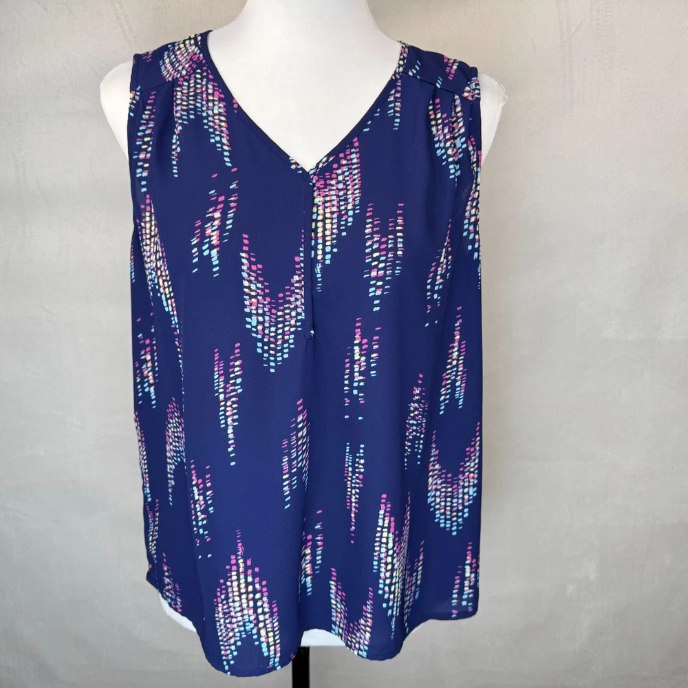 Elevate your wardrobe with this stunning Collective Concepts blouse in a beautiful blue hue. The sleeveless top features a V-neckline and a button closure, making it perfect for any occasion, be it a wedding, party, or casual outing. The blouse is made of high-quality polyester material and has a semi-sheer design that adds a touch of elegance to the overall look. The blouse comes in a regular fit, size S, and is suitable for summer, fall, or spring. The geometric pattern adds a unique touch to the blouse, making it a must-have for any fashion-forward woman. The garment care instructions recommend dry cleaning only. This blouse is perfect for women who want to add a basic yet stylish piece to their wardrobe. Measurements, Materials and Item Care: See labels photos. Item has been washed/cleaned and it is already packed, I will ship the same day or next business day. Color might differ from picture due to flashlight used , also it depends on your monitor light settings. Open to offers. B-1783