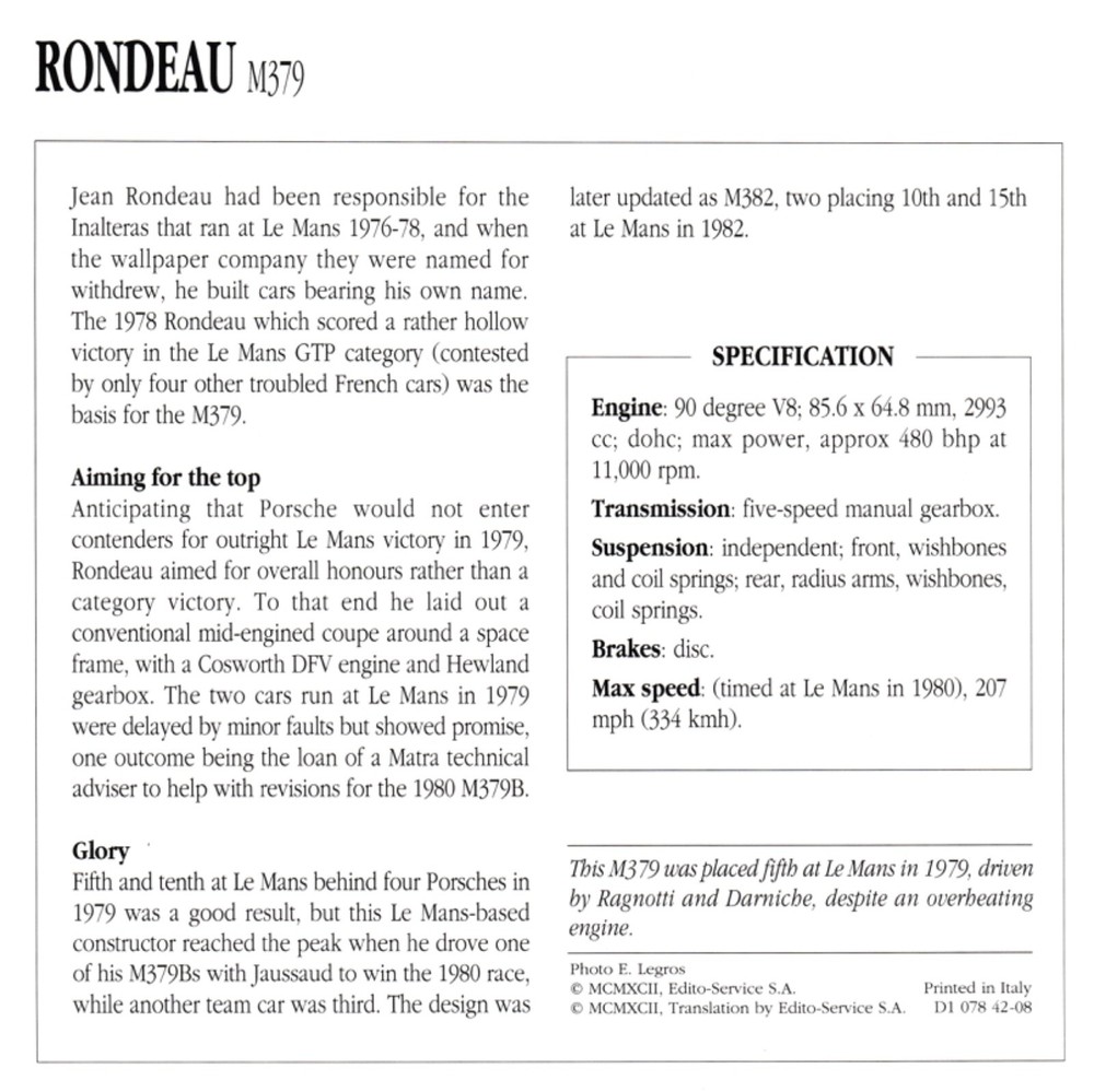 Collectors Club Classic Cars card. Rondeau M379 1979-1980 Competition category. Each card provides information and specifications of the featured car. Excellent condition. Any scanning defects on the images, such as vertical lines, are not present on the actual card. Postage can be combined for multiple purchases. Cards will be protected, and sent in stiff cardboard envelopes.