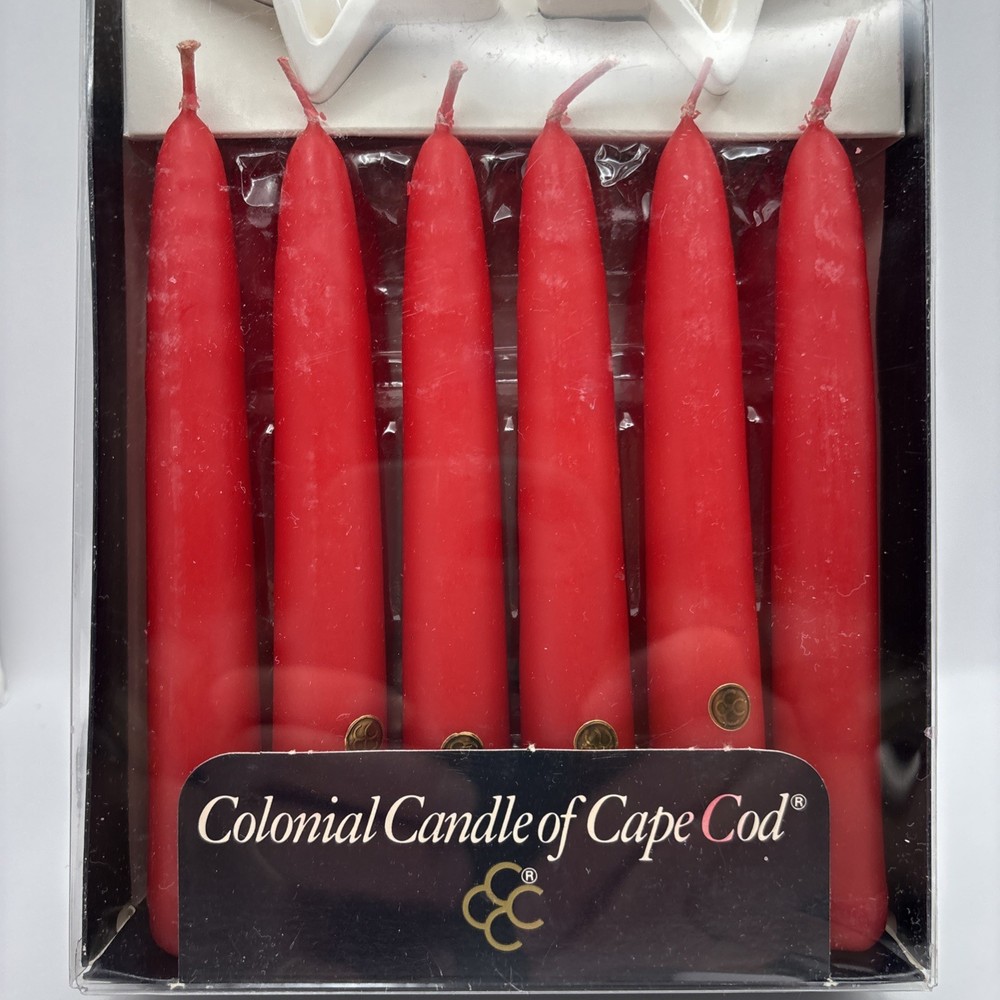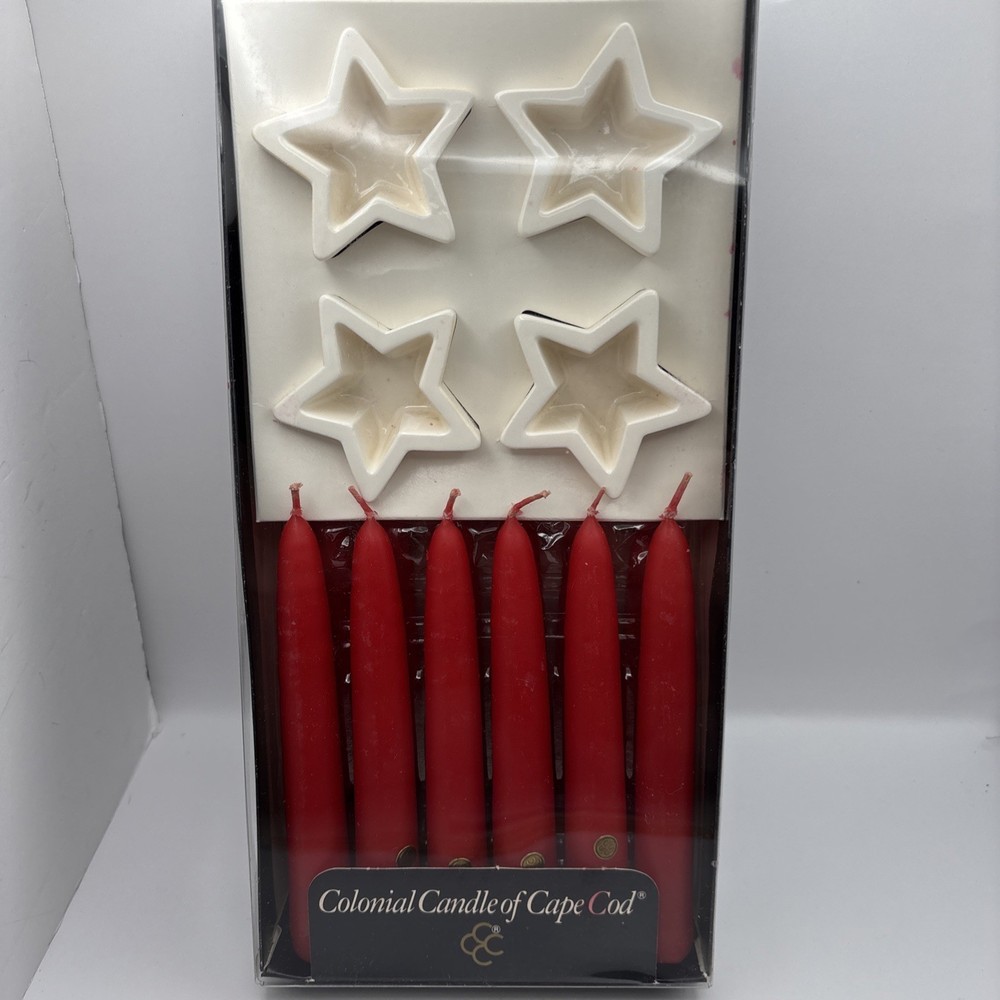 This is a box of Colonial Candles of Cape Cod. There are 12 red candles measuring 6 inches along with 4 star shaped candle holders. Made in Hyannis, Massachusetts. Items are unused in open box. Box shows wear.