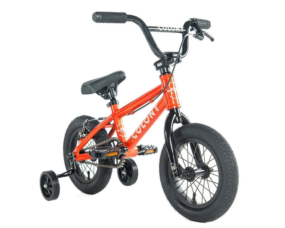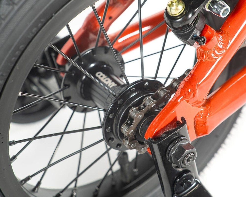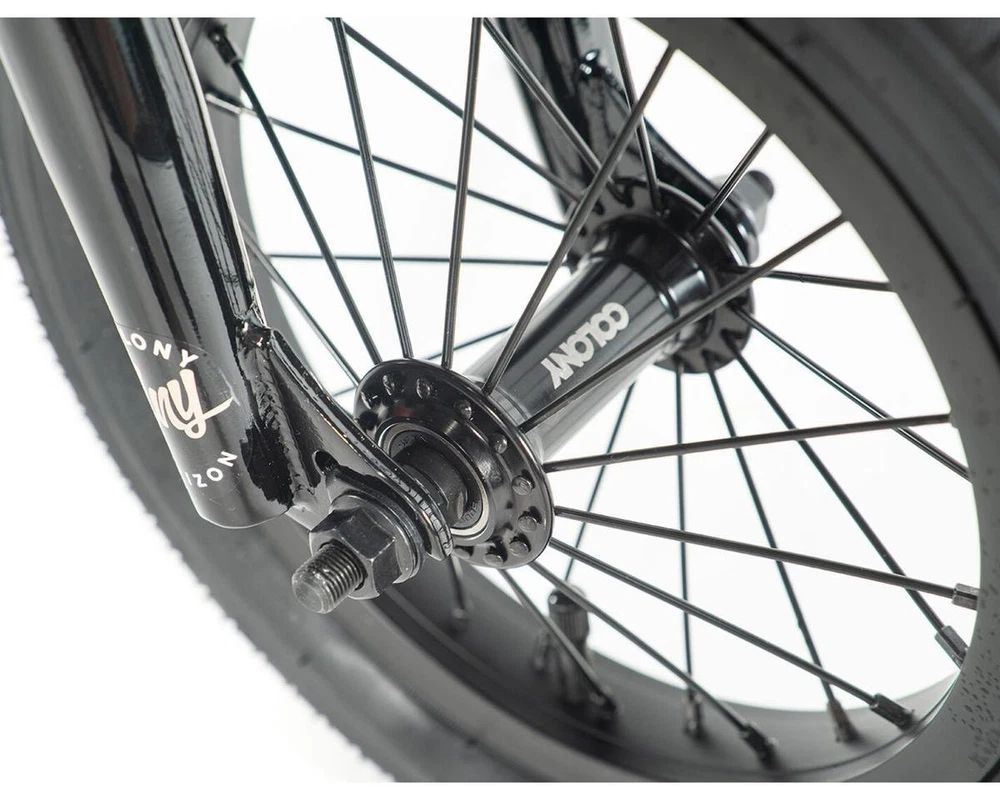 Colony Horizon 12" Built around a light weight alloy frame, coupled with appropriately sized geometry, makes these the perfect bike for the younger, smaller BMXers starting out. Progression & having fun with BMX with come naturally with the Colony Horizon series of BMX bikes. Frame: Colony Horizon 12” 11.9”TT 6061T6 Alloy, 9.4” rear, 75.0º HA, 71º ST, 7.7" Mid BB height, 1-1/8" Integrated Headset. Stand Over Height: 35cm (ground to top of top tube at seat tube) Forks: Colony Horizon 12” Chromoly tapered legs. Handlebars: Colony Horizon 5.0” rise 20.0” wide Chromoly. Grips: Colony Horizon Headset: 1-1/8” Integrated Stem: Colony Horizon Alloy Top Load short reach. Brakes (rear): V-Brake alloy with clear pads. Brake lever (right): Alloy short reach. Cables: Slick (rear). Sprocket: Colony Horizon 25T. Crankset: Colony Horizon Tubular Chromoly 3-pc 90mm. Bottom Bracket: MID sealed bearing. Chain: KMC. Pedals: Plastic. Rims: Alloy Single Wall 28 hole. Front Tire: Family F2128 12” x 2.25”. Rear Tire: Family F2128 12” x 2.25”. Spokes: Black steel. Front Hub: Colony Horizon Alloy, sealed bearing, 10mm axle. Rear Hub: Colony Horizon Alloy, Full sealed bearing cassette, 10mm axle with 9T driver. Seat: Colony Horizon Railed. Seatpost: Alloy 27.2mm diameter. Weight: 7.6 kgs (without training wheels) Note: Bike specification &/or colors subject to vary slightly About Us | View Store