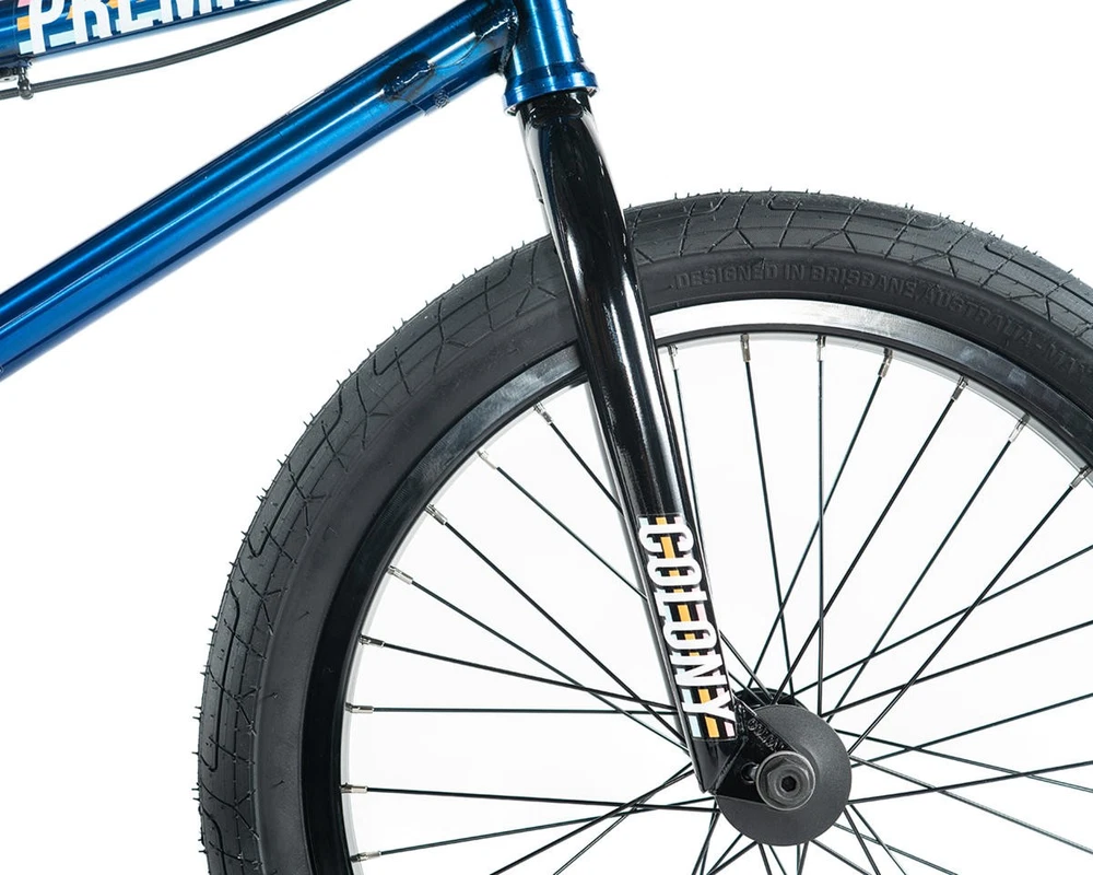 Complete Bikes, New Products / Colony Premise With the universal 20.8" top tube and the full Chromoly frame, forks and bars the Colony Premise is a great all round BMX Bike. Frame: Colony Premise Full Chromoly, 20.8" TT, 13.0" rear slammed, 75.2 HT, 71 ST, 11.5" Mid BB height, Integrated Headset. Stand over Height: 8.0" (center of BB shell to center of TT). Forks: Colony Premise Full Chromoly, tapered legs with 1 piece CNC steer tube, 25mm offset. Brakes: Alloy 990 style (rear). Lever: Alloy. Cables: Linear Slick (rear). Headset: Integrated. Stem: Colony Forged Top Load Alloy, 50mm reach. Bars: Colony Full Chromoly, 9.0" Rise x 29.5" Wide. Grips: Colony Much Room. Sprocket: Colony Endeavour Alloy 25T. Cranks: Colony Chromoly Tubular, tapered 8-spline 19mm spindle 170mm. Bottom Bracket: Sealed Mid 19mm. Chain: KMC. Pedals: Colony BMX Fantastic Plastic. (Pedals may vary on different color models) Rims: Double Wall 6000 Series Alloy 36h. Front Tire: Colony Grip Lock 20×2.35". Rear Tire: Colony Grip Lock 20×2.35". Spokes: Black. Front Hub: Colony Alloy Female Axle, Full Sealed Bearing, 36h. Plastic Hub Guards. Rear Hub: Colony Alloy Cassette, 14mm axle, Full Sealed Bearing with 9t driver, 36h. Non Drive Side Plastic Guard. Seat & Seatpost: Colony Aztec Fat Seat/Post Combo. (Seats may vary on different color models) Weight: 10.7kgs. The Colony Premise comes in Clear Blue. Note: Bike specification &/or colors subject to vary slightly Please note: All Trans or Clear coated finished frames will create rust spider webs in a short period of time. These will occur on or under the paint surface. This is the cosmetic desired effect for these styles of paint finishes. It does not affect the structural integrity of the frame. Nor is it considered a warranty case. About Us | View Store