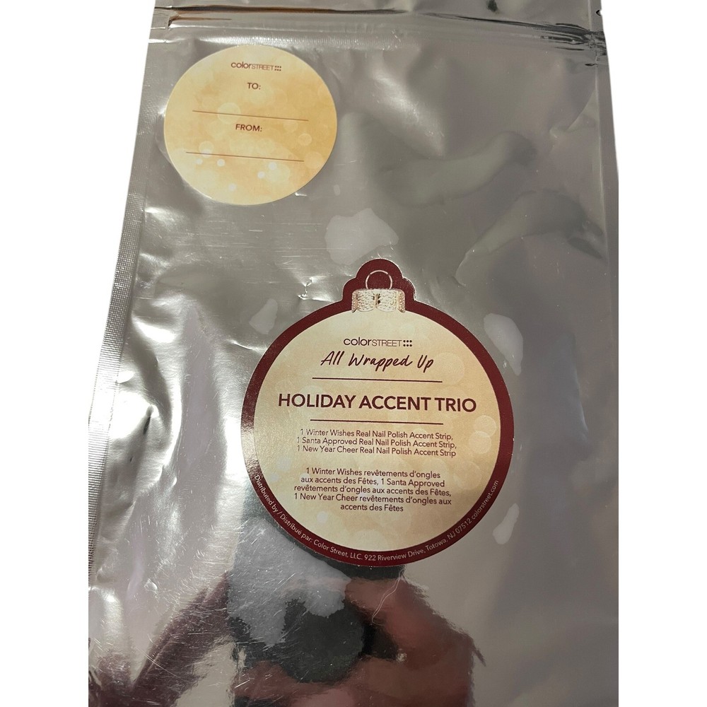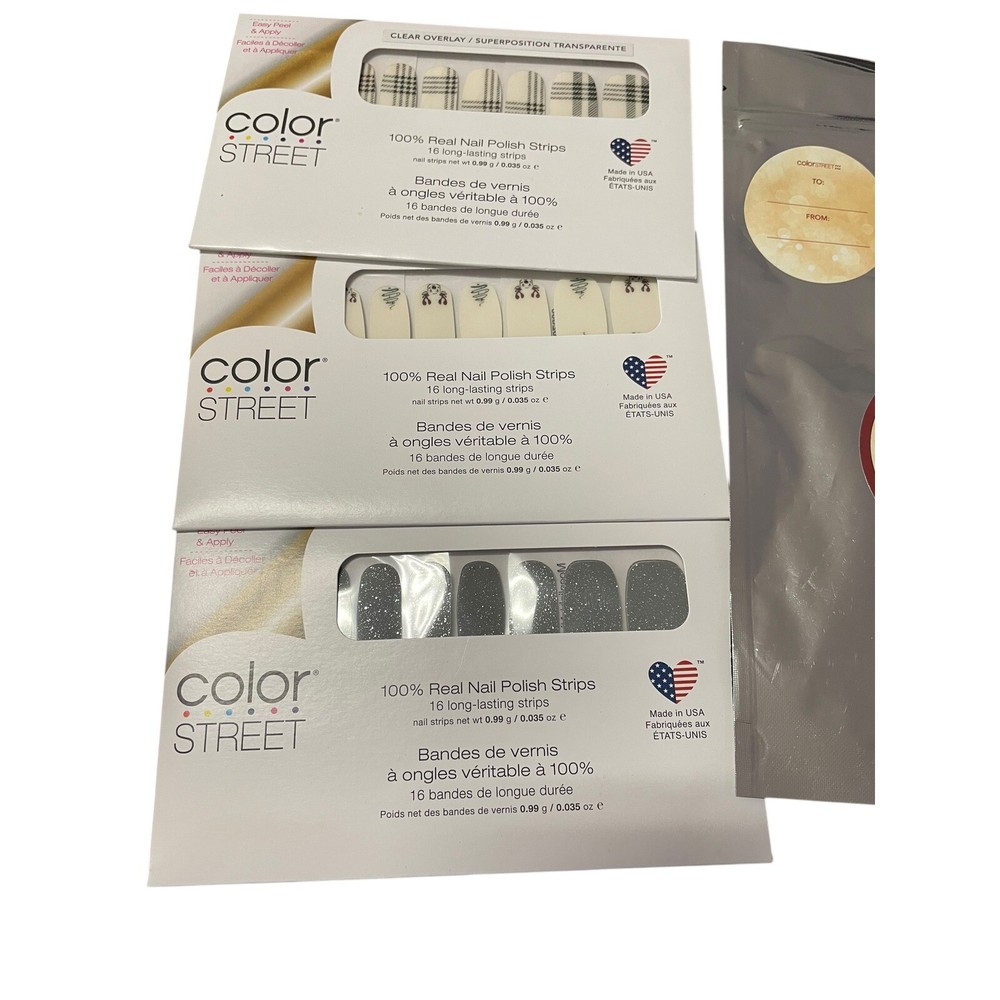 A curated set of Color Street nail polish strips, perfect for adding festive flair to your holiday look. This set includes three unique designs: a classic plaid overlay, a set with charming holiday-themed accents, and a sparkling glitter option. Each set contains 100% real nail polish strips for a long-lasting, salon-quality manicure at home. These strips are easy to apply and require no drying time, making them ideal for busy individuals. Perfect for holiday parties, family gatherings, or adding a touch of sparkle to your everyday style. Keywords: Color Street, nail polish strips, nail strips, holiday nails, glitter nails, plaid nails, accent nails, manicure, pedicure, nail art, 100% real nail polish, long lasting, no dry time, holiday accent trio