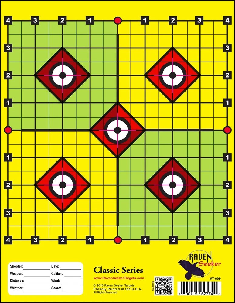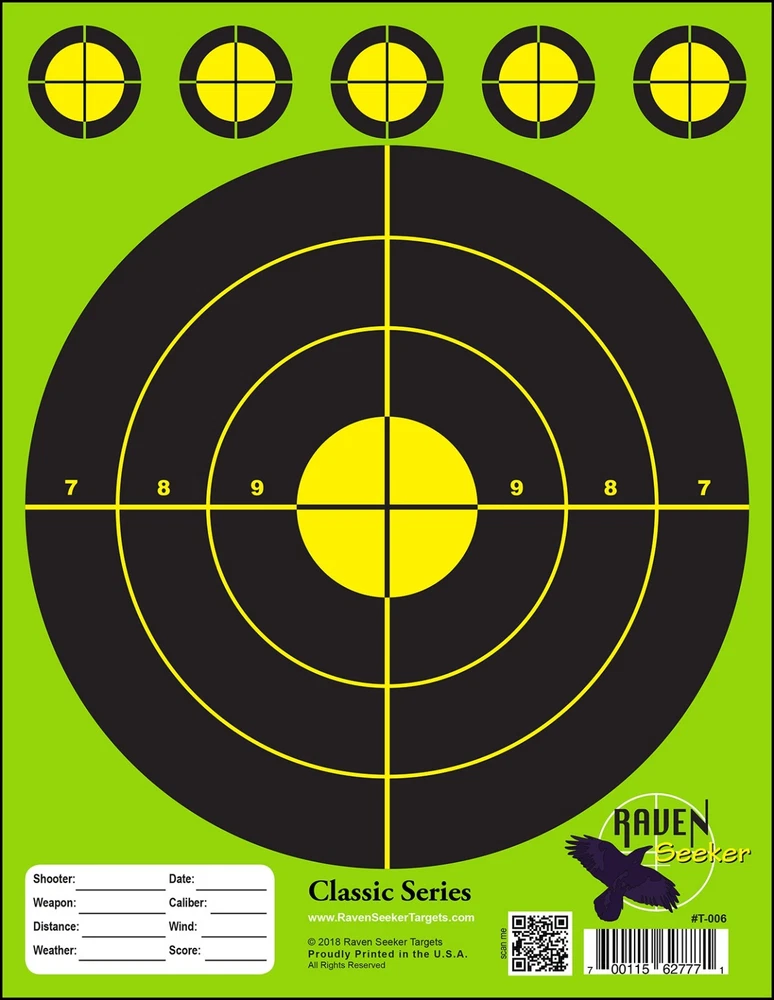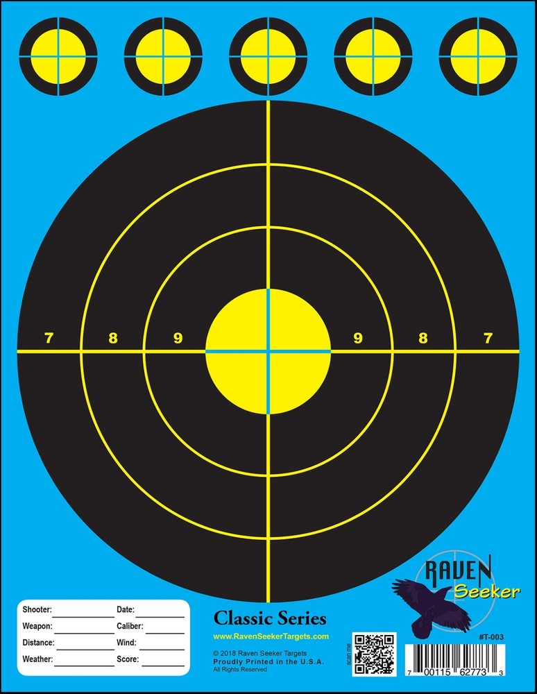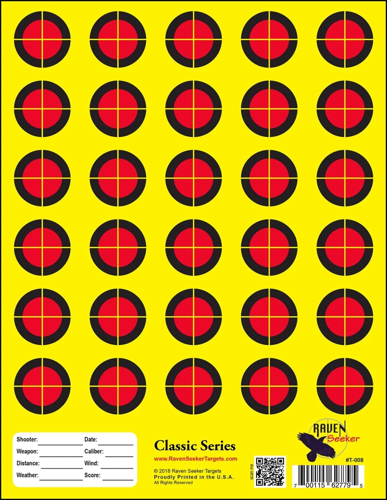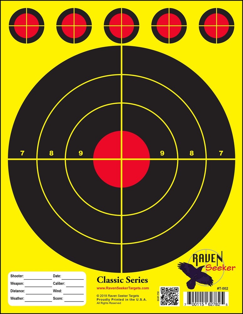 155 TARGETS at *Wholesale Pricing! Limited Time Offer! That's only $0.16 cost per color target! Now is the time to stock-up your TARGETS for the indoor/outdoor Range at this great price! Plus, the 8.5x11 size is P-E-R-F-E-C-T for your Range Bag! Raven Seeker Targets HIGH QUALITY PAPER SHOOTING TARGETS on 80# satin stock! Why does paper quality matter? These targets are designed for record keeping! Each target has an area in the bottom left corner to record important data. Increasing your shooting skill is the name of the game and this quality paper stock is 100% acid free so it won't yellow or turn brittle like other paper targets. Target Item #: T-001; T-002; T-003; T-005; T-006; T-008; T-009 Quantity: 155 Targets Total! RECEIVE: 155 loose shooting targets (shrink-wrapped for protection) in the following quantities: 25 qty: T-001: White 25 qty: T-002: Yellow 25 qty: T-003: Blue 25 qty: T-005: Pink 25 qty: T-006: Zombie Green 15 qty: T-008: Multi-30 15 qty: T-009: Scope Sighting Target Size: 8.5" x 11" (Outside diameter of circle for targets T-001, T-002, T-003, T-005, and T-006 is 8.0 inches.) Paper Stock Weight: 80 lb. Satin Text Use these simple, effective color targets to sight in your firearm. Targets have designated writing spaces to record key data for future reference. Printed on premium quality, acid free, 80 lb. Satin Text Weight Paper Stock. Keeping a good track record of your shooting experience is critical to your development and knowledge as a skilled marksman. And although different brands of ammunition, bullet weights, and weather can affect the accuracy of any gun, consistency and tracking can improve and grow your skills. TARGETS PROUDLY PRINTED IN THE U.S.A. p.p1 {margin: 0.0px 0.0px 0.0px 0.0px; line-height: 17.0px; font: 17.0px Arial; color: #000000; -webkit-text-stroke: #000000; min-height: 19.5px} p.p2 {margin: 0.0px 0.0px 8.0px 0.0px; font: 17.0px Arial; color: #000000; -webkit-text-stroke: #000000} p.p3 {margin: 0.0px 0.0px 8.0px 0.0px; font: 17.0px Helvetica; color: #000000} p.p4 {margin: 0.0px 0.0px 0.0px 0.0px; line-height: 17.0px; font: 17.0px Arial; color: #000000; -webkit-text-stroke: #000000} p.p5 {margin: 0.0px 0.0px 0.0px 0.0px; line-height: 17.0px; font: 17.0px Arial; color: #ff0010; -webkit-text-stroke: #ff0010} p.p6 {margin: 0.0px 0.0px 0.0px 0.0px; text-align: justify; line-height: 15.0px; font: 17.0px Arial; color: #000000; -webkit-text-stroke: #000000} span.s1 {font-family: 'Arial'; font-weight: normal; font-style: normal; font-size: 17.00pt; font-kerning: none} span.s2 {font-family: 'Arial-BoldItalicMT'; font-weight: bold; font-style: italic; font-size: 17.00pt; font-kerning: none} span.s3 {font-family: 'Helvetica-Oblique'; font-weight: normal; font-style: italic; font-size: 17.00pt} span.s4 {font-family: 'Arial-ItalicMT'; font-weight: normal; font-style: italic; font-size: 17.00pt; font-kerning: none} span.s5 {font-family: 'Arial-BoldMT'; font-weight: bold; font-style: normal; font-size: 17.00pt; font-kerning: none} span.s6 {font-family: 'Arial'; font-weight: normal; font-style: normal; font-size: 17.00pt; font-kerning: none; color: #000000; -webkit-text-stroke: 0px #000000} span.s7 {font-family: 'Arial'; font-weight: normal; font-style: normal; font-size: 17.00pt; text-decoration: underline ; font-kerning: none} span.s8 {font-family: 'Arial'; font-weight: normal; font-style: normal; font-size: 17.00pt; text-decoration: underline ; font-kerning: none; color: #000000; -webkit-text-stroke: 0px #000000} span.s9 {font-family: 'Helvetica'; font-weight: normal; font-style: normal; font-size: 17.00pt}