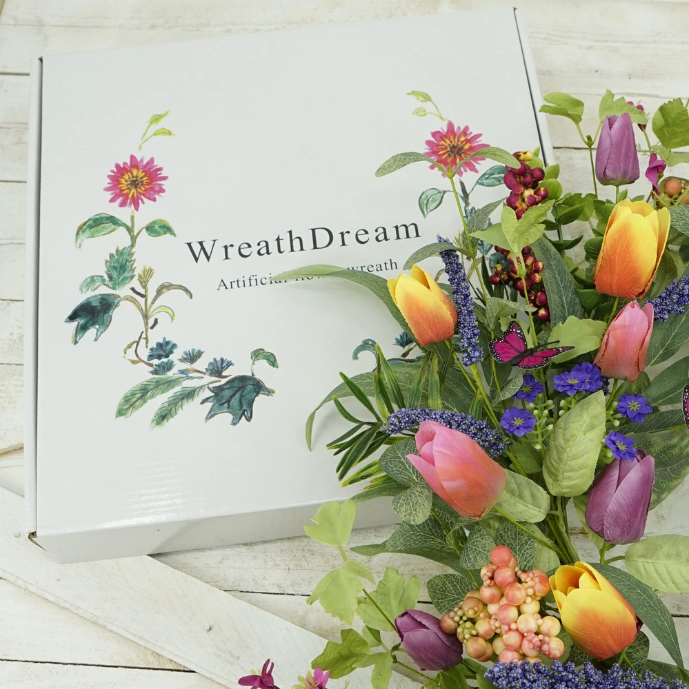 【Unique Design】: Please adjust or bend the branches on the wreath and arrange the tulip flower heads upward for best display.This Spring front door wreath is decorated with a full circle of lifelike colorful tulip, Many kinds of leaves and Purple tassels, eucalyptus leaves, ferns, butterflies creates a romantic look that makes for a wonderful style for spring door decoration. Elegant and vivid colors make for timeless seasonal home décor 【Best Friends for spring summer wreath】- Suitable for spring, wedding, home, wall, window, front door, fireplace, living room, bedroom, dining room, fireplace, porch, window and other indoor and outdoor decoration. Add glamour to your spring and summer season with this striking tulip wreath. 【Multi-occasions】: The spring summer tulip wreath can be used indoor or outdoor, place it on your front door, or hang it above your fireplace. It's also perfect for decorating weddings, birthdays, stages, bedrooms, offices, dining rooms, and others 【Easy Maintenance】: Highly realistic handmade artificial wreath makes it durable and requires no special maintenance. Just wipe it with a wet tissue or towel to keep it neat 【Packaging Design】 - we pack the wreath to gift box and we Tighten the wreath when packing so that the wreath can be protected when delivery,pls open,fluff the wreath and adjust the branches and flowers,the maximum size of wreath can be 22".