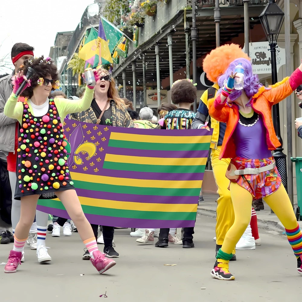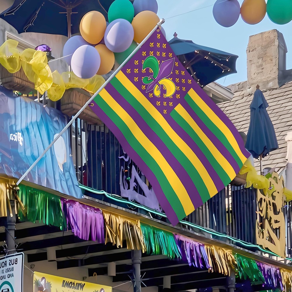 1 Show: Express the joyful atmosphere of masquerade carnival of the with this stunning mardi gras flag With On It with an eye-catching design. Durable: This mardi gras banner decor flag 3x5ft outdoor use polyester flag stands out because of its double-sided mirror printing, strong material and waterproof and UV-resistant coating, long-term use will not cause the flag to fade, and its ability to withstand strong wind and rain. Multi-Functional: Whether you are hanging the mardi gras house flag 3x5 outdoor is double sided on your wall, waving it during a parade, displaying it in your house/yard, or using the mardi gras flag as a unique holiday gift, this masquerade carnival fat tuesday party decor is perfect for anyone occasion. Symbolic And Inspirational: The combination of the mardi gras banner and the American flag creates a powerful visual statement. Also a for mardi gras garden flag is the best choice for outdoor garden decoration on mardi gras party, dance party, party or any other day you want to celebrate American. Easy To Install: With brass grommets, you can set up this mardi gras banner flag for home on any flagpole in seconds, and its vibrant colors stay vibrant for a long time. (Please Note: Flagpole not included).