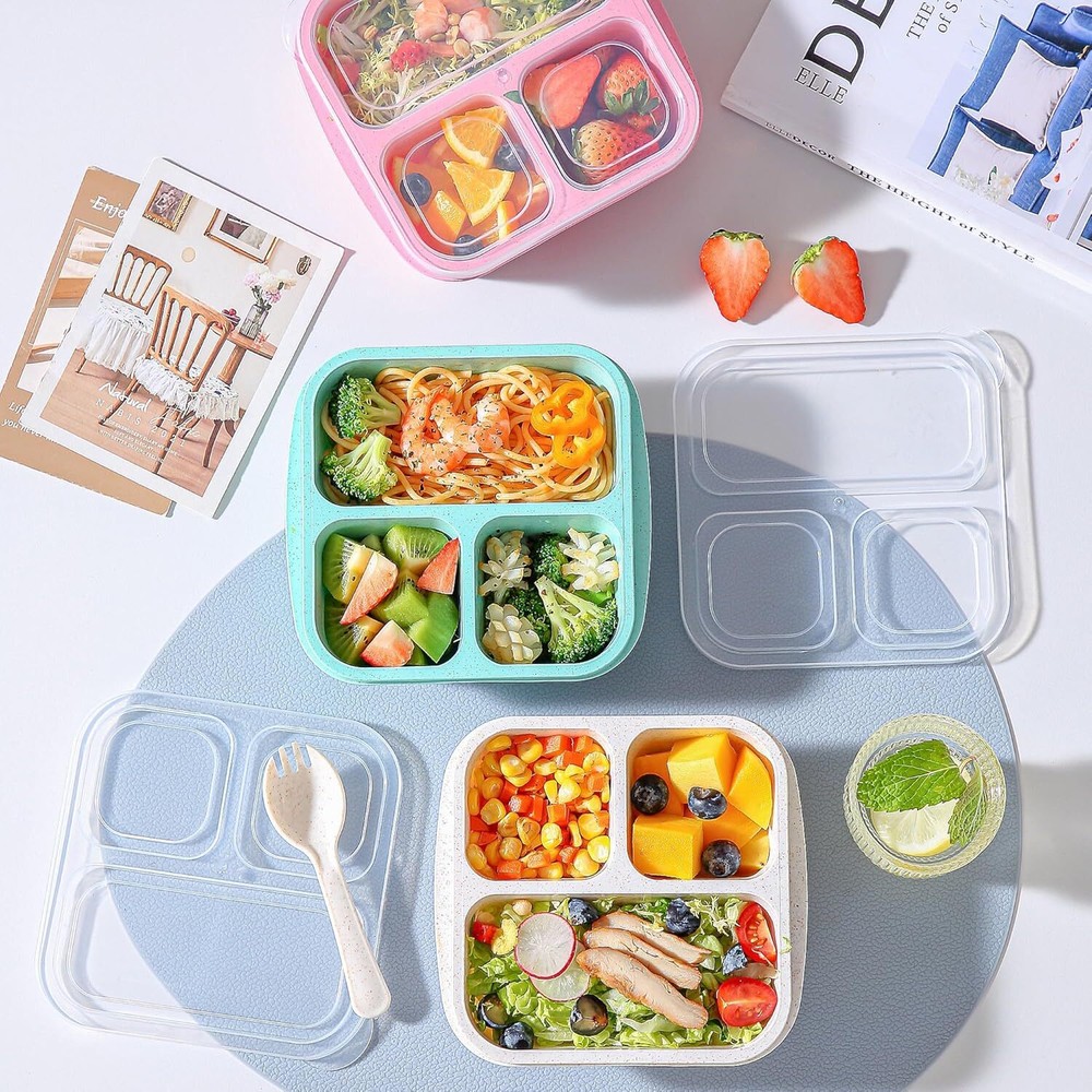 【Wheat Straw Bento Box 】: The 3-compartment bento lunch box is made of durable wheat straw and food grade PP material, BPA free, no odor, stain-resistant. This is a stackable bento box adult lunch box that can replace disposable lunch boxes, sturdy and reusable, easy to clean. It is a great lunch box containers for preparing healthy meals and snacks for school, work or going out 【Cost-effective Snack Containers Pack of 4】:You will receive bento lunch box pack of 4, with 4 colors in total: pink, beige, blue and green. The size is approximately 6.1 x 6.1 x 2.2inches. Sufficient quantity and style of lunch containers can meet various daily needs, three perfectly portioned compartments can balanced distribution of food without confusion. Snackle box containers suitable for school, office, camping and travel 【Easy Open Meal Prep Containers】: The snack containers lids stay perfectly in place when inside a lunch bag and it is easy to open for kids. The bento lunch box has a transparent lid, which has the function of strong sealing performance and great freshness preservation. Stackable in your lunch box bag with leakproof design (Not for liquid). Not only serve as bento box adult lunch box, it can also serve as snack containers, sandwich containers, lunch containers for adults. Designed with kid-friendly 【Wide Application In Daily Life】: The snack containers are lightweight and easy to carry. It can be stored in the refrigerator to keep food fresh, and the lunch box containers can be stacked for storage,you can also put in a backpack or lunch bag easily for on-the-go meal, a great option for kids and adults to go to camping, outdoor activities,work,travel. 3 perfectly portioned compartments make it easy to pack a variety of snacks for any size appetite from kids to adults 【Microwave, Freezer, Dishwasher Safe】:These wheat straw food storage bento boxes can tolerate a broad range of temperature from -4°F to 248°F (-20℃ to 120℃). The meal prep containers reusable is convenient to open and store frozen foods for long-term meal plans. The lid needs to be removed and hand wash please for avoiding deformation by high pressure when heating in the microwave and washing in the dishwasher