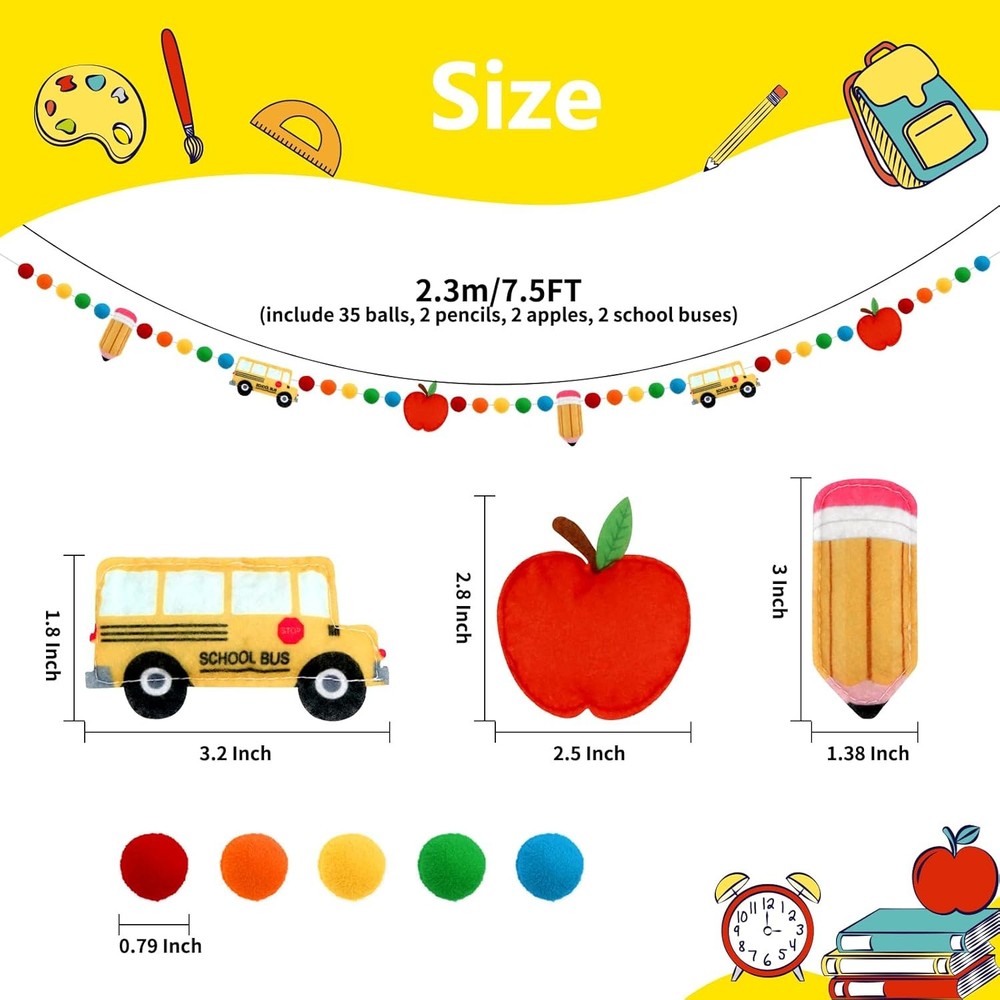 Free eBay listing template designed by dewiso.com Back to School Decorations 7.5 Ft Felt Pompom Banner Pencil Apples School Bus Felt Ball Pre-Assembled Hanging Banner Welcome Back to School Garland for Classroom, Mantle, Wall, Party Supplies FREE AND FAST SHIPPING! About this item Unique Design: You will get one piece back to school pompom pencil and felt ball banner garland. The garland is made up of two felt pencil, two apples, two school bus and 35 felt balls in 3 colors. NO DIY: We have assembled it for you and save your time to prepare the party. Just use the back to school garland to decorate your home or classroom, making your party more special and attractive. Lets celebrate the festival and share warmth and welcome to your students! Vivid Color: This back to school garland is made of quality felt with bright color. No fading, no smell, and can be used for many times. Widely Use: This back to school banner can be used on different occasions. You can display it on your mantle, fireplace, dessert table, tiered tray, wall, window, bedroom etc with other decorations. Get your party ready with it and create an attractive and warm atmosphere! Customer Service: Please contact us if you have any dissatisfaction about our product. We will reply within 24 hours! Product We offer a 30-Day Return Policy on items which you are not completely satisfied with. You have the option for a full-refund or an exchange of the item. No returns are available on items shipped outside of the US . Shipping We offer Free Shipping to the US and ship within 2 business days of payment, usually sooner. We use UPS express shipping. That's why your products are usually delivered within 3 days . Contact We try our very best to make sure every customer is completely satisfied. If there's a problem , message us! We're happy to help. 24/7 live chat available.