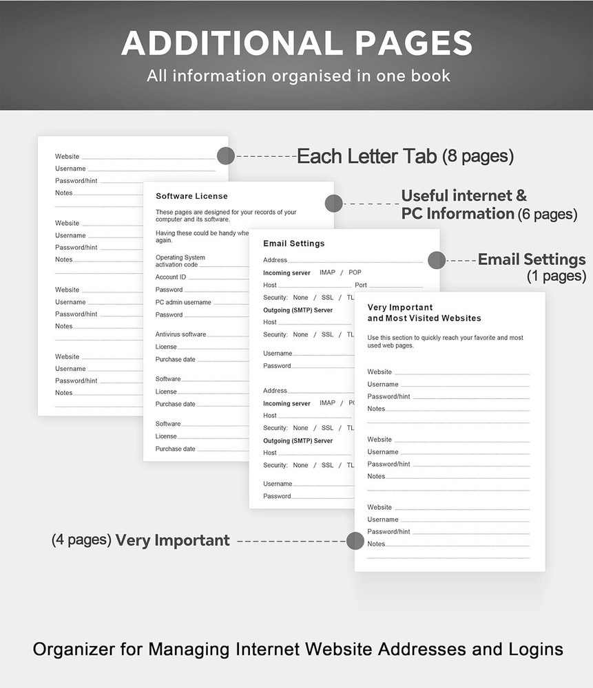 Password Book with Colorful Alphabetical Tabs, 8.4" X 5.8" Hardcover Password Ke Never Forget a Password Again: Tired of forgetting your passwords? Say goodbye to the frustration of constantly juggling and resetting passwords. Our Password Book with Colorful Alphabetical Tabs helps you easily store and keep all your passwords in one secure place, saving you from the hassle of managing multiple passwords, with no visible labels or titles, protecting your sensitive information. Find Your Passwords Quickly & Easily: Need to find a password in seconds? This password keeper with alphabetical tabs makes it simple. With vibrant colors and clear A-Z prints, you can quickly locate what you need, making it a breeze to access your accounts.