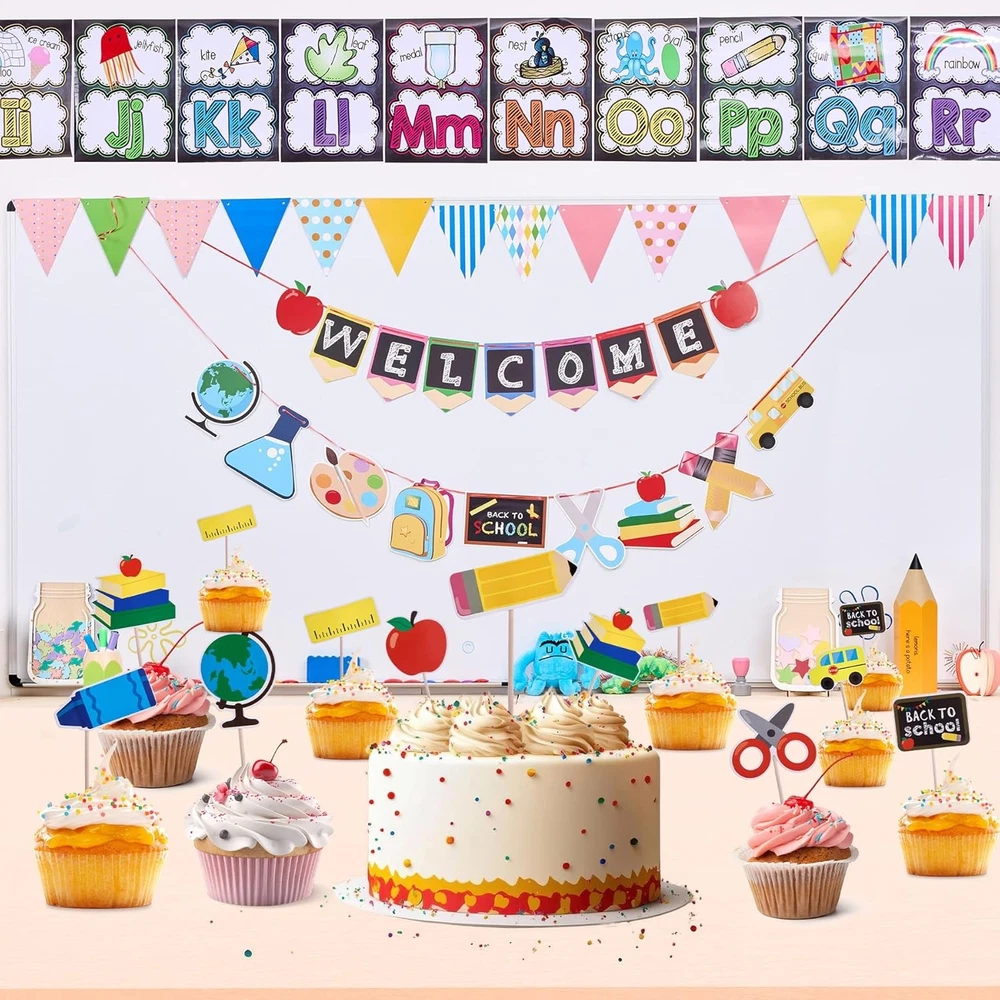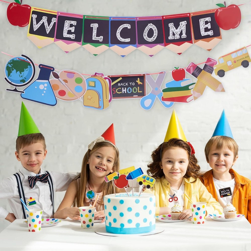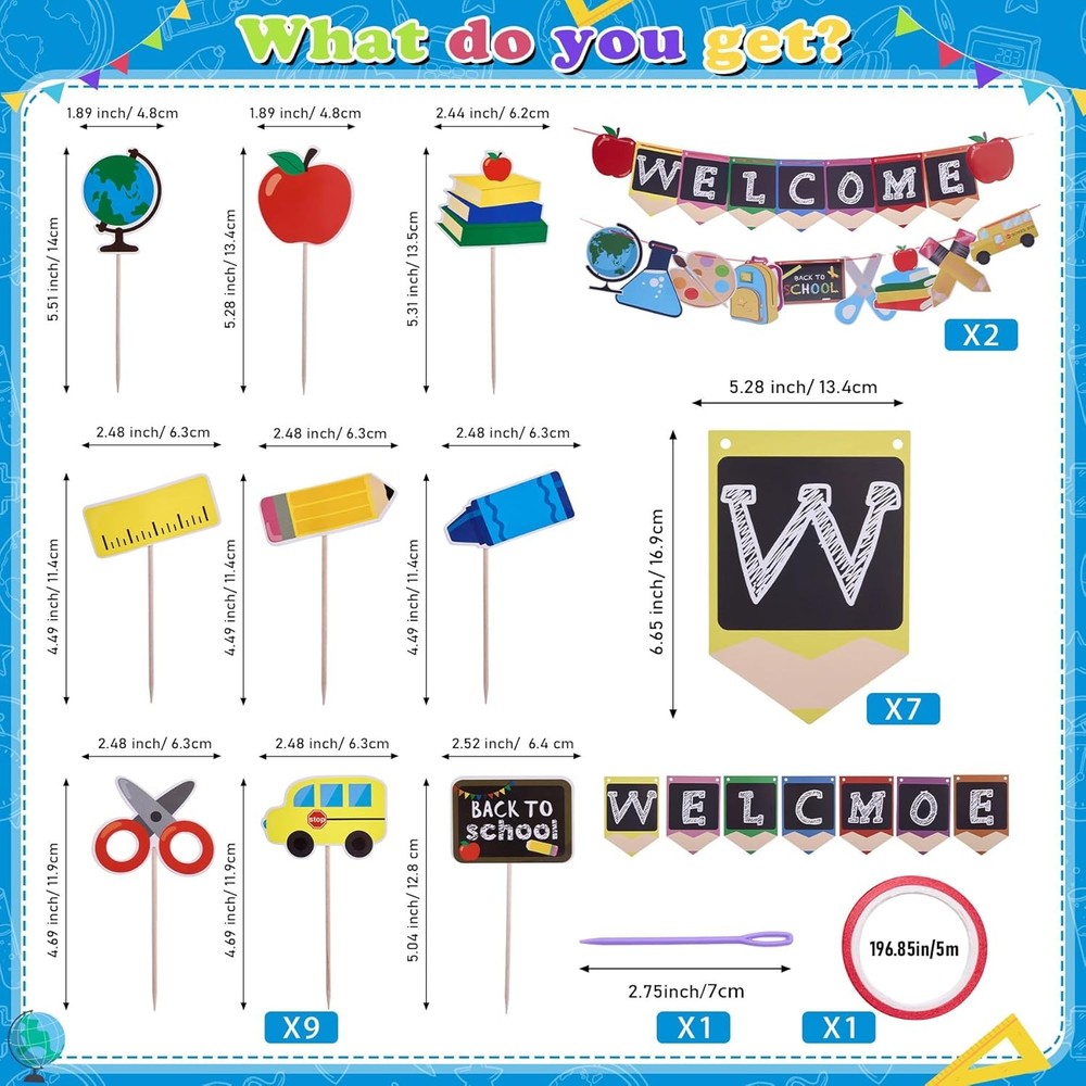 Free eBay listing template designed by dewiso.com Back to School Decorations Banner Set with Cake Copper Ornament Pre-Strung Welcome Sign, Pencil/Apple Designs, 300GSM Paper for Party Decor FREE AND FAST SHIPPING! About this item Back to School Decoration Set: Graffiti-style banner Features 2 pre-strung banners with hanging rope (118"x24"). Includes 20ft rope for versatile hanging in classrooms, hallways, or bulletin boards. 36 cake toppers sized 5.51"x1.89" (14x4.8cm) includes 9 distinct styles to suit diverse decorative needs for celebrations. Premium Durable Material: Made of lightweight polyester or 300GSM cardstock (select styles). Fade-resistant, weatherproof, and reusable for multiple academic years. Quick Assembly & Multi-Purpose Use: Pre-strung banners unfold instantly, while the lightweight toppers fit securely in cakes, cupcakes, or DIY crafts. Ideal for welcoming students, teacher appreciation, or academic-themed parties. Designs include globes, chalkboards, and backpacks for versatile styling. Dynamic Visual Elements: Clear-print banners showcase "WELCOME" letters, apple, backpack, pencil, car, paintbrush, chalkboard, globe, and notebook motifs. Ideal for K-12 to university settings with manufacturer quality guarantee. Instant Party Atmosphere: The banner’s attached ropes enable fast hanging, while toppers add flair to treats or gift bags. Bold prints and school motifs spark conversation—perfect for celebrating academic milestones or seasonal gatherings. Product We offer a 30-Day Return Policy on items which you are not completely satisfied with. You have the option for a full-refund or an exchange of the item. No returns are available on items shipped outside of the US . Shipping We offer Free Shipping to the US and ship within 2 business days of payment, usually sooner. We use UPS express shipping. That's why your products are usually delivered within 3 days . Contact We try our very best to make sure every customer is completely satisfied. If there's a problem , message us! We're happy to help. 24/7 live chat available.