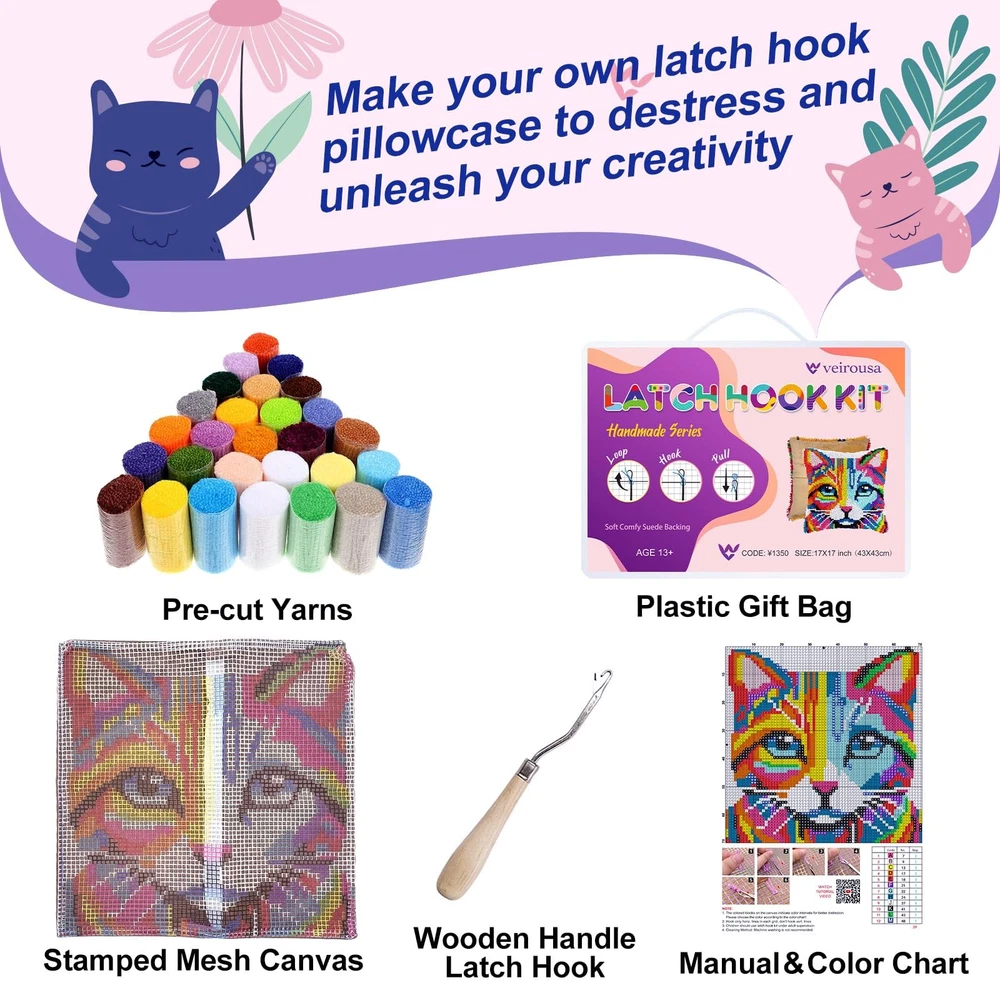 Colorful Cat Latch Hook Kits for Adults Kids Beginners Cute Animals Latch Hoo... ✨【Latch Hook Kit for Beginners】This Cute Colorful Cat latch hook pillow kit is designed for crafters of all skill levels. Featuring a clear instruction and tutorial video on how to latch hooking, our adult latch hook starter kit ensures that even beginners will have a satisfying and fun crafting experience, culminating in a stunning product that you'll be proud to display or give away. 🌈【All-in-One Kit】Each cute animals latch hook pillow kit includes a pre-printed mesh canvas, vibrant pre-cut yarn, Wooden Handle latch hook tool, user manual and a portable package. 🎄【Memorable Christmas Gift】Give a holiday gift that creates memories. The time and effort spent on crafting a latch and hook pillow cover make it a meaningful present that’s cherished long after it’s made. 🌟【Relaxing and Practical】Escape work stress with the calming craft of latch hook pillowcase making—a delightful and soothing pastime for adults. Once completed, your latch pillow transforms into a versatile Christmas decor piece. Use it as a cozy cushion and a unique throw pillow. It adds a personalized, handcrafted touch to any space, making your home uniquely yours. 😊【Satisfaction Assured】Our latch hook kit is crafted to bring joy and satisfaction! We're confident you’ll appreciate the quality and the delightful experience it offers. If for any reason you’re not fully satisfied, just reach out to us for a replacement. Your satisfaction is our highest priority. Introducing Cute Colorful Cat Latch Hook Pillow Kit - a perfect addition to your home decor or a meaningful handmade gift! Whether you're an experienced latch hook crafter or a beginner eager to explore latch hook, our latch kit offers endless creative possibilities. Our adult latch hook pillow kits contain everything you need to complete your 17x17 inch cushion cover: *1 Colorful Pre-printed Canvas *1 Set of Instructions and Color Chart *1 Wooden Handle Latch Hook Tool Sufficient Pre-cut Yarn *2 Portable Package Product Features: *Made from premium materials *Handmade meaningful gift *Stress relief and creative outlet *Enhances manual dexterity and focus *The perfect decoration for your home once complete Note: This product is a semi-finished product; you must make it yourself. This set does not include the pillow insert. Cleaning Method: machine washing is not recommended Dimensions are determined manually, so may vary slightly. Shipping We offer FREE shipping on all orders! We ship within Three business days of payment, usually sooner. We use a selection of shipping services such as UPS, FedEx, USPS etc. We only ship to the lower 48 states, no APO/FPO addresses or PO Boxes allowed. Local pickups and combined shipping options are not provided at this time. Return You can return a product for up to 30 days from the date you purchased it. Any product you return must be in the same condition you received it and in the original packaging. Please keep the receipt. Payment We accept payment by any of the following methods: PayPal Please pay as soon as possible after winning an auction, as that will allow us to post your item to you sooner! Feedback Customer satisfaction is very important to us. If you have any problem with your order, please contact us and we will do our best to make you satisfied. Contact Us If you have any queries, please contact us via ebay. We usually respond within 24 hours on weekdays. Please visit our eBay store to check out other items for sale! Thank you for shopping at our store.