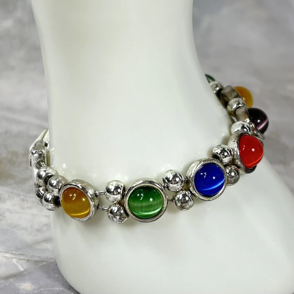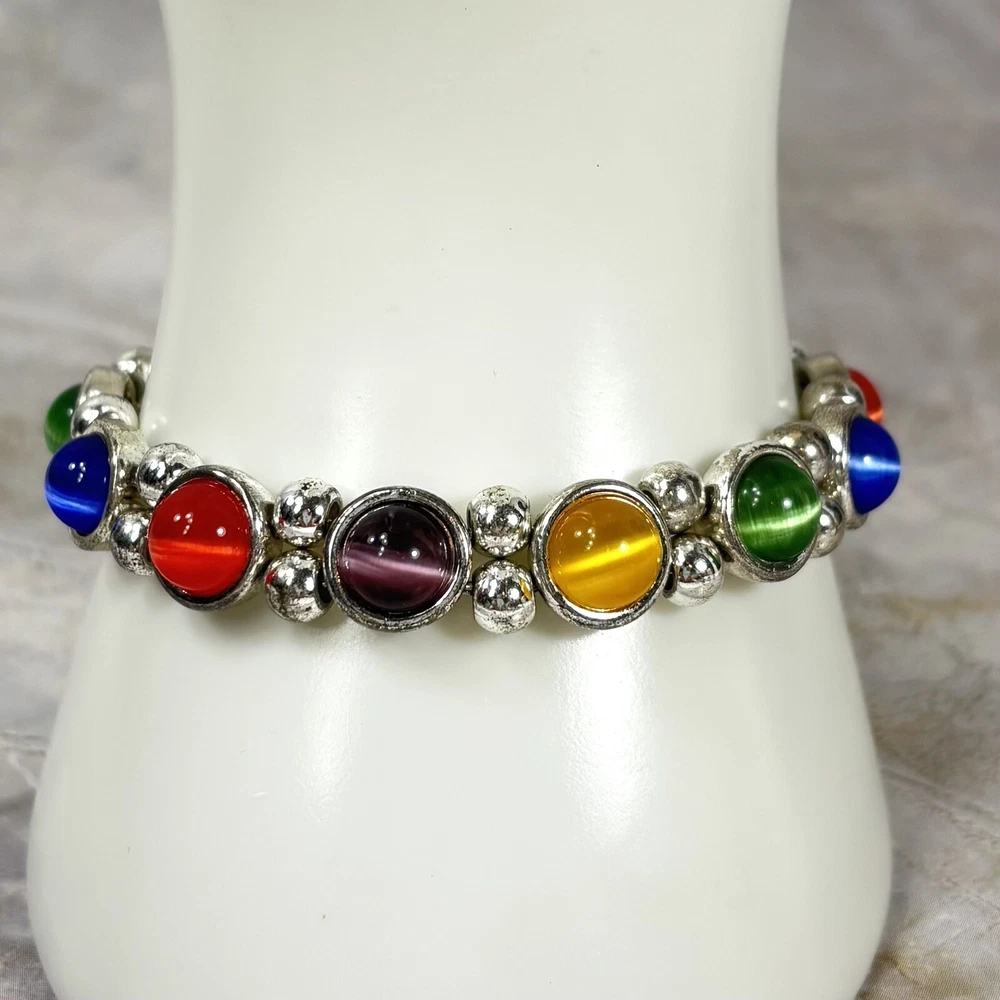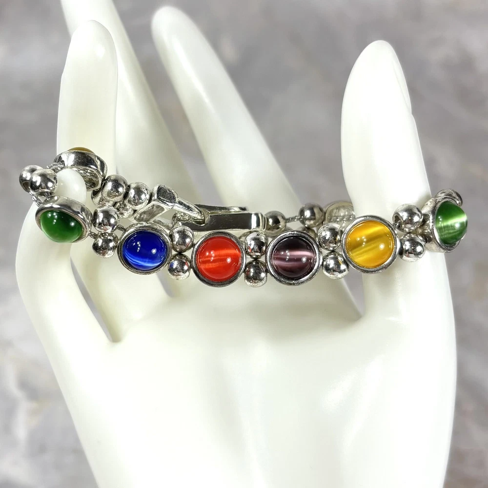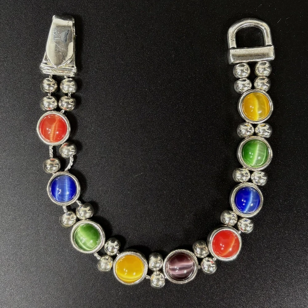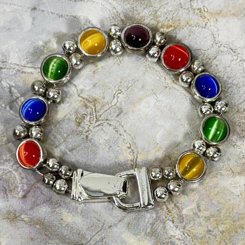 Colorful Cat's Eye Silver Tone Vintage Bracelet Magnetic Clasp READ DESCRIPTION Good condition! I would have called it great condition but there appears to be some discoloration on the silver tone finish under the bright lights for photography. In everyday light, this bracelet looks very shiny, intact, and bright. Please see pictures for details and message me with any questions.