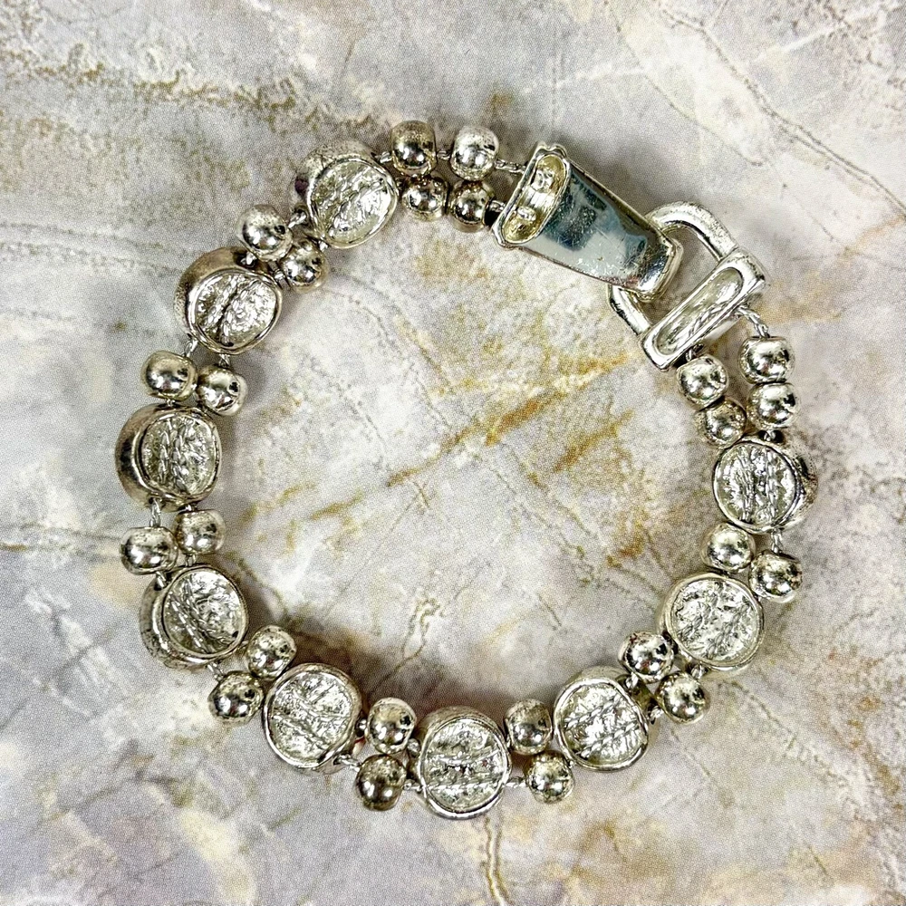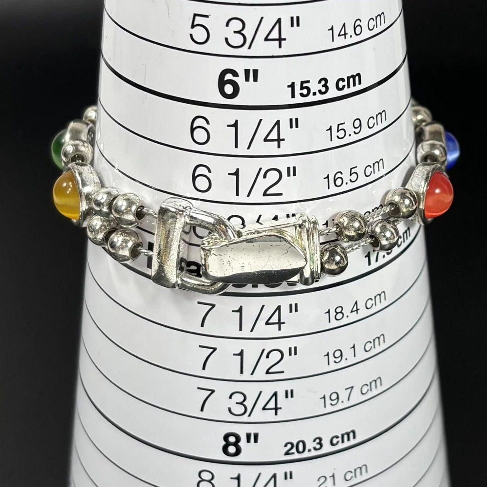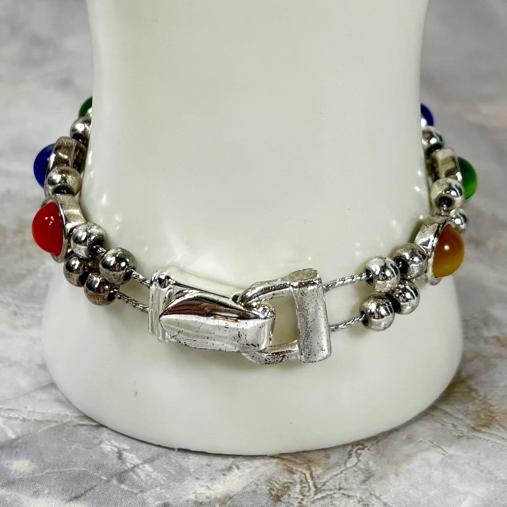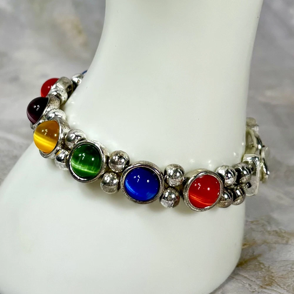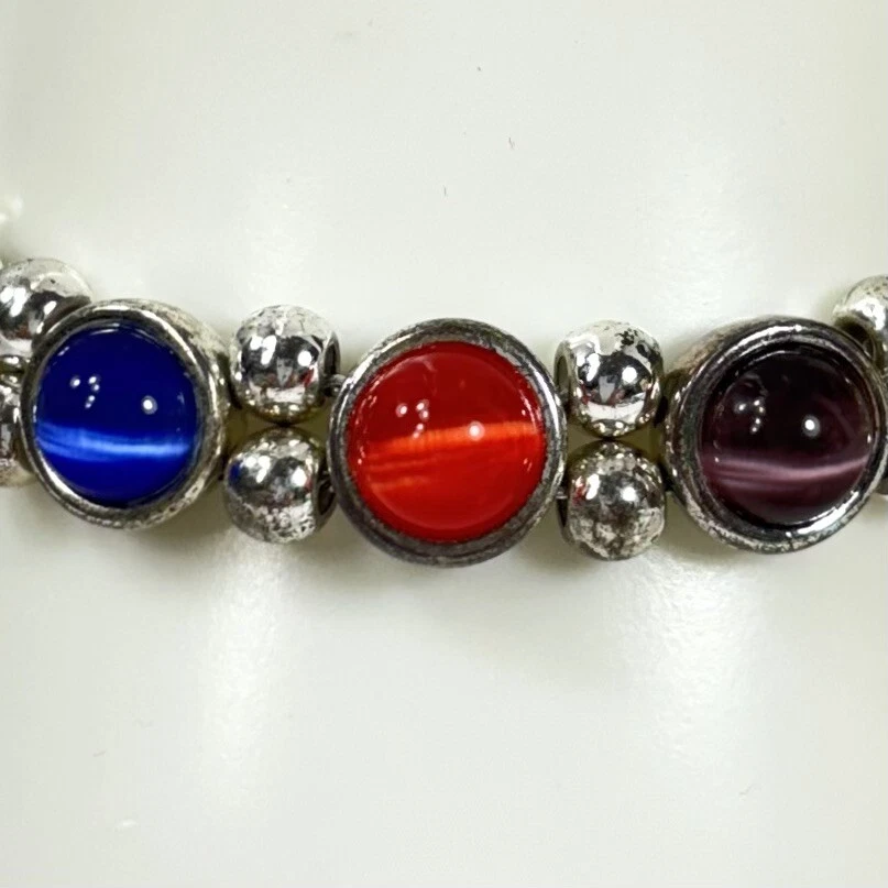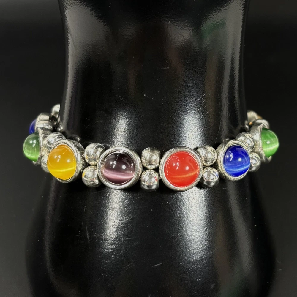 Colorful Cat's Eye Silver Tone Vintage Bracelet Magnetic Clasp READ DESCRIPTION Good condition! I would have called it great condition but there appears to be some discoloration on the silver tone finish under the bright lights for photography. In everyday light, this bracelet looks very shiny, intact, and bright. Please see pictures for details and message me with any questions.