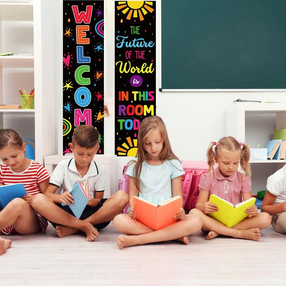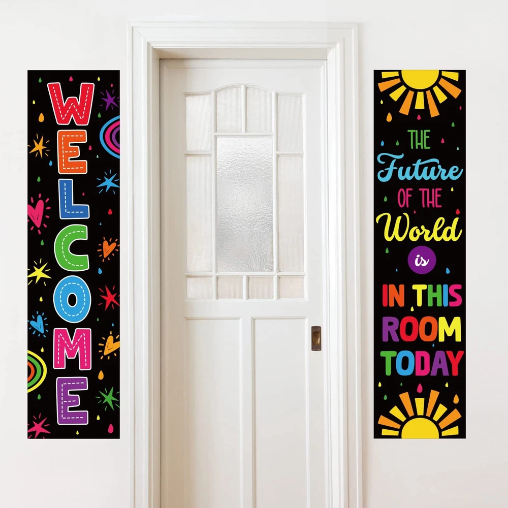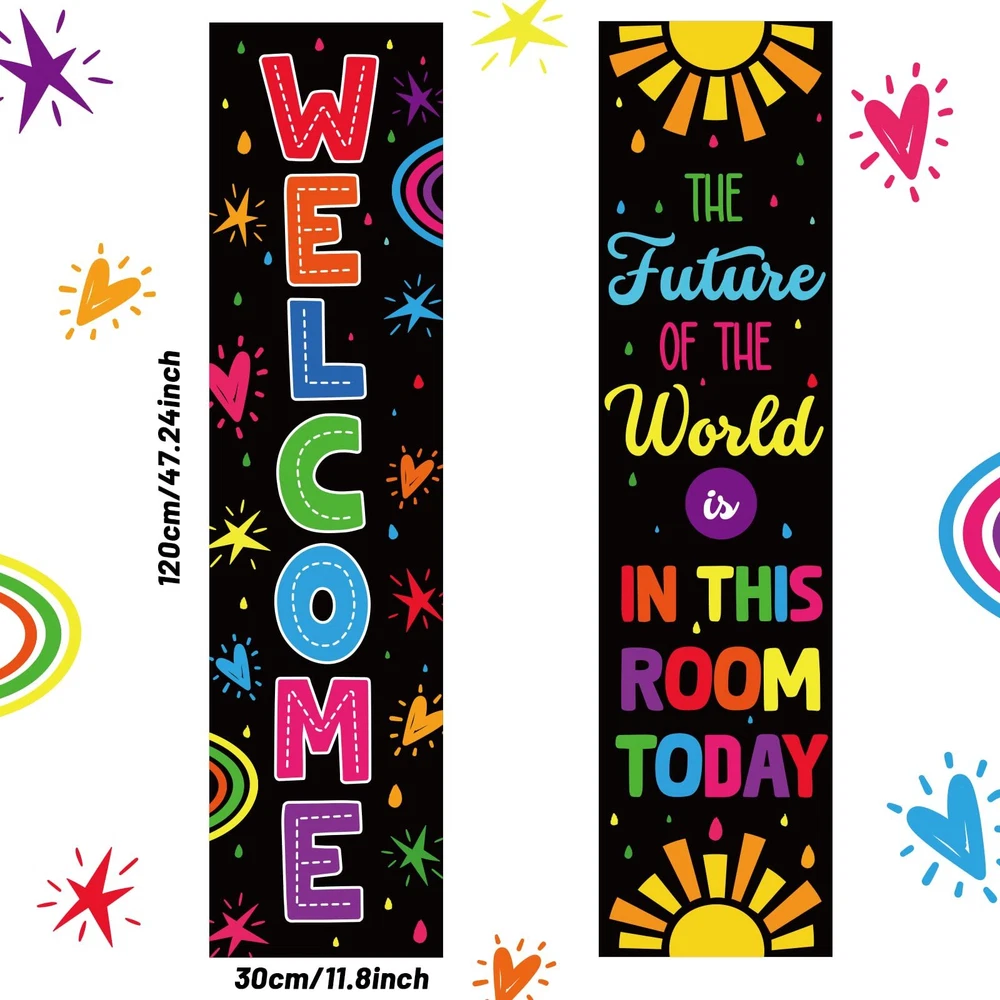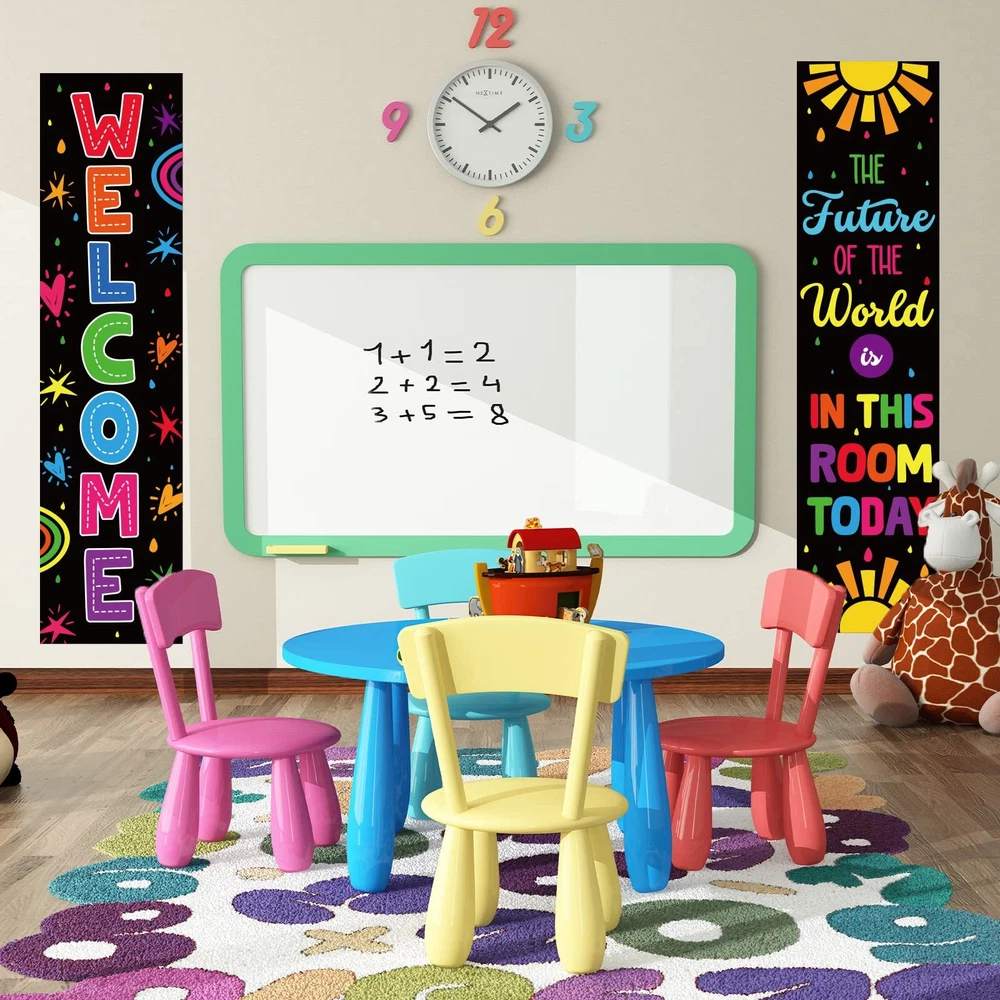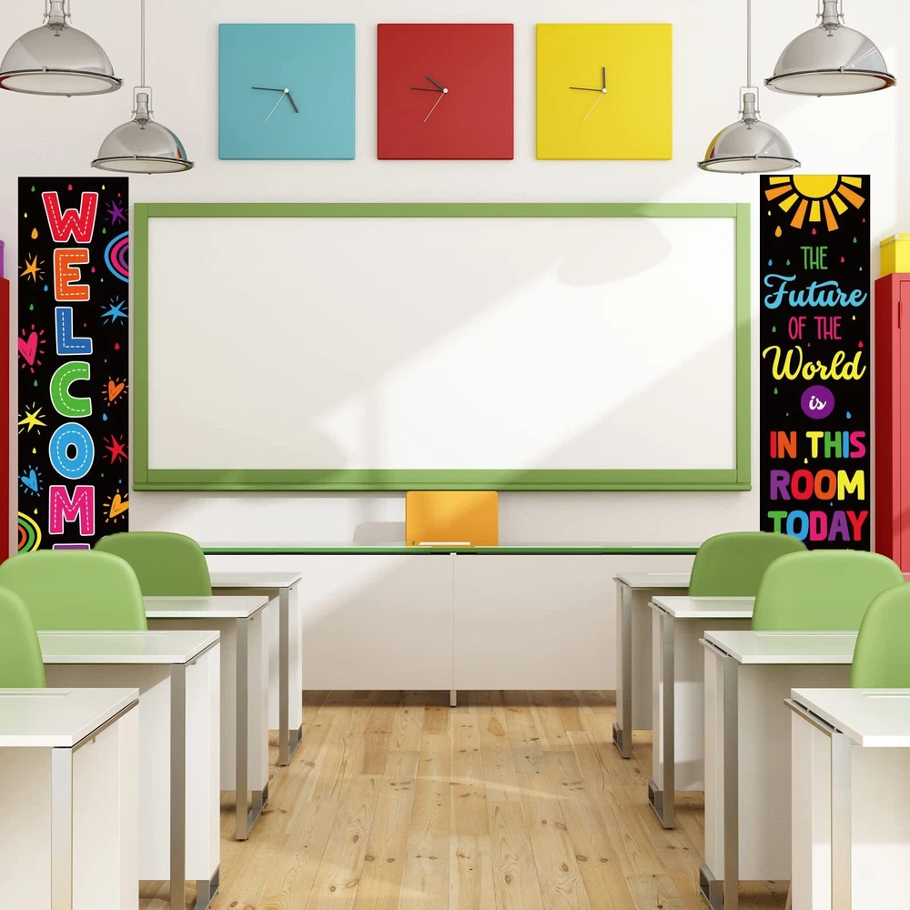 Colorful Classroom Decorations Classroom Welcome Banner and Poster for Teachers Positive Affirmations Banner Motivational Bulletin Board for Class School Classroom Bulletin Board Office Decoration Interesting and eye-catching: The colorful motivational mini bulletin boards are designed with colorful patterns and motivational sentence, come with adorable design, very interesting and bright, the text can help to enhance the learning experience. Wide applications: The classroom welcome bulletin board set is suitable for creating personalized classroom projects on door,bulletin boards, windows, chalkboards, and hallways. Specifications: Material: sturdy card Size: as pictures shown Package includes : 20 x Adhesive dots 1 banner printed with""welcome"" 1 banner printed with""the future of the world is in this room today"" Package contents: our classroom welcome bulletin board set includes 2 Banner which are measures 40*11.8 inch. One banner is printed with the words of "welcome", another one is printed with the words of"the future of the world is in this room today". we provided 20 pieces of adhesive dots for convinient applying. Convenient to use: the classroom decorative set measures about 40*11.8inch, big enough to decorate the classroom. there are adhesive dots provided for you to stick the calssroom welcome banner and posters. Chic appearance: the wall classroom decoration is a good solution for bulletin board decorations in classroom, providing a delightful visual reference for early learners, bulletin board sets easily enhance the learning experience. Wide range of usages: classroom welcome bulletin board set can be applied for creating different classroom projects on windows, chalkboards, bulletin boards, doors and hallways, these cute and colorful classroom decoration cards are suitable for decorating their classroom, decorating bed rooms and so on Quality material: our classroom banner are made of quality card, which is sturdy and reusable, non-toxic and no odd smell, come with good printing patterns, looking so bright and vivid, easy to catch the eyes