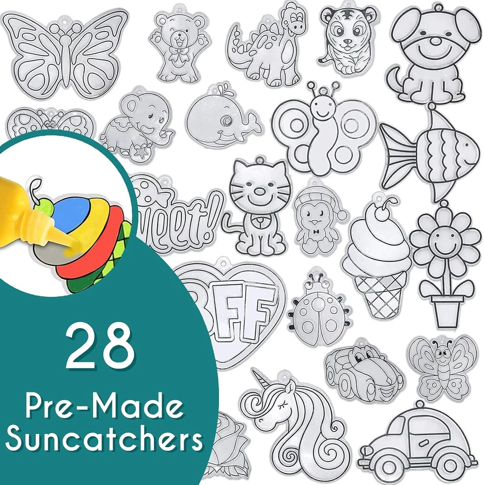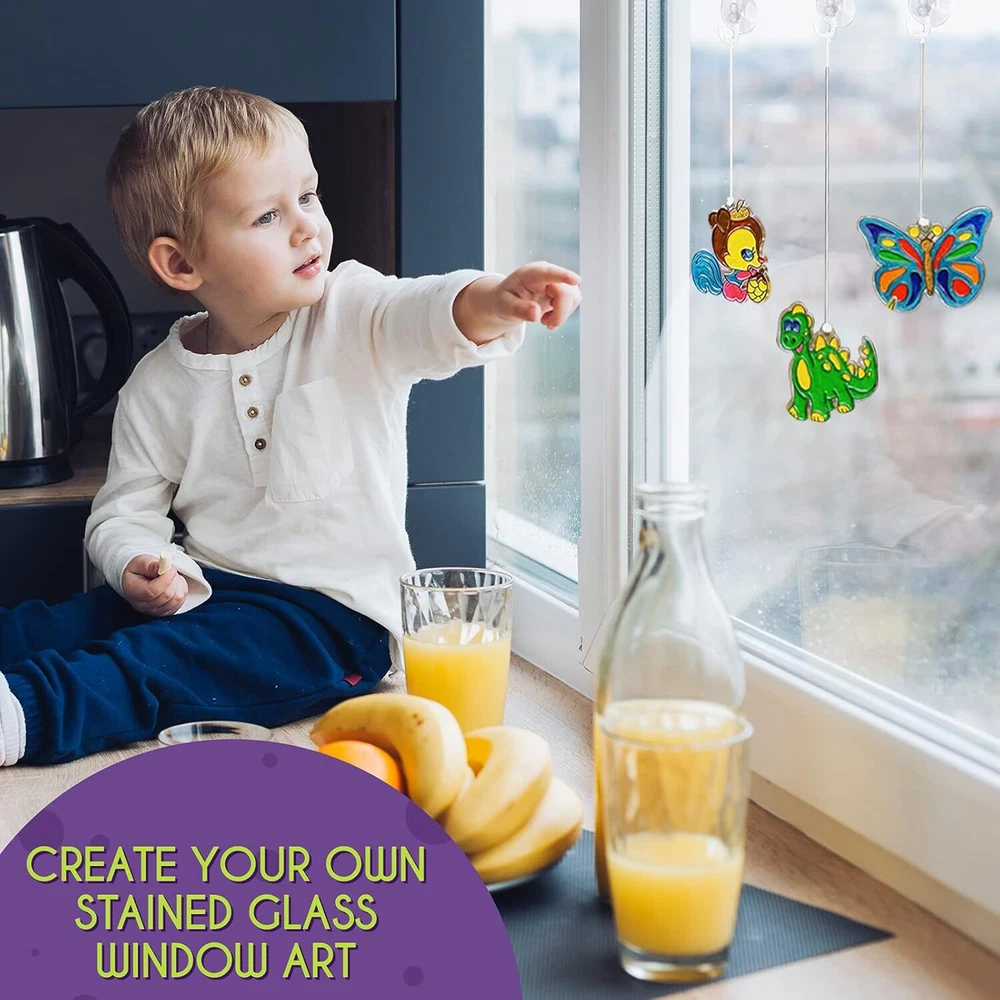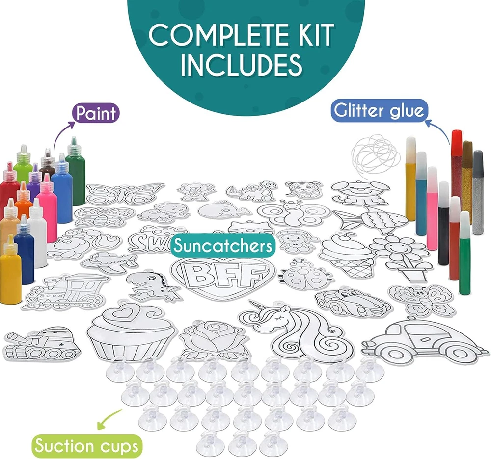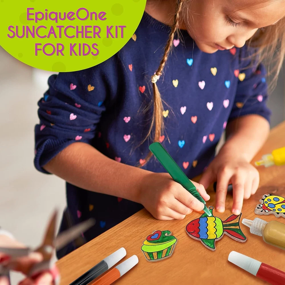 Product Description Paint Your Own Suncatchers Kit for Kids – Colorful DIY Stained Glass Window Kit – Arts and Crafts Activity – Includes 28 Pre-Made Suncatchers, Suction Cups, Paint and Glitter Glue Paint-it-yourself window art: Nothing lights up a room better than something you made yourself. With a DIY suncatcher kit from EpiqueOne, you’ve got a fun and easy way to create your own stained glass ornament that will catch light and spread colors around Craft time for kiddos: Any time is the right time to make art. Give your kids an activity that inspires creativity, builds confidence and empowers self-expression. A suncatcher project kit makes a great gift Plenty of pre-made designs: Our complete set includes 26 standard-sized clear ornaments in a variety of themes, plus one extra-large unicorn and one photoframe. 28 pre-made suncatchers total, all ready for painting A complete kit: Along with 28 pre-made clear suncatchers, this kit also includes 18 tubes of paint in a variety of colors, suction cups for hanging the painted ornaments, and three tubes of glitter glue for extra sparkle For girls and boys aged 4-8: Engaging art activities are a great alternative to toys, electronic devices and watching TV. Recommended for kids 4 to 8 years old