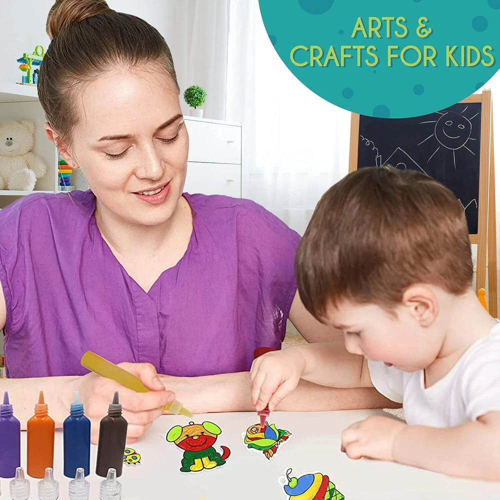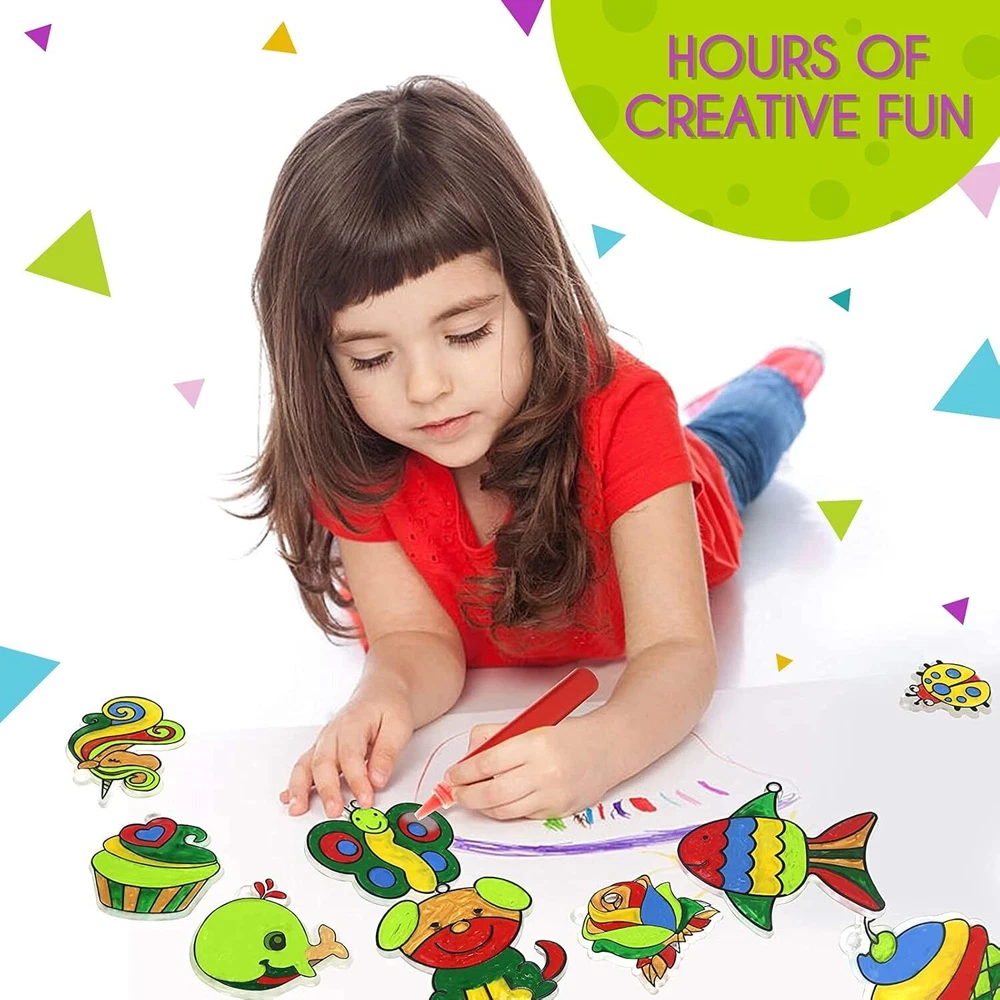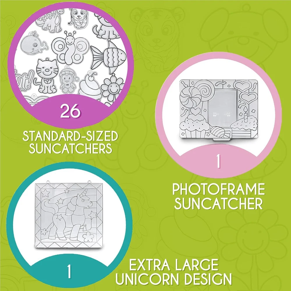Product Description Paint Your Own Suncatchers Kit for Kids – Colorful DIY Stained Glass Window Kit – Arts and Crafts Activity – Includes 28 Pre-Made Suncatchers, Suction Cups, Paint and Glitter Glue Paint-it-yourself window art: Nothing lights up a room better than something you made yourself. With a DIY suncatcher kit from EpiqueOne, you’ve got a fun and easy way to create your own stained glass ornament that will catch light and spread colors around Craft time for kiddos: Any time is the right time to make art. Give your kids an activity that inspires creativity, builds confidence and empowers self-expression. A suncatcher project kit makes a great gift Plenty of pre-made designs: Our complete set includes 26 standard-sized clear ornaments in a variety of themes, plus one extra-large unicorn and one photoframe. 28 pre-made suncatchers total, all ready for painting A complete kit: Along with 28 pre-made clear suncatchers, this kit also includes 18 tubes of paint in a variety of colors, suction cups for hanging the painted ornaments, and three tubes of glitter glue for extra sparkle For girls and boys aged 4-8: Engaging art activities are a great alternative to toys, electronic devices and watching TV. Recommended for kids 4 to 8 years old