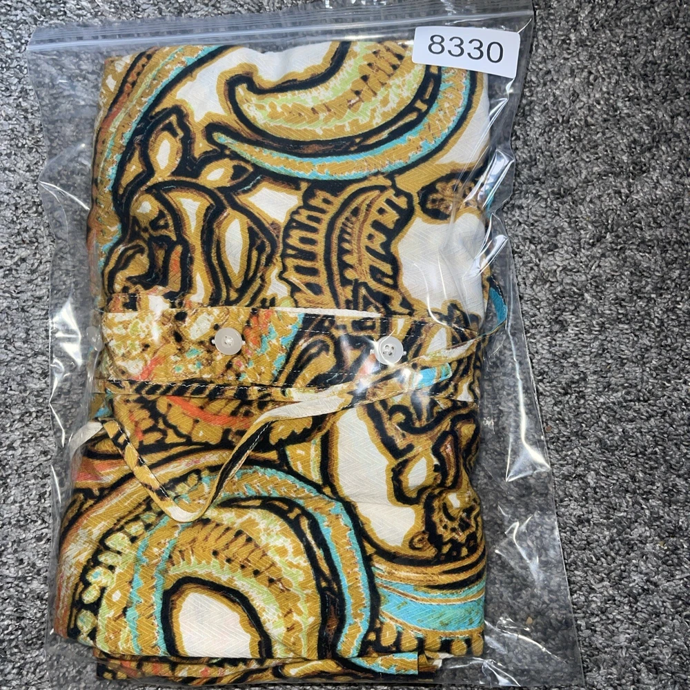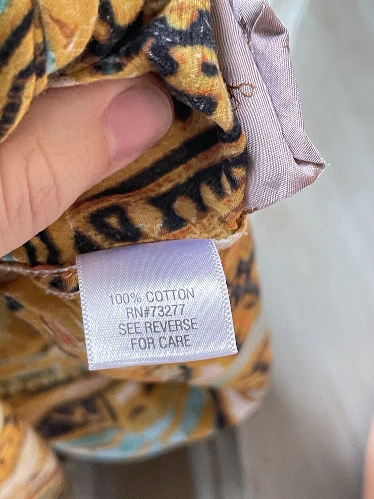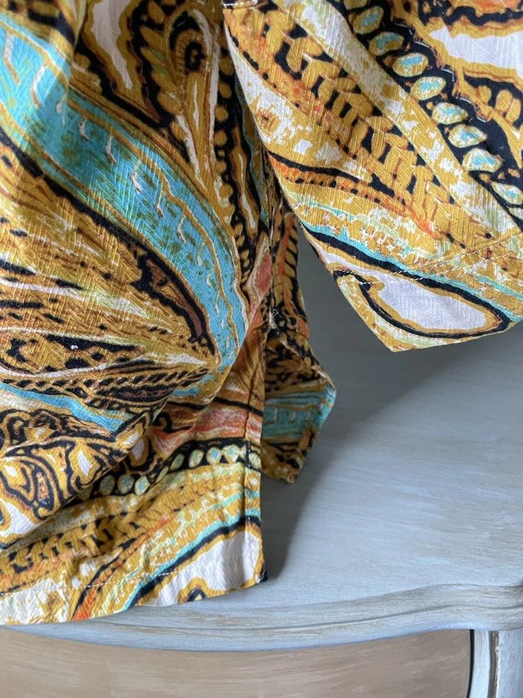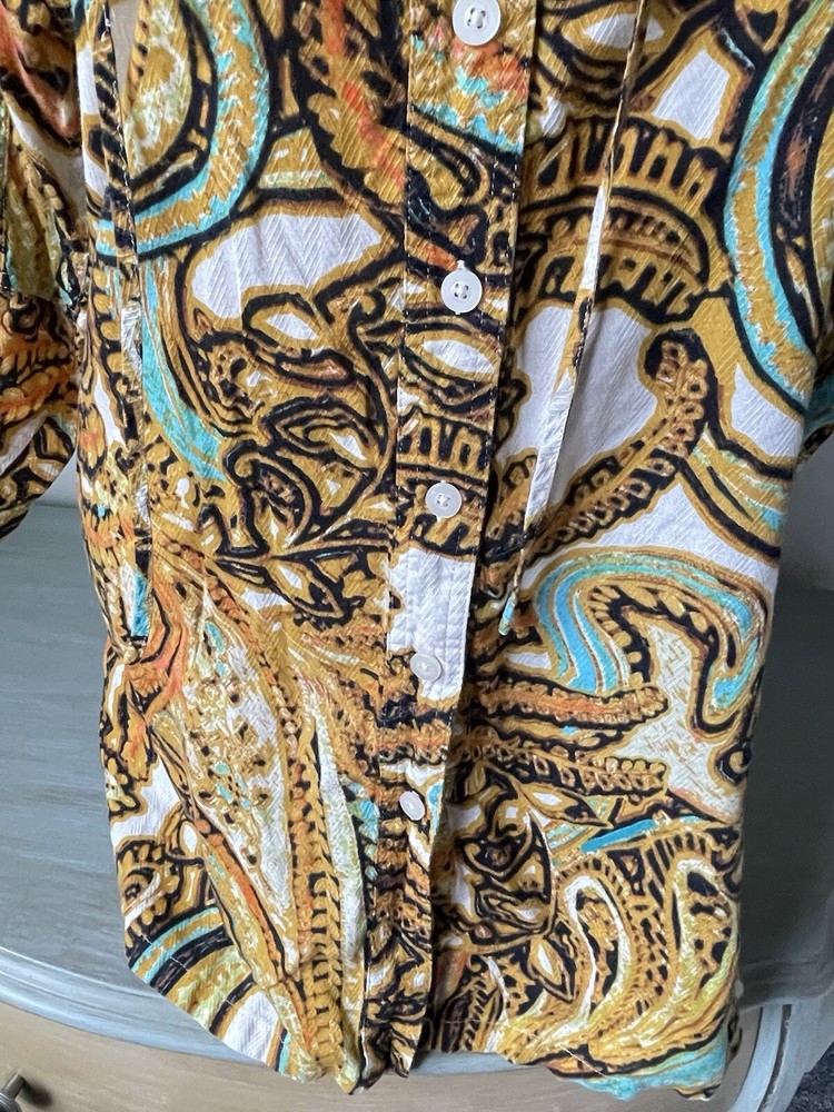 Colorful Gold Button V-Neck Tropical Palm Cotton Tee Size L 12 Coastal Regal Fun Top