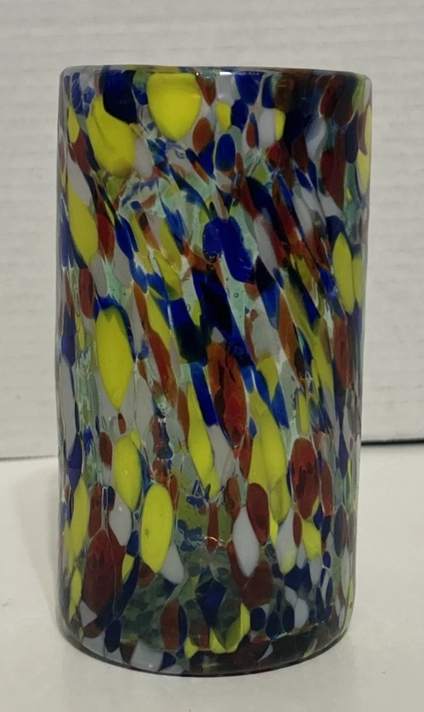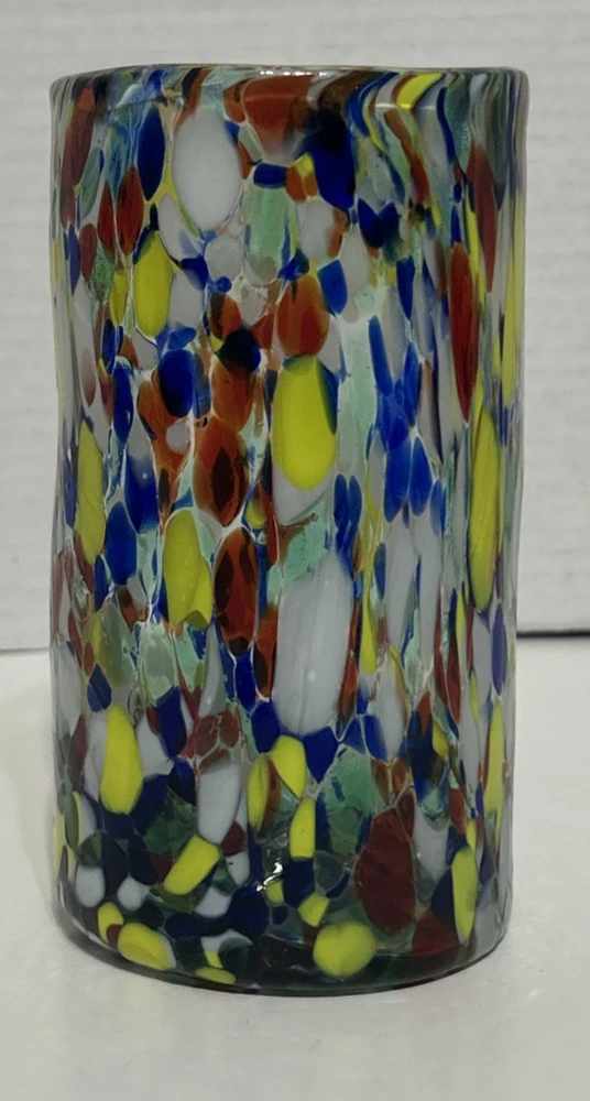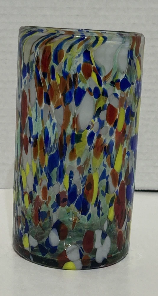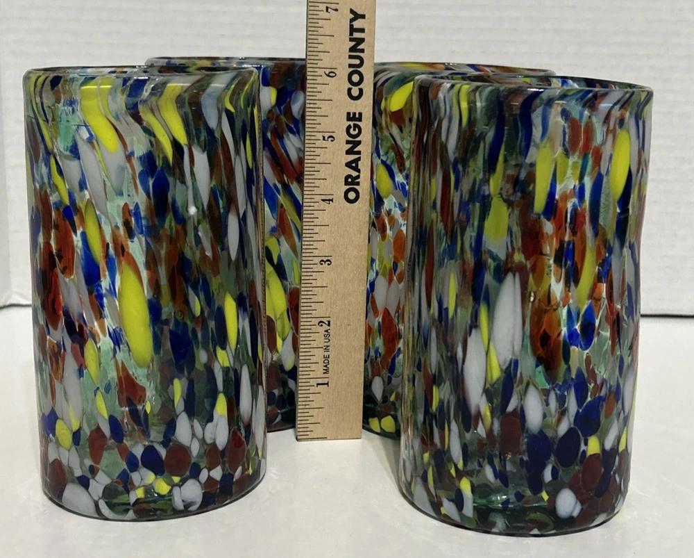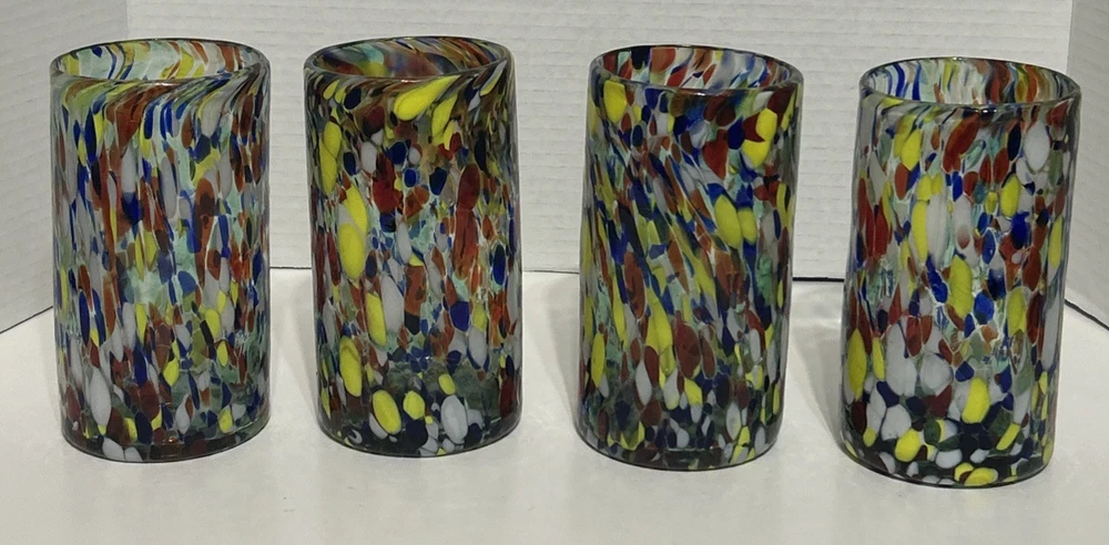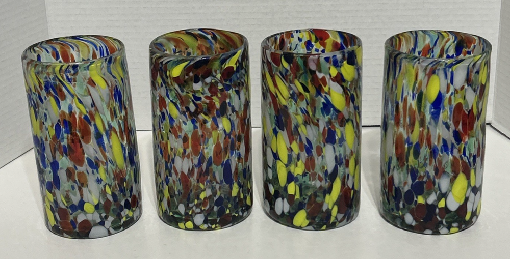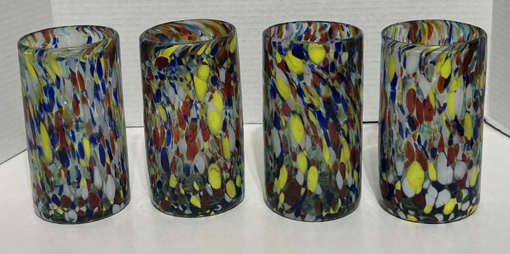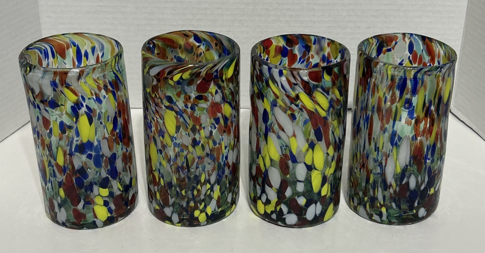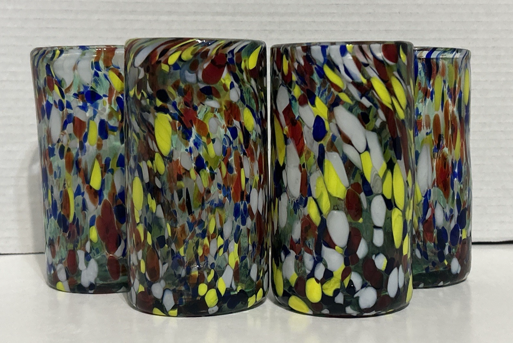 Set of 4 - Hand Blown Glass Mexican Glassware Tumblers Pebbled Confetti Margarita Celebration Glasses - Blue Yellow Red White Swirls Handcrafted by skilled artisans, these hand-blown, colorful glasses feature a timeless confetti pebble design. Glasses are Approximately 24 oz although each glass is 100% Unique so there will be differences. One of a Kind Fiesta Margarita Cinco de Mayo Vase Artist Glass Art Glass Pre-Owned - Please see P ictures for D etails