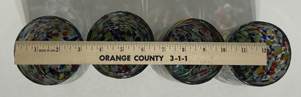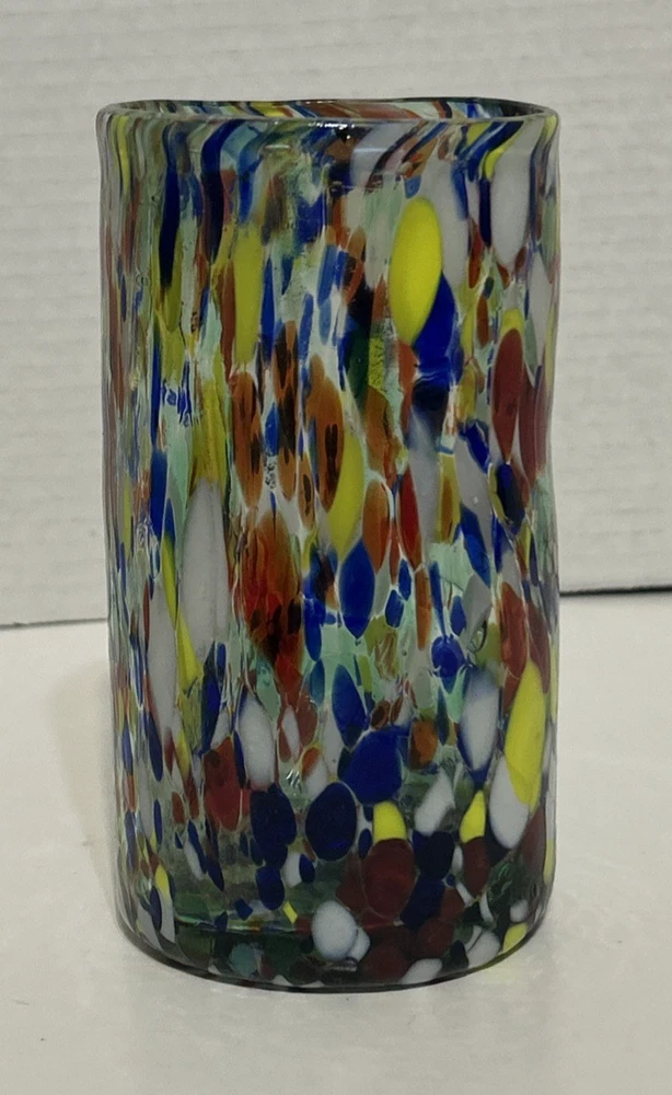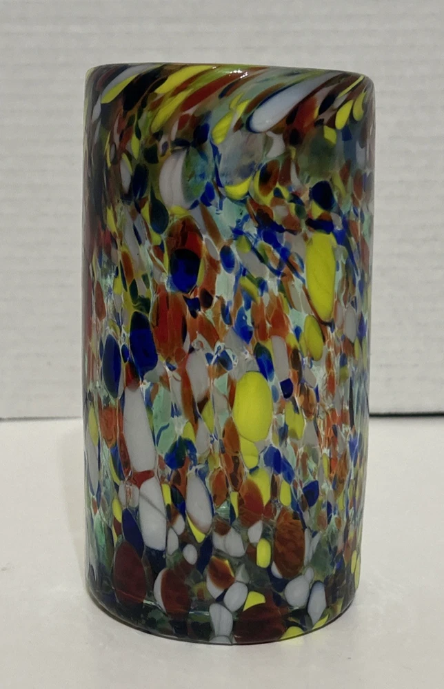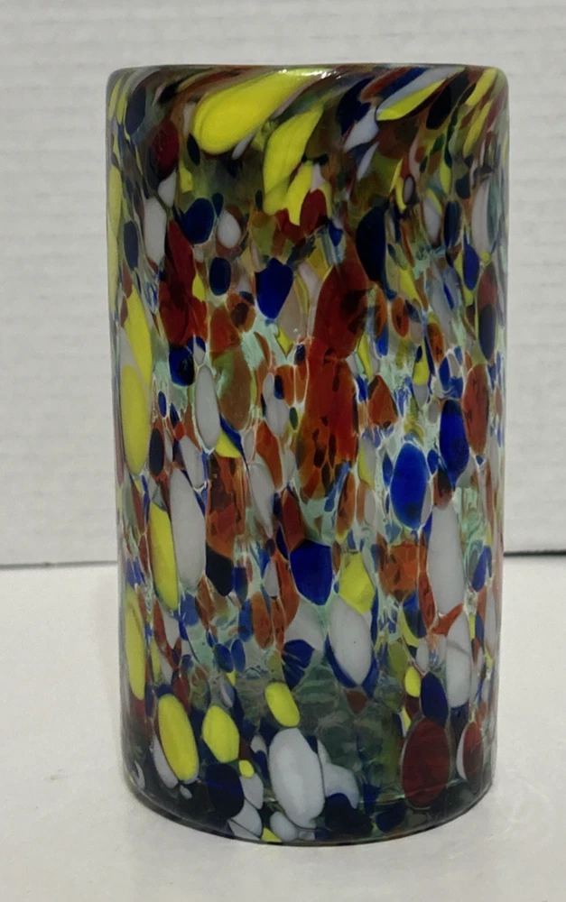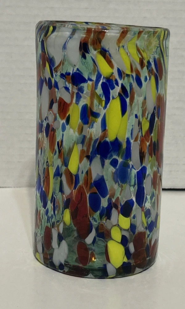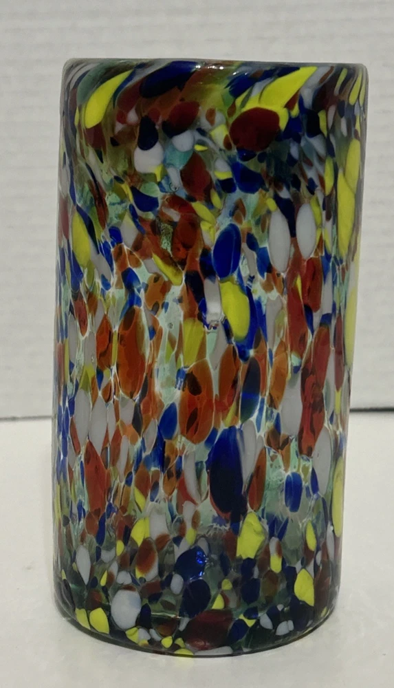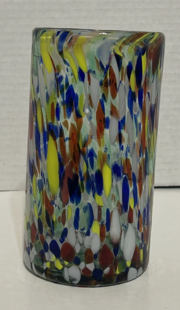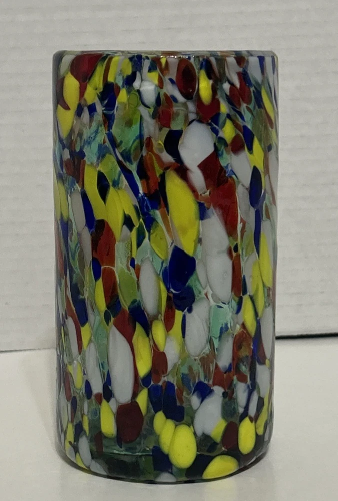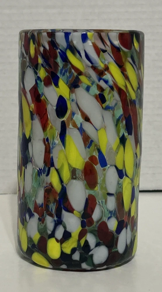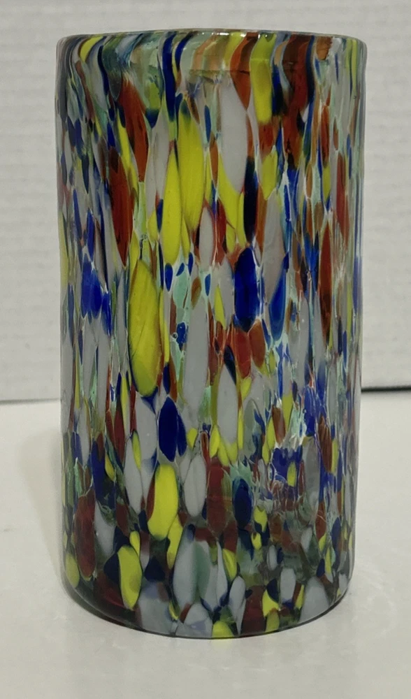 Set of 4 - Hand Blown Glass Mexican Glassware Tumblers Pebbled Confetti Margarita Celebration Glasses - Blue Yellow Red White Swirls Handcrafted by skilled artisans, these hand-blown, colorful glasses feature a timeless confetti pebble design. Glasses are Approximately 24 oz although each glass is 100% Unique so there will be differences. One of a Kind Fiesta Margarita Cinco de Mayo Vase Artist Glass Art Glass Pre-Owned - Please see P ictures for D etails