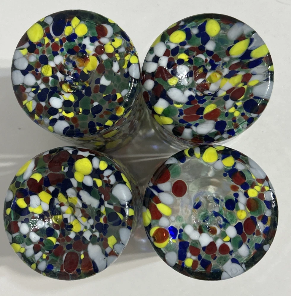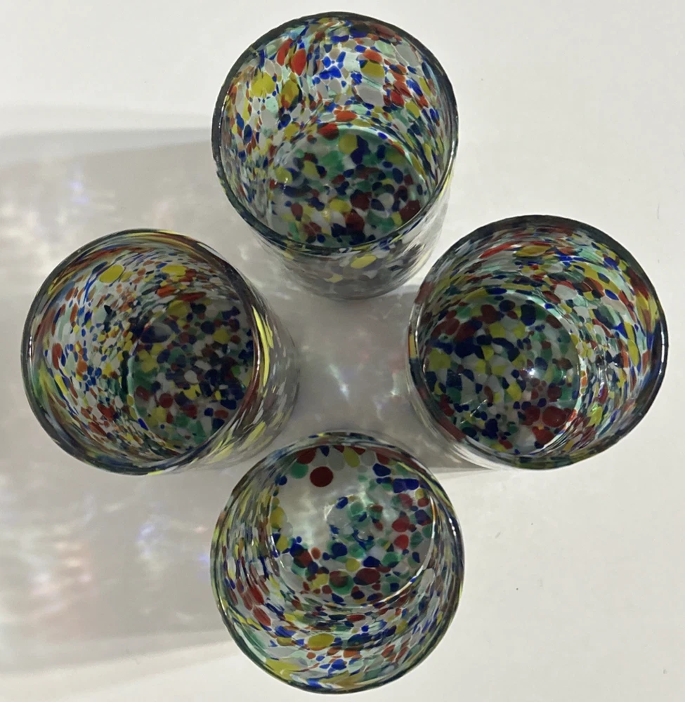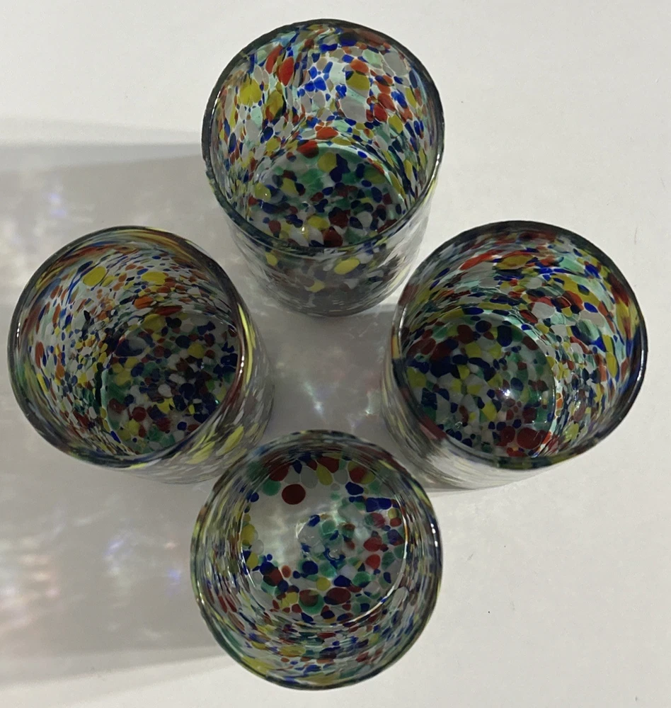 Features: Hand Blown Pattern: Dotted Color: Multicolor Number of Items in Set: Four-Piece Type: Drinking Glass Item Height: 6 in Glassware Type: Glassware Set Set Includes: Tumbler Model: Pebbled Confetti Brand: Handmade Material: Glass