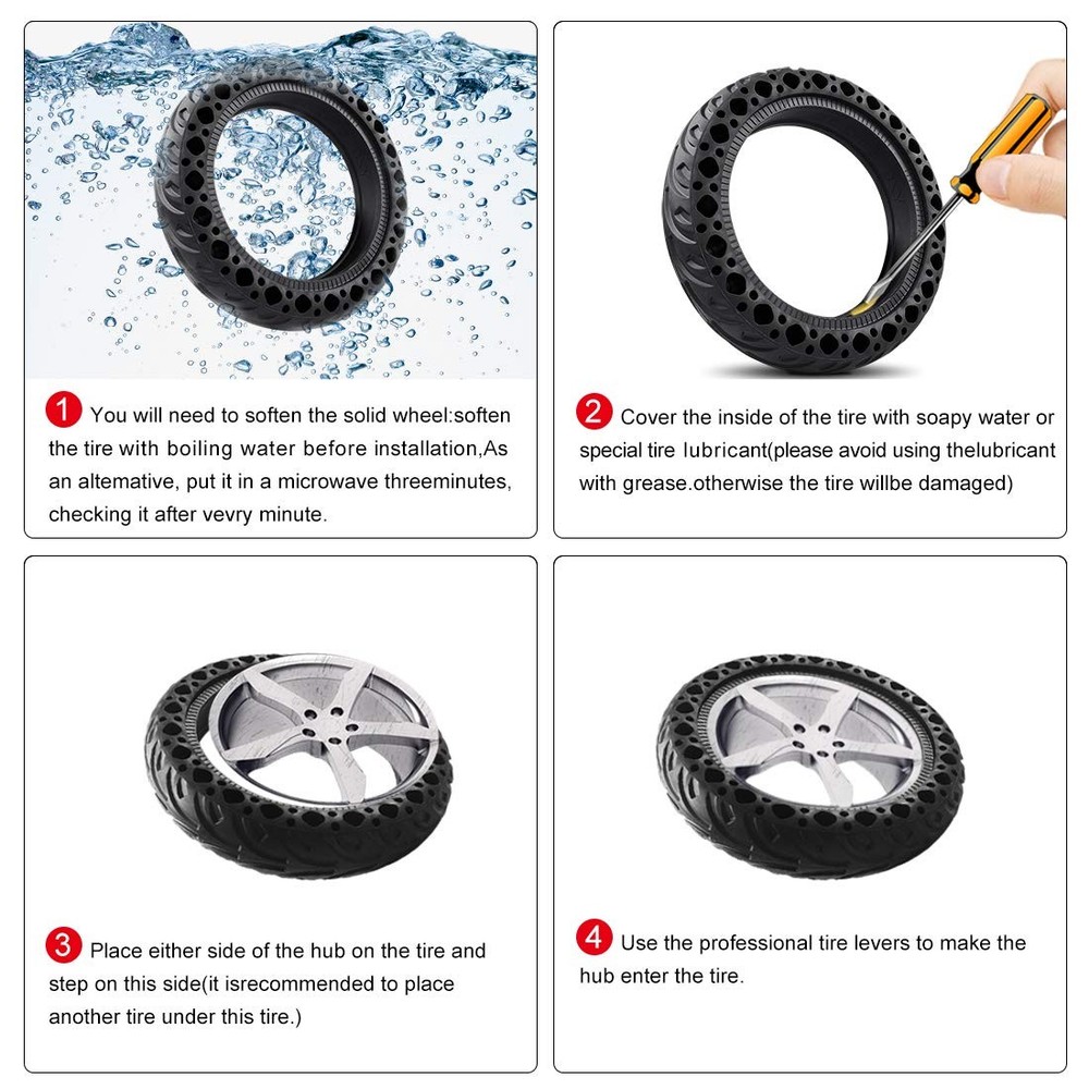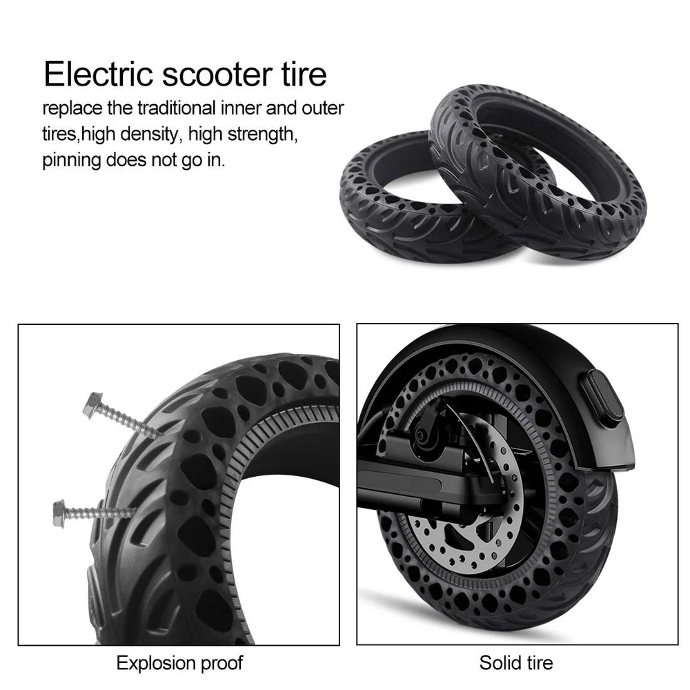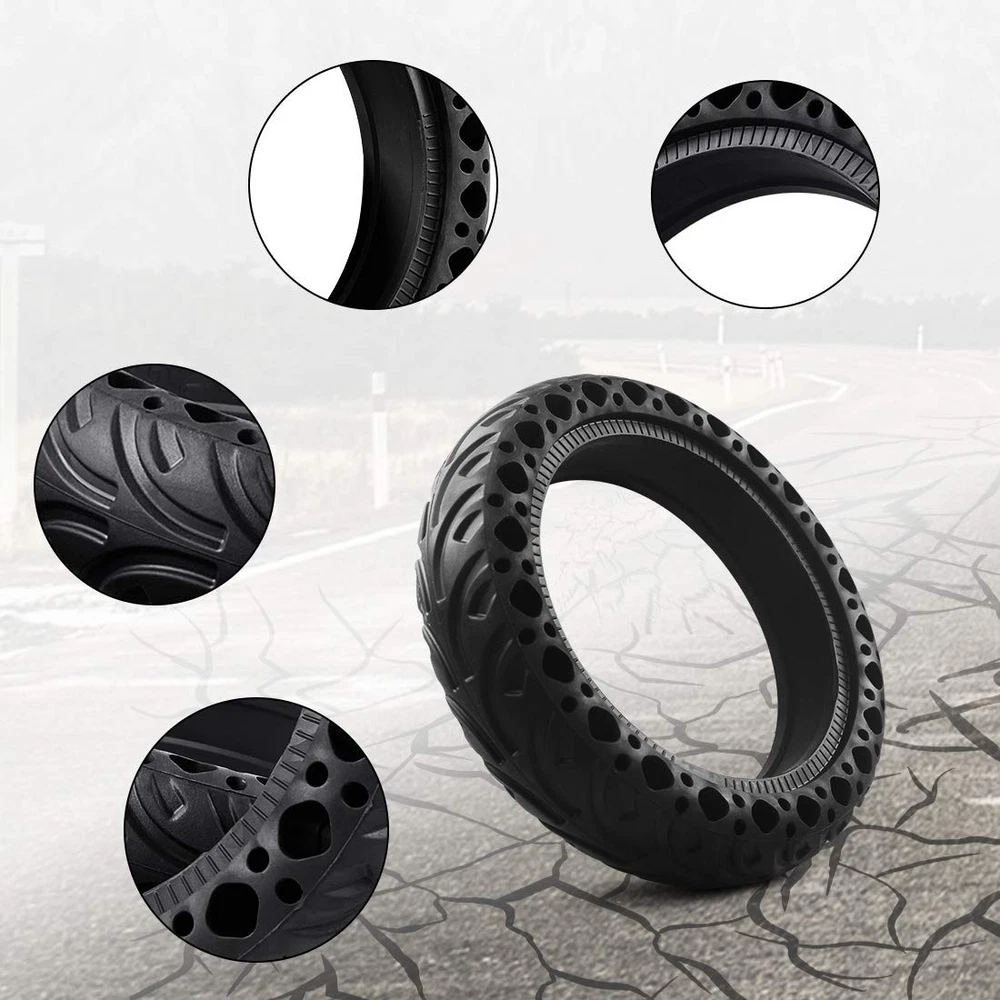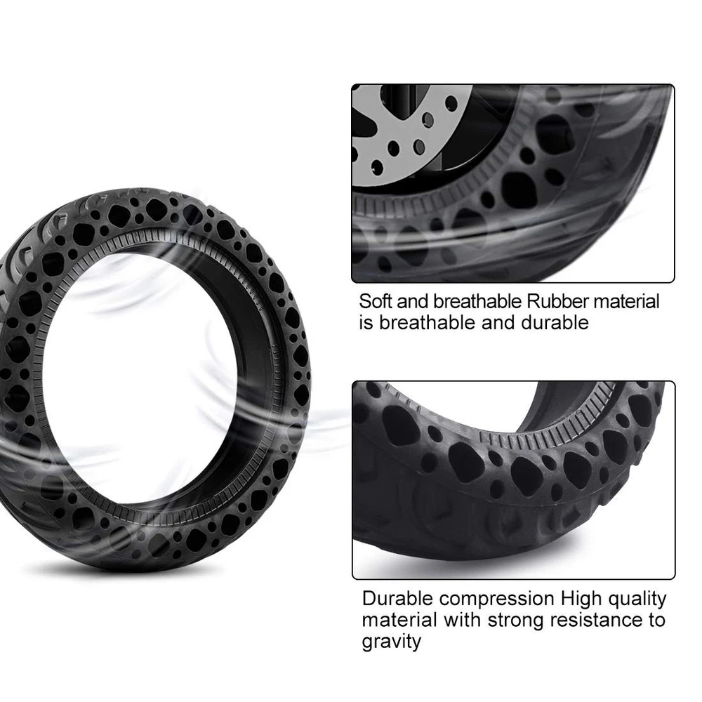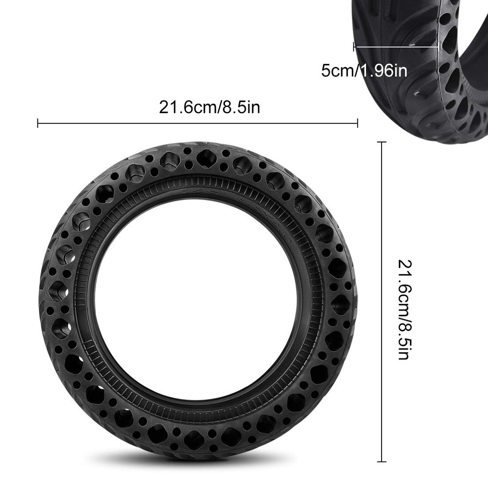 HIGH QUALITY HONEYCOMB SOLID HONEYCOMB TIRES Properties: The wheel has outstanding performance in terms of anti-abrasion, anti-chemical attack, high elasticity and excellent tear resistance. Due to the anti-slip pattern, it can be used on snowy and rainy days.The honeycomb solid tires are compatible with for Xiaomi M365 M365 Pro scooter.There is no longer any need for inner tubes, patch, pump to inflate. It's more practical and durable. With good shock absorption performance, and good seismic Flexible and durable. Specifications: Condition: 100 Percent Brand New Type:electric scooter Solid Tire Quantity: Option one:1 X honeycomb Solid Tire Option two:2 X honeycomb Solid Tire Material: rubber Optional Color: blackRed Inner diameter: 145 mm5.7 inch Outer diameter: 216 mm8.5in Tire thickness: 50 mm5.7 inch 1 PCS tire Net weight : 600.0g Packing quantity: Option one:1 X honeycomb Solid Tire Option two:2 X honeycomb Solid Tire Honeycomb tire design - Honeycomb design tire More slip resistance and grip,anti-slip pattern, it can be used on snowy and rainy days to play safely on the scooter.These tires are explosion proof and pressure resistant to the characteristics of high load capacity and long life,and it is more convenient for customers to install and disassemble, and more flexible. High - quality electric scooter honeycomb Solid tires - Electric scooter tire made of natural rubber. the high quality durable rubber is built to withstand thousands of miles of use.Grooved surface provides an excellent grip, explosion-proof and resistant pressure, resistant to abrasion lightweight and durable. High Resistance - Solid tires are developed to cope with irregularities on the road, the shape and durability of honeycomb tires. The tires are made of natural rubber to maintain the flexibility of the pavement and polymer to increase strength. Flexibility - The tire is easy to use and replace, it adjusts flexibly and fixes firmly.The solid tires adapt to both front and rear wheels. You can use 2 solid tires, or 1 solid tire and 1 tire with inner tube, it depends on your need. Solid and durable and perfectly compatible - The honeycomb solid tires are compatible with for Xiaomi M365 / M365 Pro scooter.There is no longer any need for inner tubes, patch, pump to inflate. It's more practical and durable. With good shock absorption performance, and good seismic Flexible and durable. Wheel size: 8.5 inches