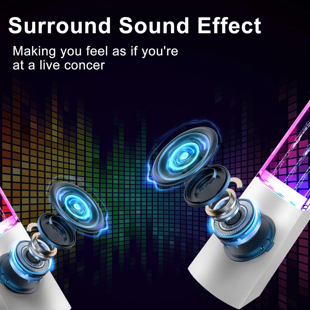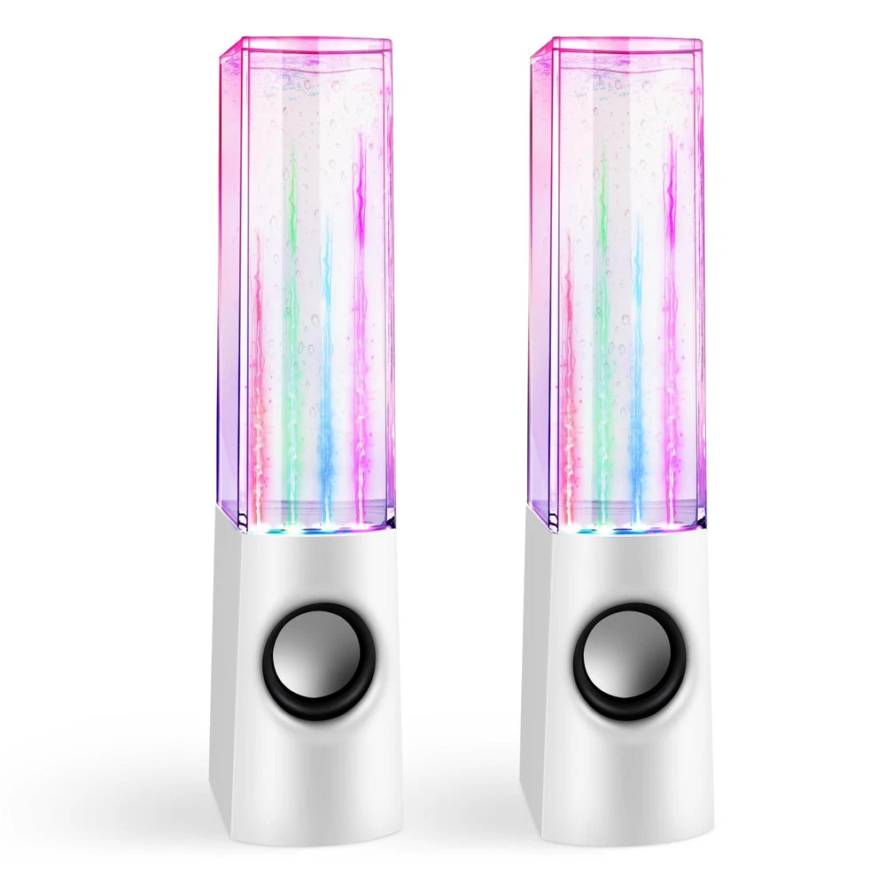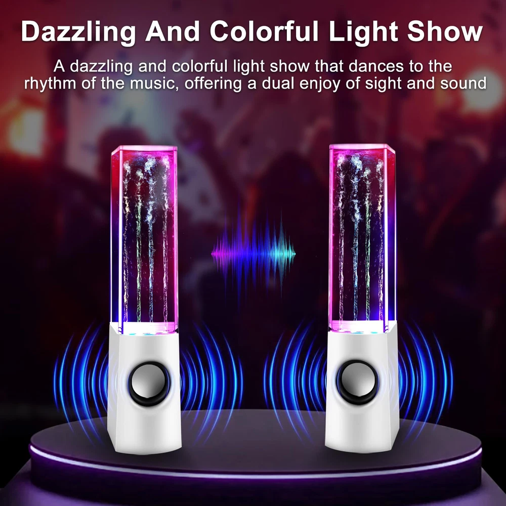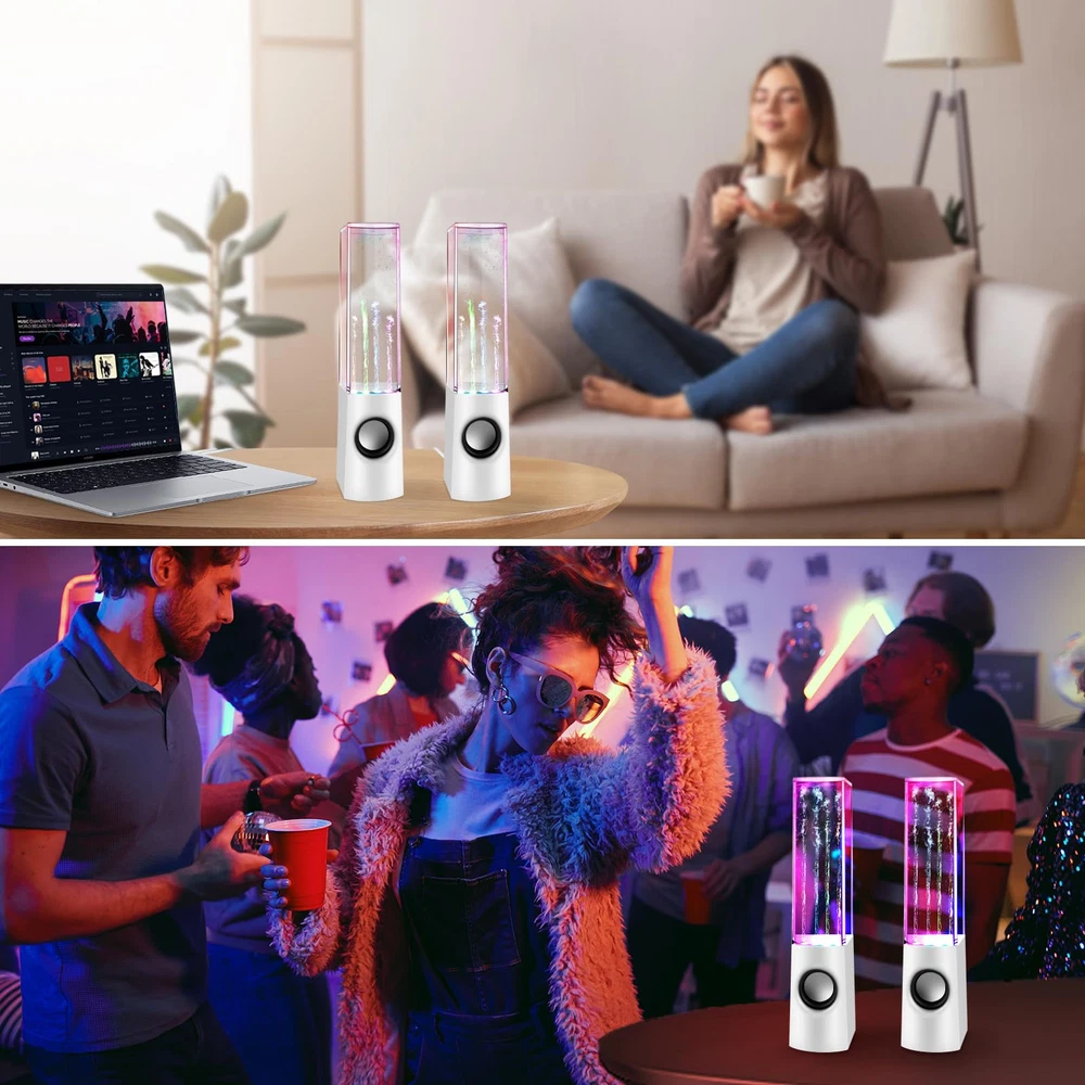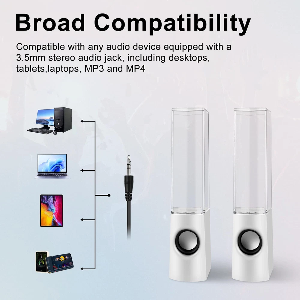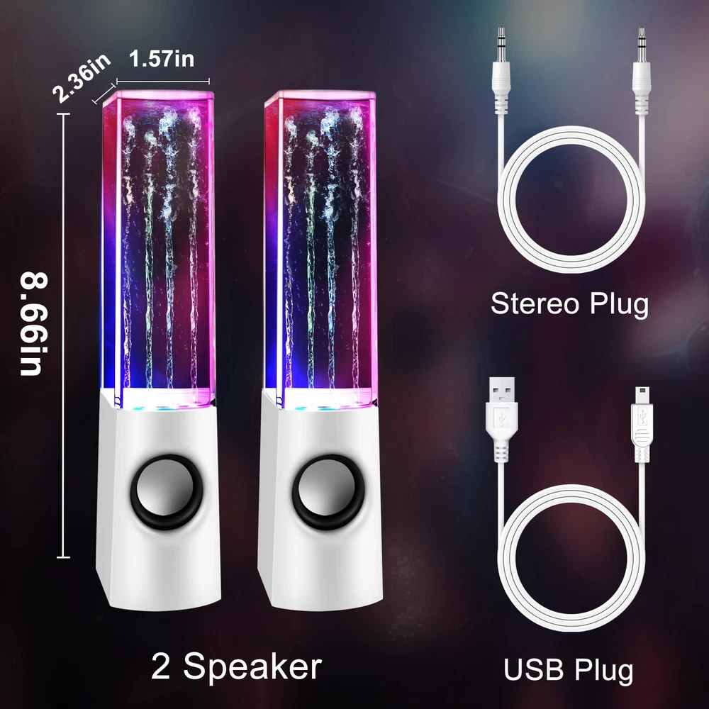 Introducing our extraordinary loudspeaker box with a captivating LED display, designed in the form of a mesmerizing water fountain. Immerse yourself in a breathtaking world where water and light intertwine, creating a vivid and colorful spectacle. Control the water fountain jets with the integrated speakers, synchronized perfectly with the volume, resulting in a stunning visual experience accompanied by a captivating multi-colored LED light show. Experience crystal-clear and lifelike sound with our amplifier speakers, delivering exceptional audio quality when connected to your phone or computer. The surround sound effect provided by a pair of speakers ensures an immersive and relaxing atmosphere whenever you return home. These water speakers with dancing lights are compatible with any audio device equipped with a 3.5mm stereo audio jack, including desktops and laptops. Effortlessly connect and enjoy an excellent desktop companion that adds a touch of modern appeal to your home or office space. They also make for an ideal gift for your children or friends.
