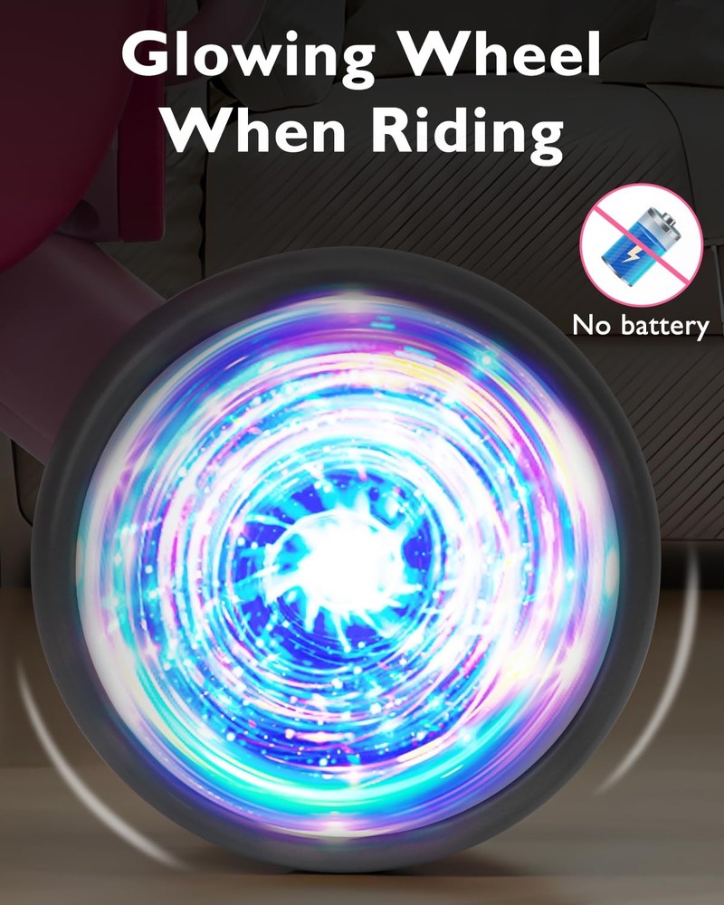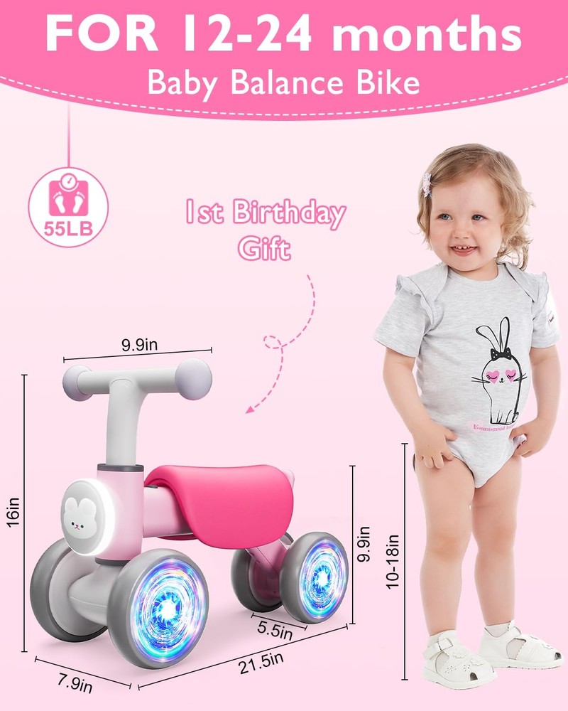 blance bike GLOW WHEEL: Cool colorful lighted 4 wheels are more eye-catching to make babies more interested, inspires their curiosity. Bring more fun to your baby.No extra energy supply required, colorful light can be emitted just by rotating the wheel.The headlights (need batteries)enhance visibility, adding a safety feature for evening rides SOFT MUSIC: The balance bike built-in 5 songs and 5 cute animal sounds on the tail button, the cute music makes the baby more willing to move and enjoy the fun of sports. The combination of movement and music together promotes the development of children's perceptual ability and body coordination SAFE AND STABLE DESIGN: The balance bike has a 135° turning limit design to avoid side falling,Low centre of gravity design,Stop when you baby land. Self-balancing design to prevent tipping, The sturdy frame and wide, grippy tires offer stability and control,built to withstand the rigors of toddler play while providing a smooth and comfortable ride EASY TO ASSEMBLE: Balance Bike can be easily assembled in just 4 steps, upgraded self-locking buckle and screws double locking wheels, no need to worry about tires falling off, great protection of the baby's safety BEST FIRST BIRTHDAY GIFT :The colorful lighting toddler balance bike is sure to delight any young children aged 12-24 months and provide hours of entertainment. It's a thoughtful and practical present that promotes active play and outdoor exploration from an early age.