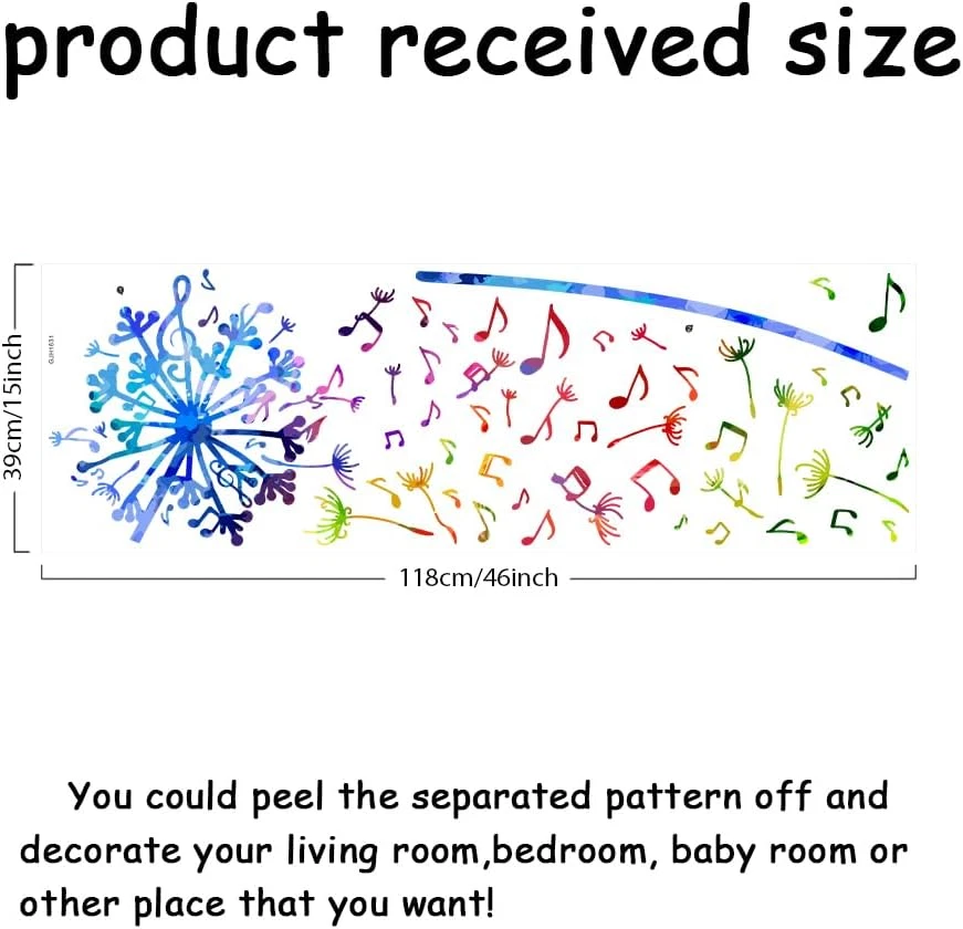 Colorful Dandelion Wall Stickers: 1 sheet of colorful dandelion music note wall sticker which is stunning, unique and suits a variety of people. The wall sticker is perfect for homes, community halls and schools. Bedroom Decor: This watercolor wall stickers will make any nursery, child's bedroom, or playroom feel warm and friendly. Beautiful DIY decoration for nursery, classroom, bedroom, girls room, hallway or playroom. Individual Peelable: All patterns can be peeled and pasted individually. The sheet size of the stickers is about 46x15in/118x39cm. Note: The scene picture is for reference only, please refer to the dimension mark for the actual size. Semi-transparent & Peel and Stick: These stickers are self-adhesive, just peel and stick and all is well done. Semi-transparent material makes it possible to use on transparent surface. Perfect Room Decoration: It can be used on any smooth, dry and clean surfaces door, wall, living room, bedroom, hotel, and etc. Product Description SUPERDANT Colorful Wall Stickers Boho Plants Color Blocks Stikcers Suitable for decorating bedroom, living room, nursery room, playroom, and more Farm Animals Stickers for kitchen / framhouse themed room decorations Flowers Stickers Roses / Dandelion / Potted Plant / Tropical Plants for Bedroom, Living Room Decoration 1 For Living Room 2 For Kitchen 3 For Bedrrom Trendy Stcikers Add to Cart Add to Cart Add to Cart Add to Cart Add to Cart Add to Cart Add to Cart Customer Reviews 4.4 out of 5 stars 19 3.1 out of 5 stars 5 4.1 out of 5 stars 13 4.3 out of 5 stars 37 4.2 out of 5 stars 12 3.6 out of 5 stars 5 4.2 out of 5 stars 5 Price $12.49 $ 12 . 49 $11.59 $ 11 . 59 $9.99 $ 9 . 99 $12.09 $ 12 . 09 $9.99 $ 9 . 99 $13.39 $ 13 . 39 $9.99 $ 9 . 99 Themes Flowers Flowers Fuits Country Butterfly Moon Phase Mountain Styles Nature Modern Vintage Vintage Nature Abstract Nature Suitable for Living Room Bedroom Bathroom Living Room Bedroom Kitchen Kitchen Living Room Bedroom Bathroom Living Room Bedroom Bathroom Living Room Bedroom Bathroom Colorful ✔ ✔ ✔ ✔ ✔ ✔ ✔ Reusable ✘ ✘ ✘ ✘ ✘ ✘ ✘ Glow in The Dark Wall Stickers Glow in The Dark Wall Stickers Glow in The Dark Wall Stickers