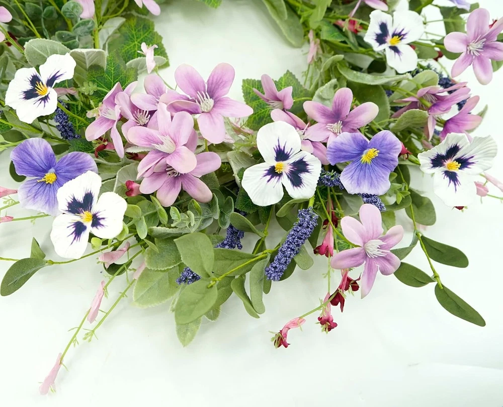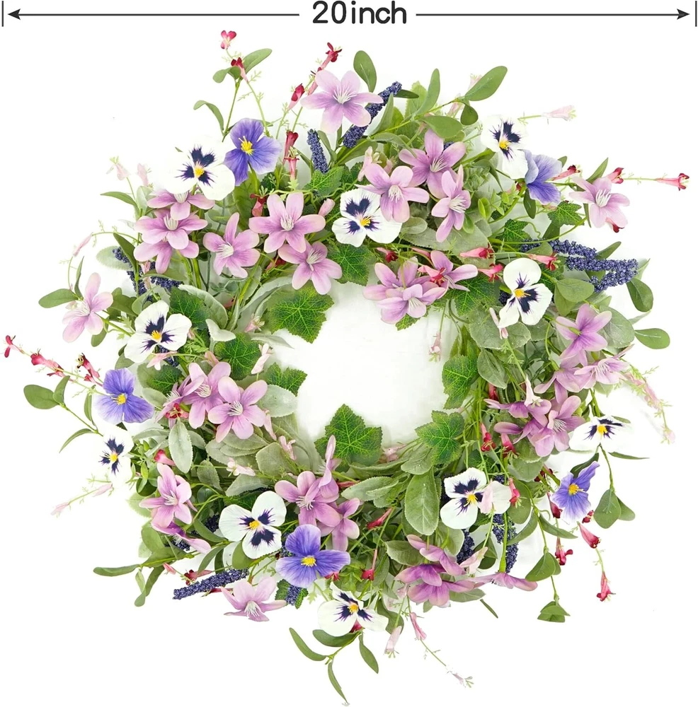 Spring Wreaths for Front Door Summer Wreath with Pansy Flower Lamb Ear Leaves Color: White Pansy and Lavender Flowers B Material: Silk Shape: Round" or "Oval Product Dimensions: 20"D x 20"W x 5"H Occasion: Multi-purpose ADJUST WREATH SHAPE : branches of the spring summer wreath are made of bendable wire, so you can shape things as you go, and keep monkeying with them until you make it look just as you want. Please adjust or bend the branches on the wreath and arrange the pansy flower heads upward for best display.,the maximum size of wreath can be 20". VERSATILE DECOR:This spring summer floral wreath is suitable for front door, wall, indoors,outdoors,window,fireplace,farmhouse, living room, porch, centerpiece party, wedding, holiday and festival celebration. It will provide your home a feeling of natural and vatality. BEST FRIENDS FOR spring summer wreath : Suitable for spring, wedding, home, wall, window, front door, fireplace, living room, bedroom, dining room, fireplace, porch, window and other indoor and outdoor decoration. Add glamour to your spring and summer season with this striking pansy and lavender wreath. EASY CLEAN: The handmade wreath is convenient to clean, just wipe it with a try towel to make the wreath like brand new. The green leaves and branches are not easily falling apart. This wreath can be used for a long time. PACKAGING DESIGN: we pack the wreath to gift box and we Tighten the wreath when packing so that the wreath can be protected when delivery,pls open and fluff the wreath and adjust the branches,flowers, the maximum size of wreath can be 20". Return Policy: We offer a 30 day return policy from the receiving date. Please contact us for a Free Return Label. Please use our return label so it will go back to our supplier and we can do a refund or replacement afterwards. Feedback: Your satisfaction is very important to us! If you have any problem with your order, please contact us and we will do our very best to make you satisfied. As long as you are happy with your purchase, please leave a positive feedback for us. We will always leave you a positive feedback in return. If you have any problem with your purchase, please do not leave a negative feedback. Please Contact us ... and your issue will be solved quickly and positively We are a small family-owned business trying to make a living, not a huge company that does not care ... We will ALWAYS do our best for you!