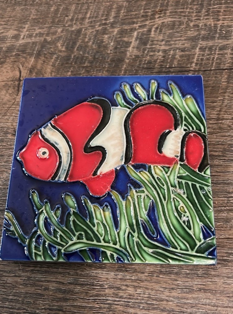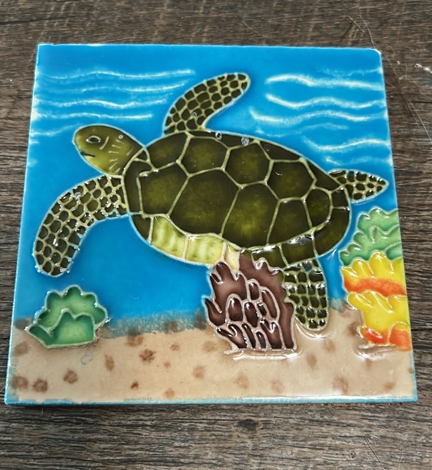 Sea Turtle Clown Fish Swimming in Coral-Seaweed Coastal 4x4 Ceramic Tiles Cork Back to Hang on wall Hand crafted and Painted