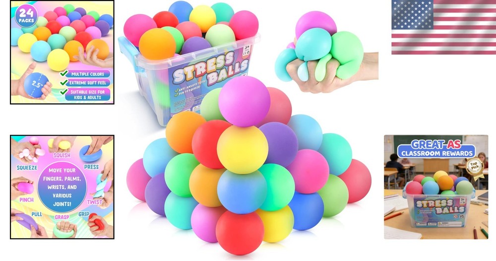 Colorful Stress Balls 24 Pack Embrace a world of vibrant colors and soothing sensations with our 24 Pack of Colorful Stress Balls, designed to bring joy, relieve anxiety, and enhance sensory engagement. Ideal for all ages, these squishy companions are your passport to a calm mind and joyous play. Features: **24 Pack Stretch Balls**: Soft, elastic sensory balls that provide endless squishing fun. **Fidget & Relaxation Tool**: Perfect for stress relief, anxiety management, and sensory stimulation. **Durable Design**: Crafted from high-quality TPR material, ensuring resilience for repeated use. **Perfect Size**: Each ball measures 2.5 inches, making it comfortable to hold and ideal for fun tactile experiences. **Slow Rising Action**: Squeeze and watch them slowly regain their shape, captivating everyone around. **Versatile Uses**: Suitable for home, school, office, or as party favors and gifts—endless possibilities await! Benefits: **Stress Relief**: Effortlessly alleviate tension through squeezing and stretching. **Improved Focus**: Ideal for individuals with ADD/ADHD, OCD, autism, or heightened anxiety levels. **Sensory Engagement**: Provides tactile stimulation that can enhance concentration and coordination. **Family-Friendly**: Safe and enjoyable for children and adults alike, catering to diverse needs. **Gifts with Purpose**: A thoughtful choice for birthday gifts, party favors, or festive stocking stuffers. Why Choose Our Colorful Stress Balls? Transform your stress relief routine with our enchanting 24 Pack of Colorful Stress Balls. Each charming sphere invites you to experience the ultimate relaxation through their soft, squishy textures and playful colors. Whether you’re a student needing focus, a professional seeking calm, or a parent aiming for attention-grabbing fun, our stress balls are designed for you. Don’t just manage stress; embrace it with a squeeze! Order your set of Colorful Stress Balls today and indulge in the delightful sensation that everybody loves. Perfect for any setting, they are destined to become your indispensable companion in both work and play! Recommended Age Range: 3+ Age Level: 4-7,3-4,12 & Under,1-2,8-11,12-16,17 & Up Color: Colorful Material: Plastic