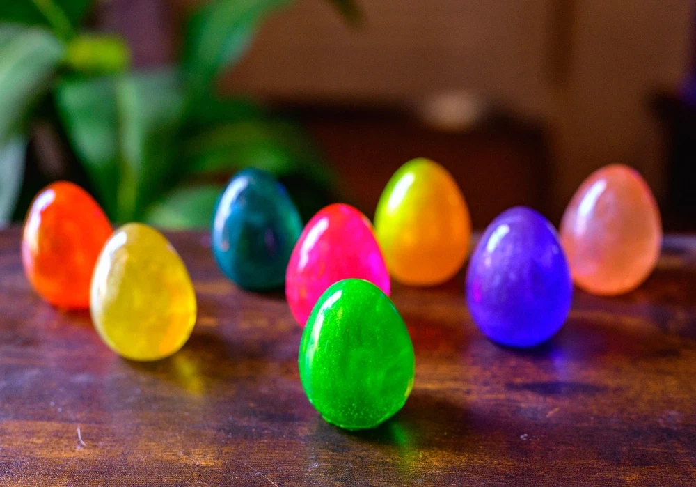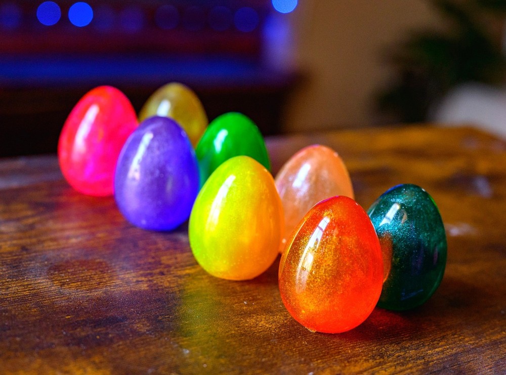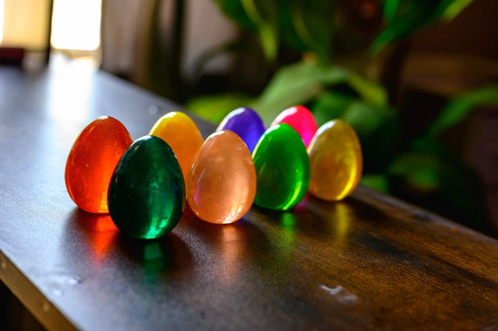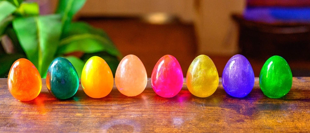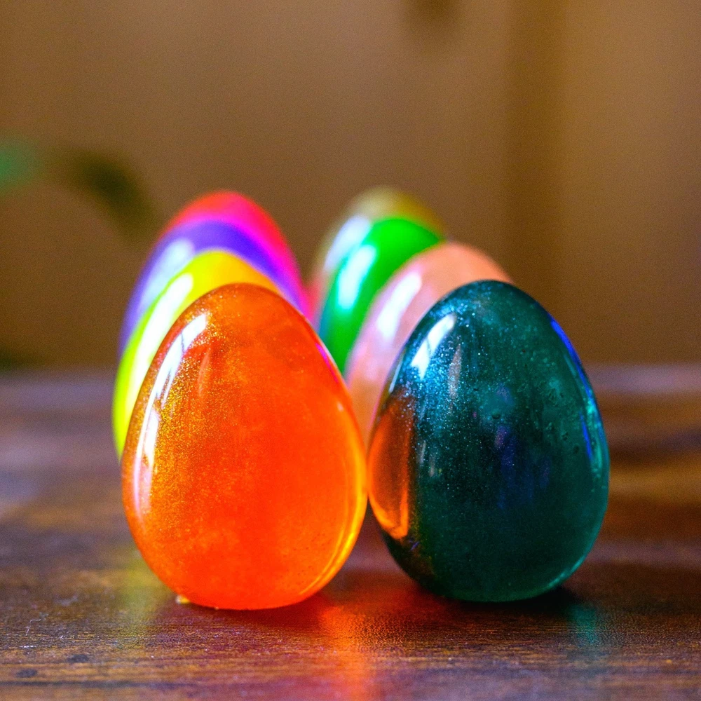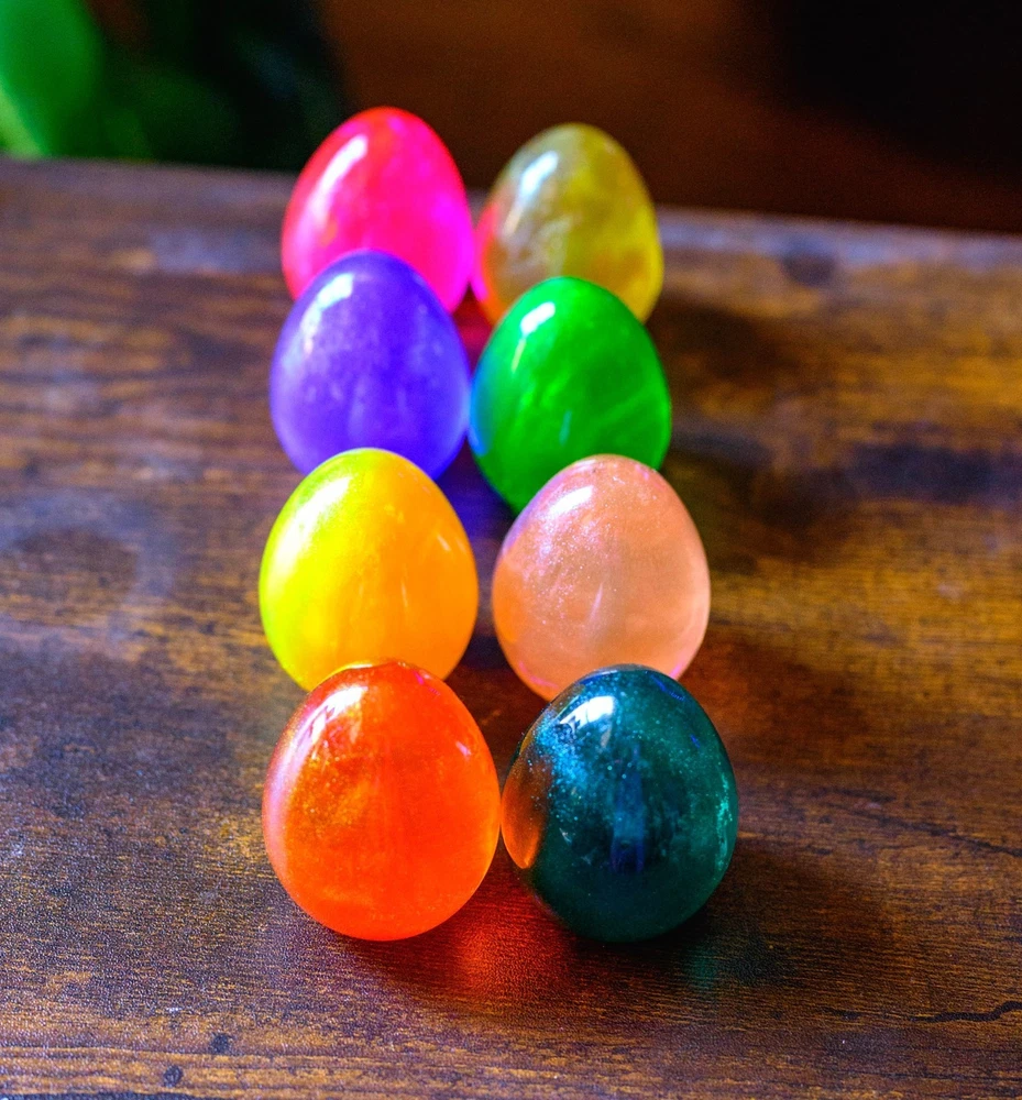 Handmade Translucent Resin Decorative Eggs – Set of 8 Add a bright artistic touch to your home décor with this handcrafted set of colorful resin eggs. Each piece is individually handmade using high-quality epoxy resin and pigments, creating a beautiful glass-like translucent effect that glows in natural light. These decorative pieces are perfect for styling shelves, coffee tables, tiered trays, office desks, or display cabinets. They function as year-round home accents and also make a unique gift for art lovers, collectors, or anyone who enjoys colorful décor. No two eggs are exactly alike — slight variations, color movement, and tiny internal swirls are part of the handmade process and make each set one-of-a-kind. Details: • Set includes 8 resin eggs • Handmade with epoxy resin • Translucent / glass-look finish • Smooth, polished surface • Freestanding display pieces • Indoor decorative use only Approximate Size: Each egg measures approximately 2.25–2.75 inches tall. Perfect For: • Shelf décor • Coffee table styling • Tiered tray décor • Desk decoration • Gift giving • Seasonal displays (spring, summer, Easter, or year-round color accents) Please note: These are decorative art pieces and not intended as children's toys. Your set will be carefully packaged to ensure safe delivery.