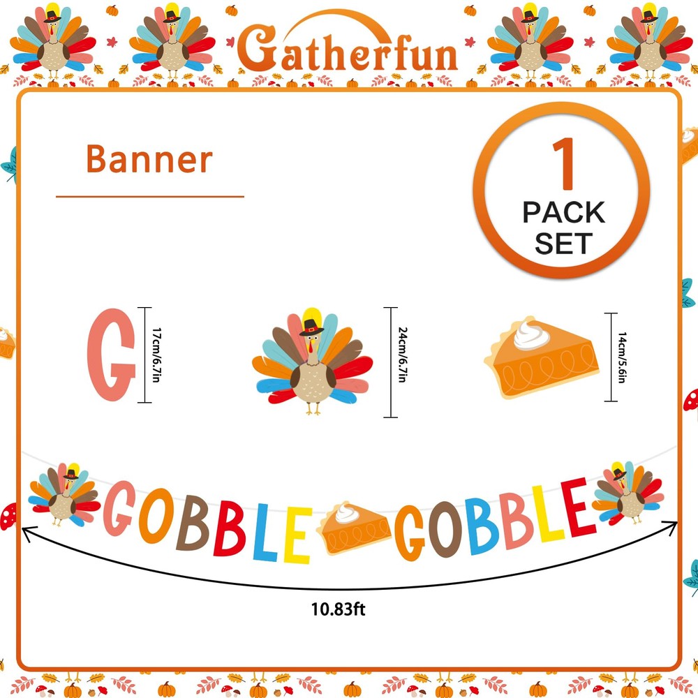 Our Thanksgiving Party Decorations includes a colorful and festive 10.83 feet long "Gobble Gobble" banner, encapsulating the warm and joyous spirit of Thanksgiving. Add a fun and cheeky element to your space with our "Gobble Gobble" banner. It vividly reminds attendees of the delicious meal to come, creating a delightful anticipation that complements your Thanksgiving celebration. Our banner, part of our comprehensive Turkey Thanksgiving Party Supplies, features colorful letters and delightful turkey illustrations, thus adding a joyful and festive touch to your dining area. As we value convenience as much as style, our banner comes pre-assembled with string. It saves you precious time, letting you focus on creating memorable experiences instead of the setup. Not only is our banner a stunning Thanksgiving party decoration, but it's also effortless to install and store. Simple to hang and easy to store when not in use, it effortlessly blends functionality and aesthetic appeal.