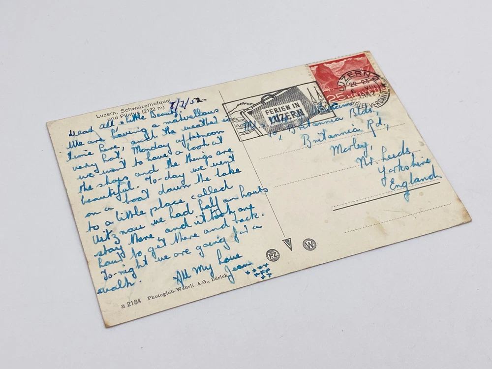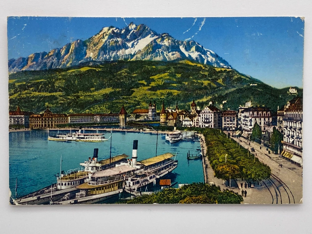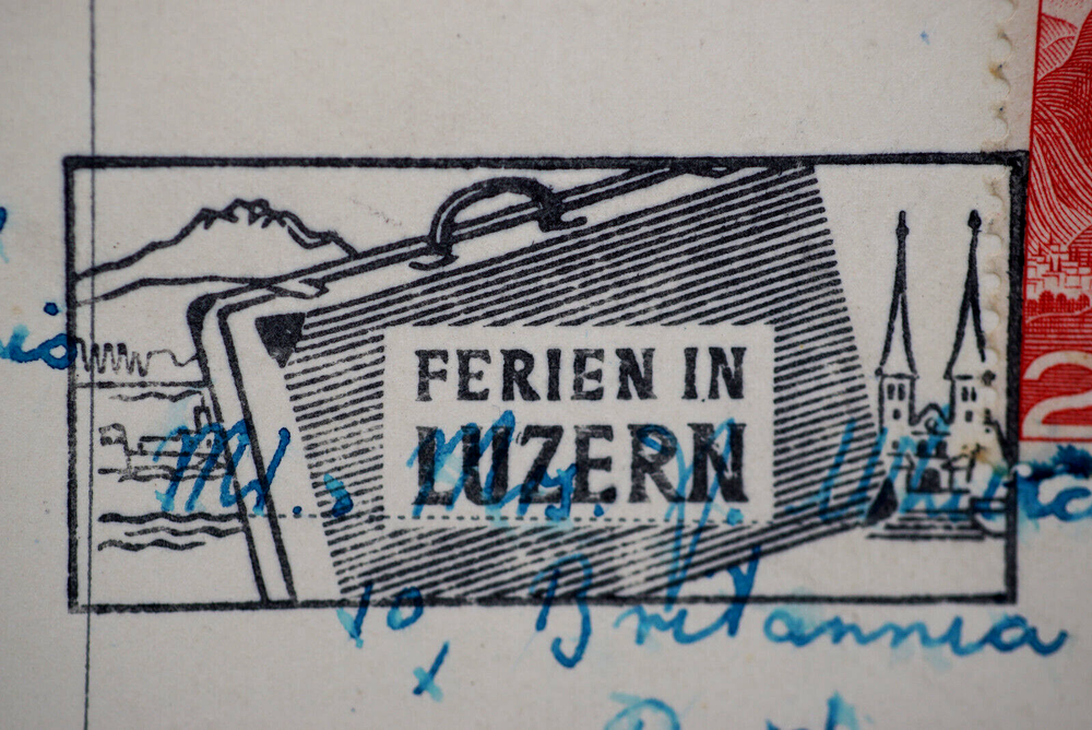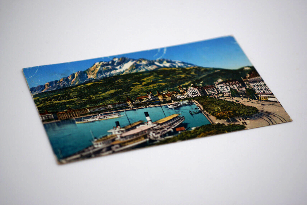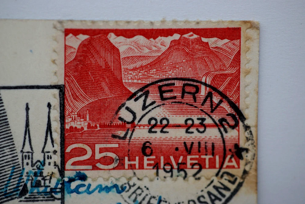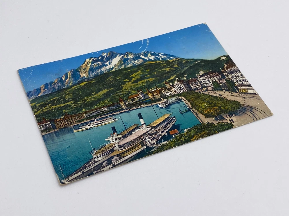 Colorized Postcard Aerial View of Lucerne Schweizerhofquai Luzern Switzerland Posted on 6 August 1952 Posted. Good vintage condition. No visible damage to any of the edges. All corners slightly bent. Heavy creasing. Dirt spots, discoloration, scratches, missing paint and stains marks may be visible on single or both sides of the postcard. Pen writing on the back of the postcard. Good condition for its age . Please look at the photos for condition details.
