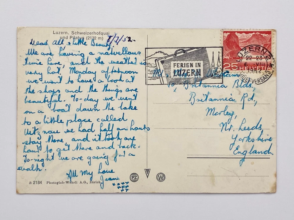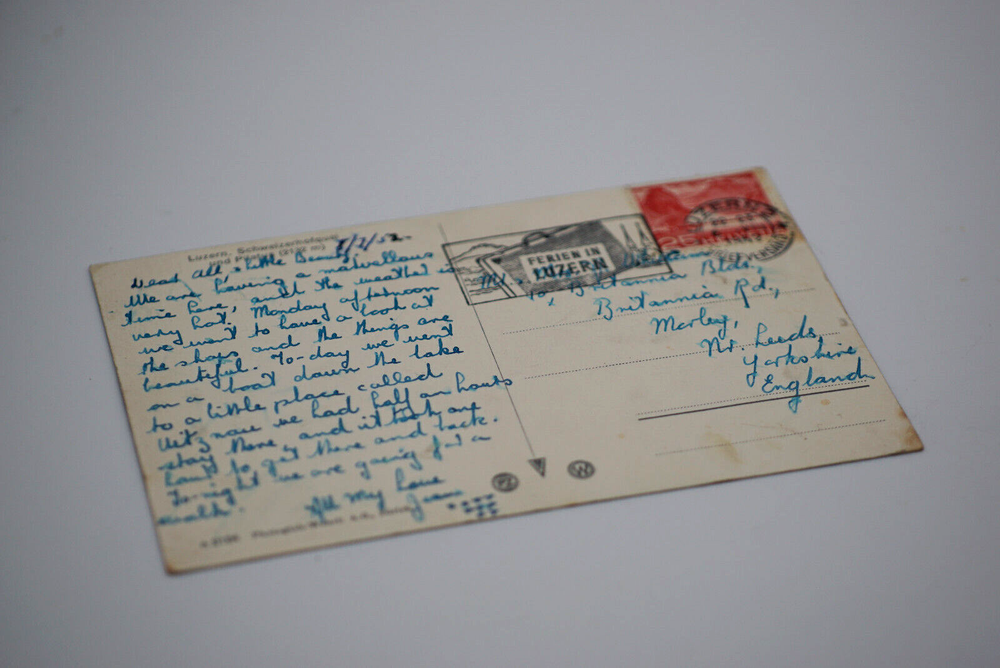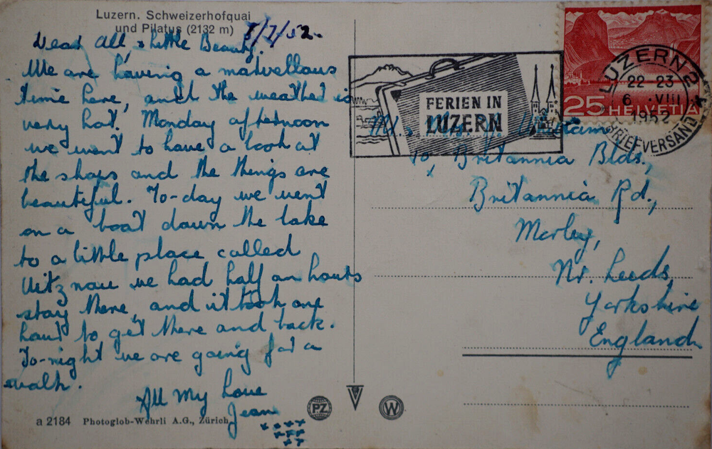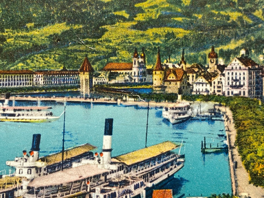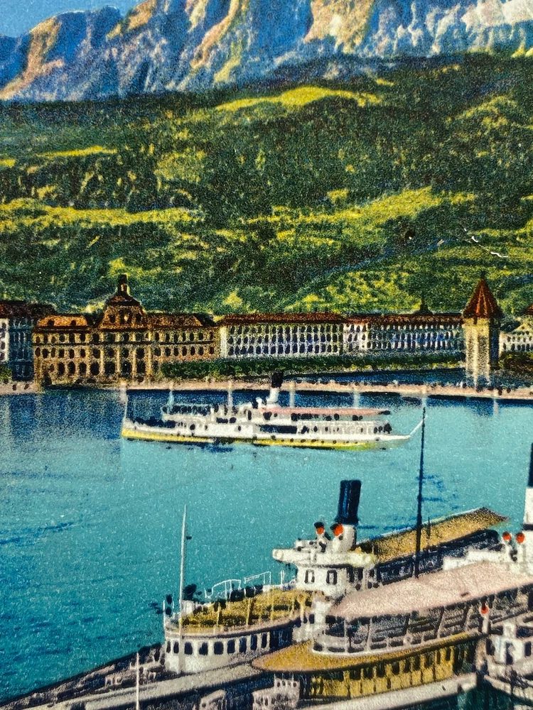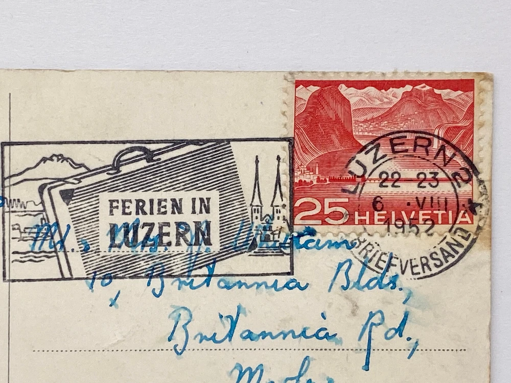 Colorized Postcard Aerial View of Lucerne Schweizerhofquai Luzern Switzerland Posted on 6 August 1952 Posted. Good vintage condition. No visible damage to any of the edges. All corners slightly bent. Heavy creasing. Dirt spots, discoloration, scratches, missing paint and stains marks may be visible on single or both sides of the postcard. Pen writing on the back of the postcard. Good condition for its age . Please look at the photos for condition details.