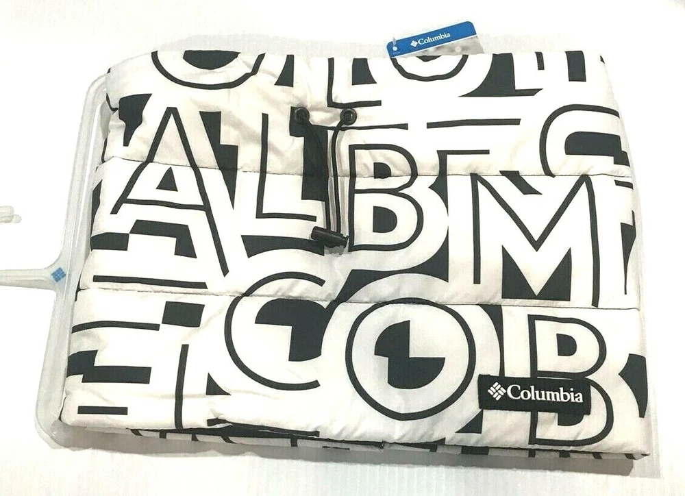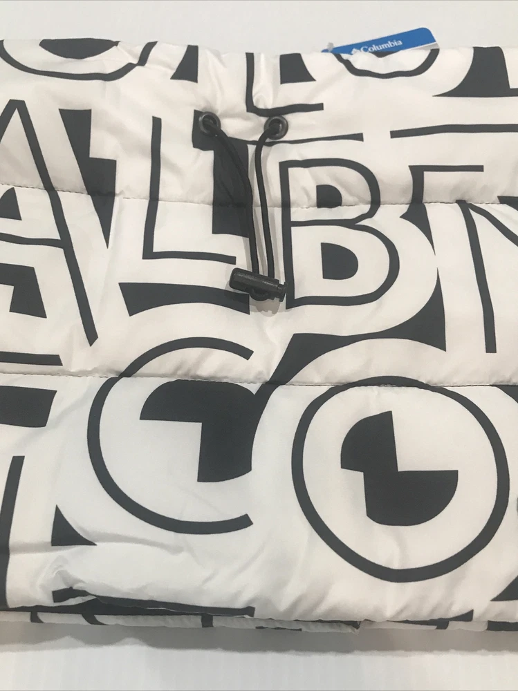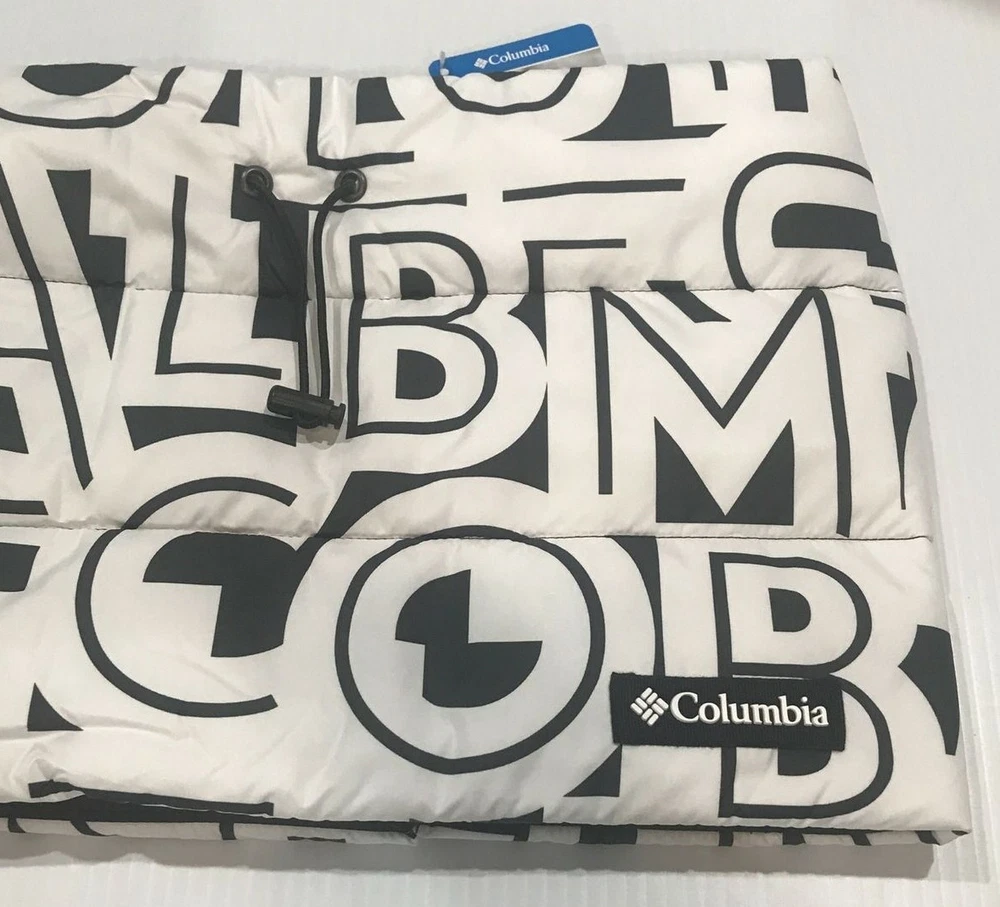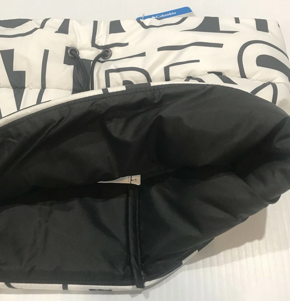 Puffer Gaiter by Columbia Spellout Logo in black on white background Omni Shield Northern Reach Measures 13" across laying flat, so 26" around, 10" high