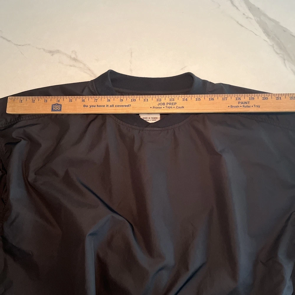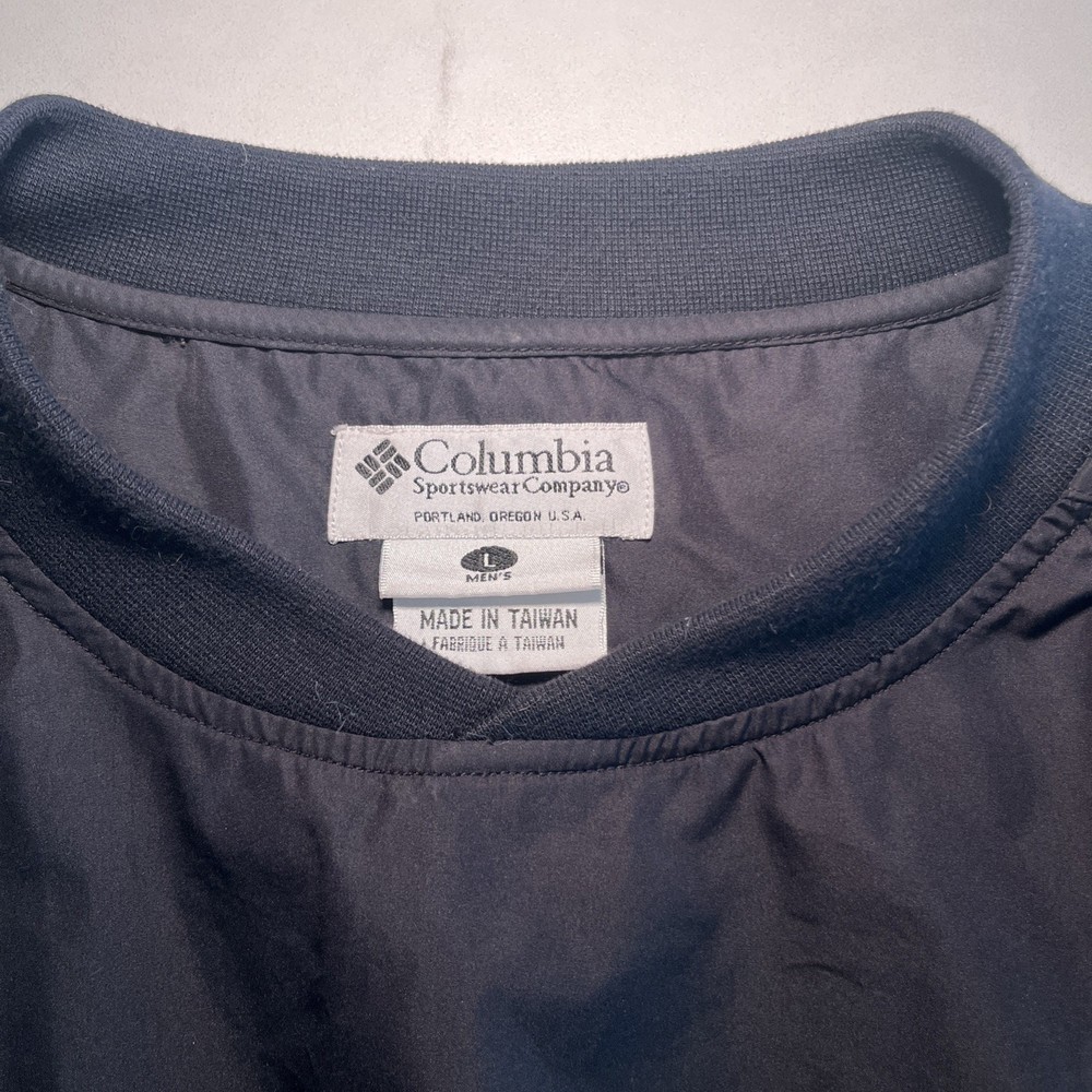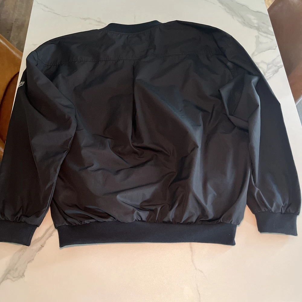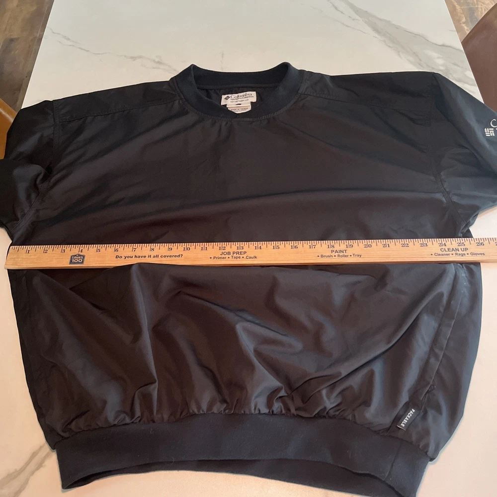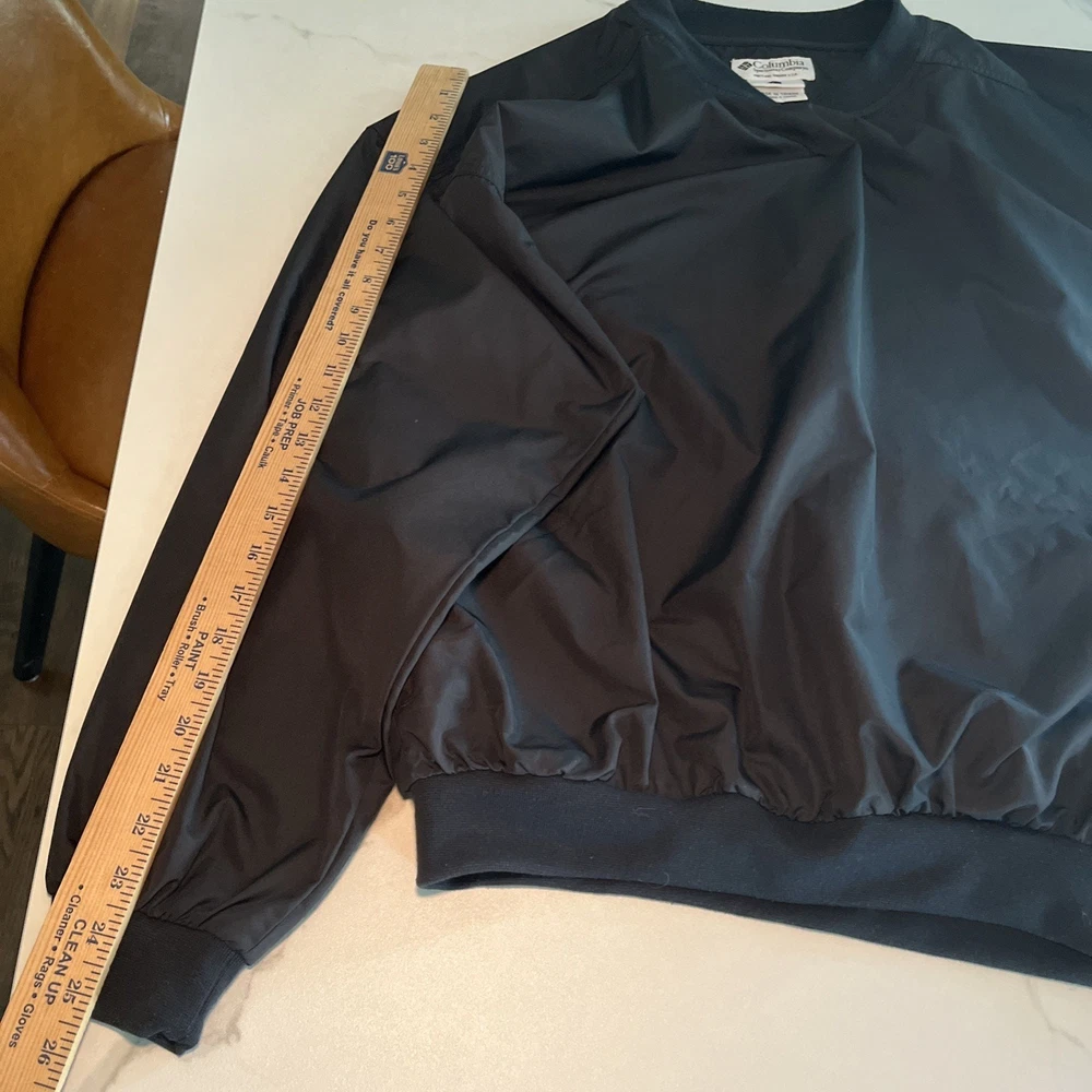 Crafted for the active man, this Columbia Golf Jacket offers versatile functionality across all seasons. The sleek black color and solid pattern make it a timeless addition to any wardrobe, while its lightweight polyester fabric ensures durability and ease of care. With a machine washable design, this jacket is both practical and convenient for both on and off the golf course. The jacket's packable feature makes it an ideal travel companion, ready to unpack and provide comfort on any casual outing. Additional pockets enhance its practicality, providing ample storage for essentials. Its elastic waist and collarless style offer a comfortable fit, making it an effortless choice for any sports-themed event or outdoor activity. Excellent preowned condition. See photos for measurements.
