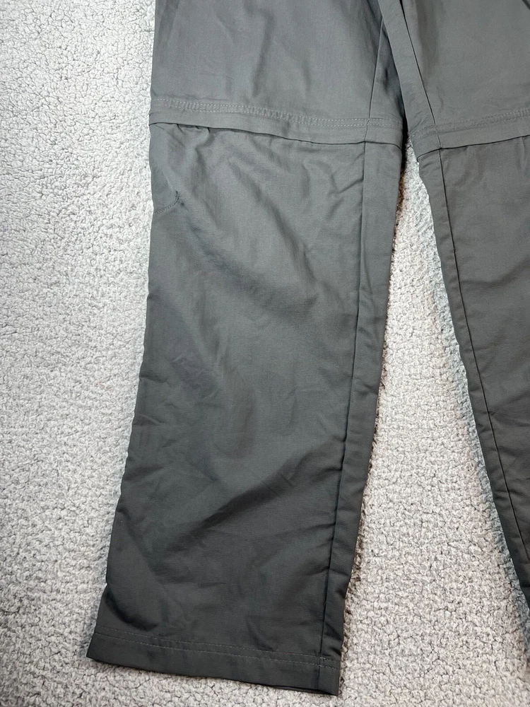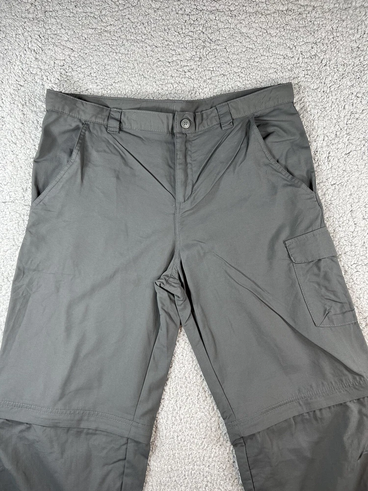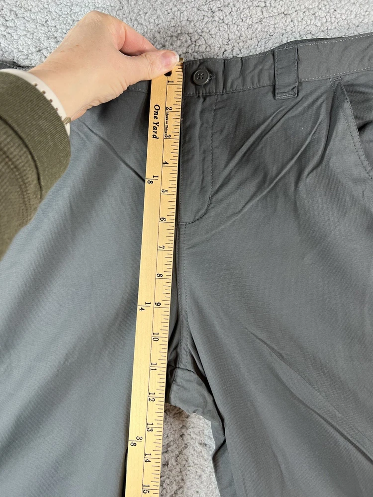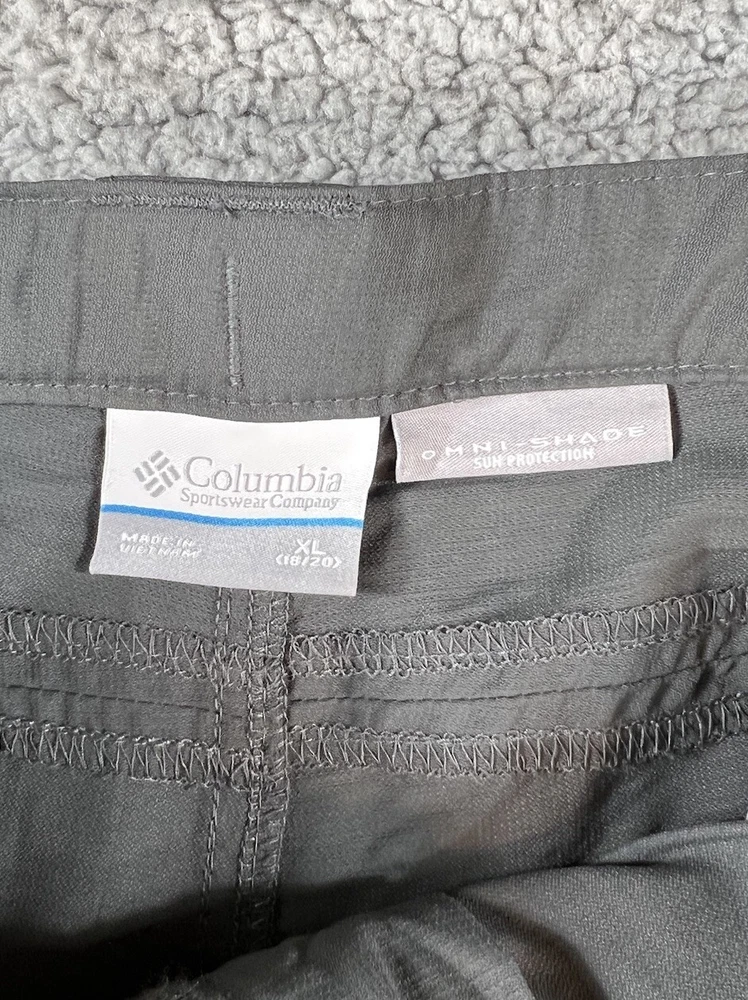 Columbia Gray Convertible Cargo Omni Shade Nylon Hiking Gorpcore Straight Leg Pants. Women's Size XL. Pant leg zips off to convert to shorts. Waistband has adjustable elastic with buttons on inner sides. Beltloops at waistband. 100% nylon material. These pants have 3 pockets. Excellent pre-owned condition. A pproximate measurements: Waist: 16.5 inches flat Rise: 11 inches Inseam: 32 inches Please see measurements as all brands can vary in size.