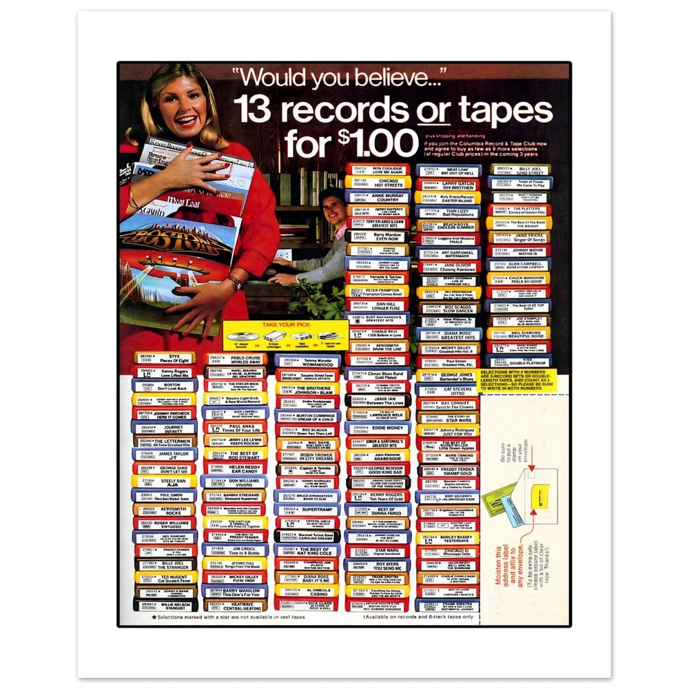 Columbia Record & Tape Club Seventies Retro Advertisement Art Print Poster All retro advertising prints are created using scans of the original ad. As a result, prints may show signs of age and/or wear or other imperfections.One of my favorite parts of growing up in the seventies and eighties was the Columbia Record & Tape club. I joined under every family member in my house and loved having those catalogs show up every month. I love this retro ad featuring 8-track tapes.• Digitally Printed.• Sizes available: 8x10, in. 11x14 in, 12x16 in, 16x20 in 18x24 in.• 16x20 in, 18x24 in• Printed with a matte finish on heavy duty archival paper.• 200 GSM heavy weight paper Columbia Record & Tape Club Seventies Retro Advertisement Art Print Poster All retro advertising prints are created using scans of the original ad. As a result, prints may show signs of age and/or wear or other imperfections. One of my favorite parts of growing up in the seventies and eighties was the Columbia Record & Tape club. I joined under every family member in my house and loved having those catalogs show up every month. I love this retro ad featuring 8-track tapes. • Digitally Printed. • Sizes available: 8x10, in. 11x14 in, 12x16 in, 16x20 in 18x24 in. • 16x20 in, 18x24 in • Printed with a matte finish on heavy duty archival paper. • 200 GSM heavy weight paper × Tell a friend Visit store Watch now Postage info Click the Postage tab above the listing description for more info FREE Postage See more... USPS First Class - $0.00 USPS Priority Mail - $9.95 Click the Postage tab above the listing description for more info! Additional delivery notes PICK UP OPTION Sorry, our items are NOT available for pick-up. PAYING VIA PAYPAL We accept PayPal on our all our items so you can shop with confidence. Simple choose the PayPal option when proceeding through the checkout. Additional Information No additional information at this time Ask seller a question You might also like Peaches Records & Tapes Est. 1975 Record Shop Music Store Men's Unisex T Shirt T Elmore Elmo James 78 RPM Mississippi Delta Blues Trumpet Record Label Men's T Sh Howlin' Wolf Chicago Blues Men's T Shirt Tee Opryland USA Amusement Park Nashville Retro Unisex T-Shirt Tee Contact To contact our Customer Service Team, simply click the button here and our Customer Service team will be happy to assist. Ask seller a question © Mad Apple Shop Postage Shipping is FREE for this item Payment Accepted Payment Methods PayPal Returns Returns are accepted Items must be returned within 30 days of the auction ending Buyer will pay for return shipping. eBay integration by