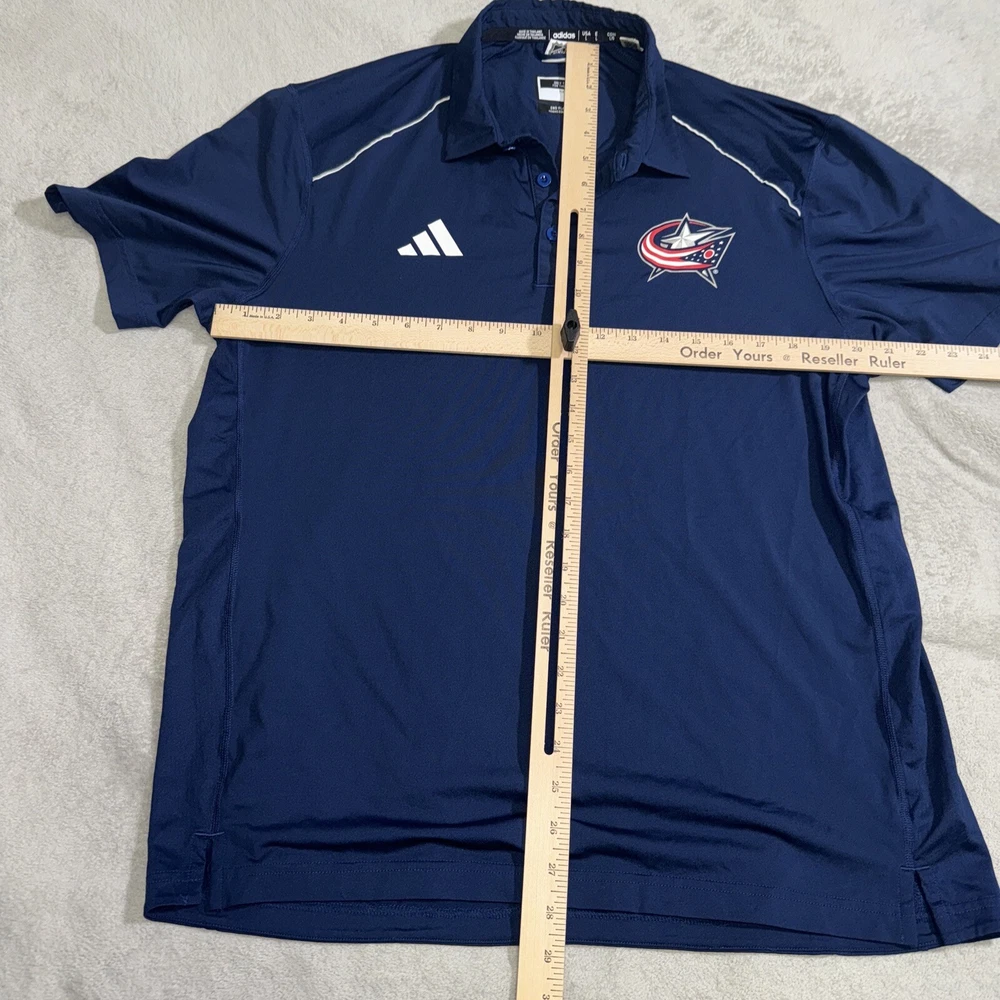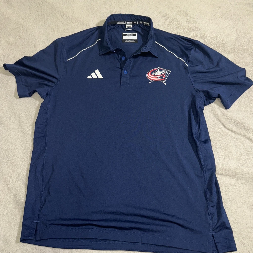 Show your support for the Columbus Blue Jackets with this stylish navy adidas climalite polo. Made for male fans, this polo is perfect for gameday or casual wear. The NHL team's logo is prominently displayed on the chest, while the adidas logo is on the sleeve. The polo is made from high-quality materials and is available in a size large. The navy color is a great addition to any fan's wardrobe. It's the perfect gift for any hockey fan in your life.