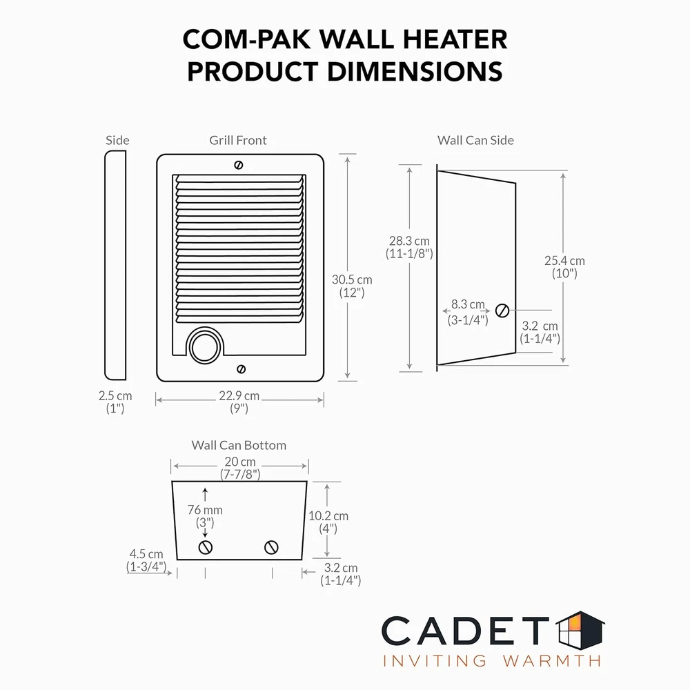 Store New Arrivals Add to Favorite View Feedback Contact Com-Pak Electric Wall Heater Complete Unit with Thermostat (Model: CSC202TW, Part: 67507), 6825/5120 BTU, 240/208 Volt, 2000/1500 Watt, White Description Item model number CSC202TW Style Full Kit Mounting Type Wall Mount Color White Is Discontinued By Manufacturer No Product Dimensions 5.25"D x 14"W x 9.5"H Power Source Corded Electric Heating Method Forced Air Item Weight 705 Pounds Heat Output 2000 Watts Department Unisex-Adult Special Feature Automatic Shut-Off Size 240/208 Volt, 2000/1500 Watt FAST HEATING coil element warms an area up to 200 sq. ft. in a hurry. Ceiling installation is possible with models that are 1,500 watts or less. These models work best at elevations under 10,000 feet EFFICIENT AND QUIET fan spreads the warmth all around REST SAFE AND EASY - safety features turn heater off if normal operating temperatures are exceeded MAXIMIZE LIVING SPACE with the unique compact design which recess mounts discreetly into the wall COMPLETE UNIT includes a wall can, heater, grill, and thermostat for hard-wired installation Built-in Adjustable Thermostat Fan Forced Electric Heater High Gloss Enamel Paint; UL Listed Heater Cut Out Dimensions: 8" W x 10.25" H; Rough In Dimensions: 8" W x 10.25" H x 4" D Wall Can Dimensions: 7.875" W x 11.5" H x 4" D; Grill Dimensions: 9" W x 12" H Cadet Manufacturing Co. White Com Pak Fan Forced Wall Heater 240V, 2000W has an adjustable, built-in thermostat. Wall can, high glass enamel paint grill. Size 12"H x 9"W, UL Listed. ABOUT US We offer the best prices around on high quality products. Our E-store includes media such as books, movies, music and games while offering electronics, toys, sporting apparel, clothing, tools, general home, garden items and more. SHIPPING We are always working hard to ensure your package arrives as soon as possible. Please understand that some factors like weather, high postal traffic, and the performance of shipping companies are outside of our control. We offer free shipping to the lower 48 states and ship within 2 business days of payment, usually sooner. We do not accept P.O. Boxes. Please provide a physical address. For shipping outside of the continental USA, we only use eBay's Global Shipping Program.The item is shipped to KY and then sent to the rest of the world. International customers are responsible for all duties and taxes. Continue to check out in order to calculate costs for shipping the item to your country. Messages regarding eBay's Global Shipping Program MUST be directed at eBay EXCLUSIVELY. RETURNS We offer a 30-Day Return Policy on items which you are not completely satisfied with. You have the option for a full-refund or an exchange of the item. No returns are available on items shipped outside of the USA. PAYMENT We accept PayPal. CONTACT US This page content is yet to come Please ad us to your favorite seller and visit again later Thank You CUSTOMER SATISFACTION We try our very best to make sure every customer is completely satisfied. If there's a problem, message us! We're happy to help. WE ACCEPT Copyright © 2021 AutoDS. | All Rights Reserved