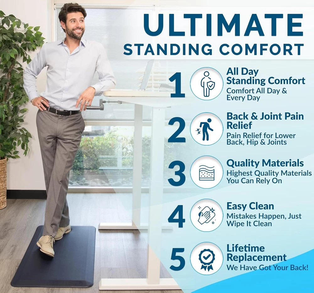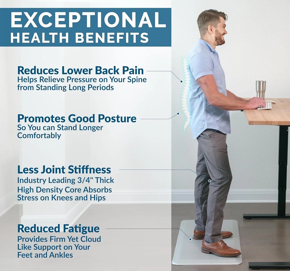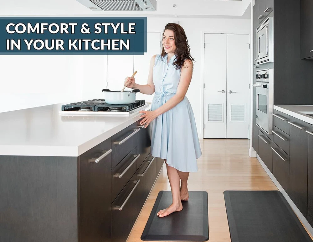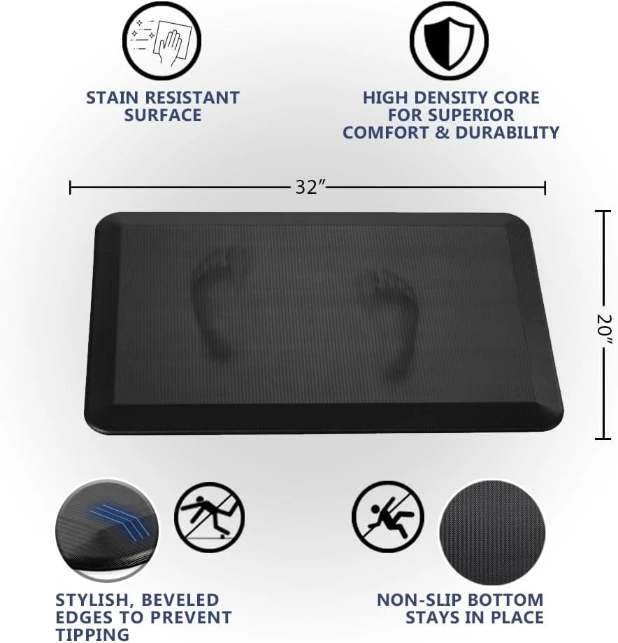 ComfiLife Anti Fatigue Floor Mat – 3/4 Inch Thick 20" x 32", Black Product Details Color: Black Brand: ComfiLife Special Feature: High Density Memory Foam Pattern: Solid Product Care Instructions: Laundry Material Type Free: Latex Free Item Thickness: 19.05 Millimeters Product Dimensions: 32"L x 20"W x 0.75"Th Manufacturer: ComfiLife Number of Items: 1 Item Weight: 3.34 pounds Item model number: 8541943260 Is Discontinued By Manufacturer: No MaterialShape: High Density Memory FoamRectangular Anti Fatigue Mat: ComfiLife kitchen mats for floor enhance comfort while standing. It is professionally engineered and can be used as padded kitchen mat or for your standup desk that will not lose support over time The ComfiLife cushioned mat core is made of 3/4 thick, high-density foam that reduce discomfort on feet, knees, legs, and back while standing for an extended period Multi-use Floor Mat: The ComfiLife standing pad is exceptional for your office while standing at your desk, the kitchen while doing dishes, the laundry room while folding clothes and while working at your workbench Stain Resistant Surface: This ergonomic mat is durable, stain resistant, and easy to clean. Its non-slip bottom enhances safety